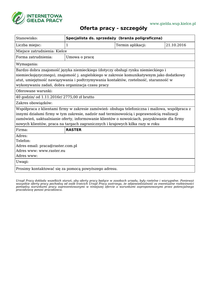 Oferta pracy - szczegóły www.gielda.wup.kielce.pl Stanowisko: Specjalista ds. sprzedaży (branża poligraficzna) Liczba miejsc: 1 Termin aplikacji: 21.10.2016 Miejsce zatrudnienia: Kielce Forma zatrudnienia: Umowa o pracę Wymagania: Bardzo dobra znajomość języka niemieckiego (dotyczy obsługi rynku niemieckiego i niemieckojęzycznego), znajomość j. angielskiego w zakresie komunikatywnym jako dodatkowy atut, umiejętność nawiązywania i podtrzymywania kontaktów, rzetelność, staranność w wykonywaniu zadań, dobra organizacja czasu pracy Oferowane warunki: 40 godzin/ od 1.11.2016r/ 2775,00 zł brutto Zakres obowiązków: Współpraca z klientami firmy w zakresie zamówień- obsługa telefoniczna i mailowa, współpraca z innymi działami firmy w tym zakresie, nadzór nad terminowością i poprawnością realizacji zamówień, uaktualnianie oferty, informowanie klientów o nowościach, pozyskiwanie dla firmy nowych klientów, praca na targach zagranicznych i krajowych kilka razy w roku Firma: RASTER Adres: Telefon: Adres email: [email protected] Adres www: www.raster.eu Adres www: Uwagi: Prosimy kontaktować się za pomocą powyższego adresu. Urząd Pracy dokłada wszelkich starań, aby oferty pracy będące w zasobach urzędu, były rzetelne i wiarygodne. Ponieważ wszystkie oferty pracy pochodzą od osób trzecich Urząd Pracy zastrzega, że odpowiedzialność za ewentualne rozbieżności pomiędzy warunkami pracy zaprezentowanymi w niniejszej ofercie a warunkami zaproponowanymi przez potencjalnego pracodawcę ponosi pracodawca.