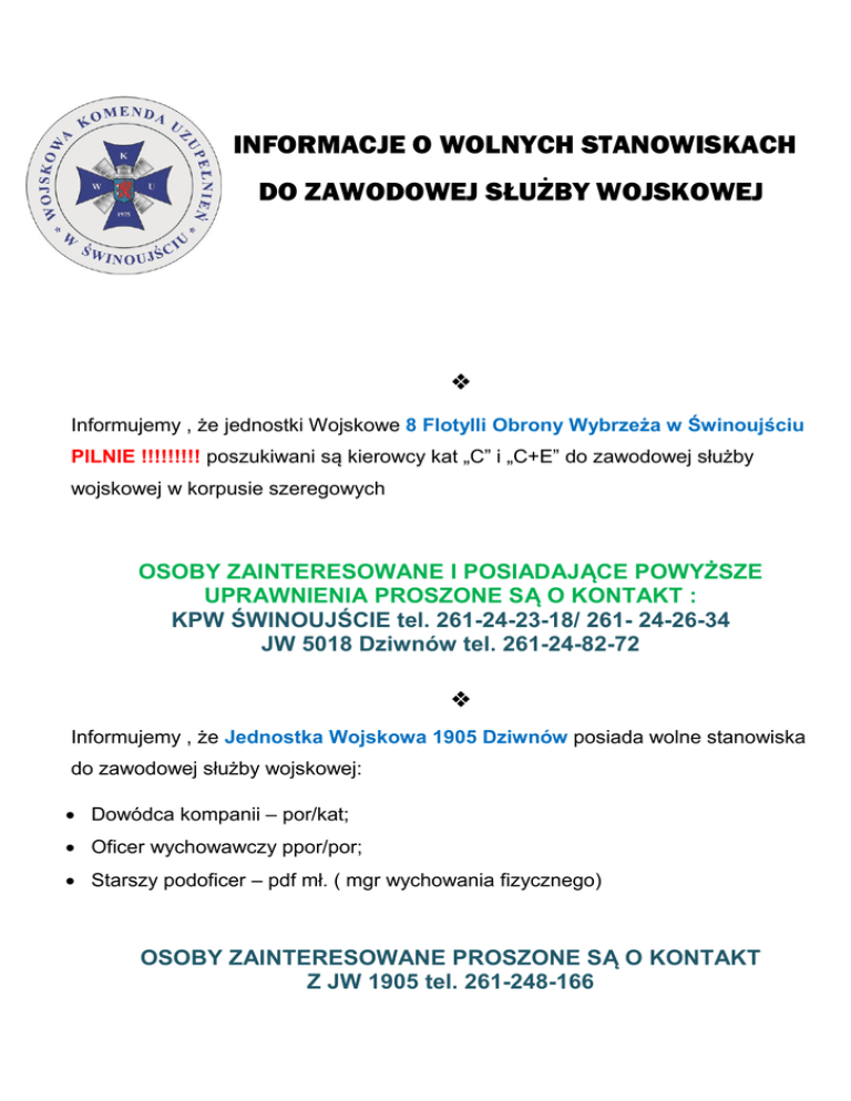 INFORMACJE O WOLNYCH STANOWISKACH DO ZAWODOWEJ SŁUŻBY WOJSKOWEJ Informujemy , że jednostki Wojskowe 8 Flotylli Obrony Wybrzeża w Świnoujściu PILNIE !!!!!!!!! poszukiwani są kierowcy kat „C” i „C+E” do zawodowej służby wojskowej w korpusie szeregowych OSOBY ZAINTERESOWANE I POSIADAJĄCE POWYŻSZE UPRAWNIENIA PROSZONE SĄ O KONTAKT : KPW ŚWINOUJŚCIE tel. 261-24-23-18/ 261- 24-26-34 JW 5018 Dziwnów tel. 261-24-82-72 Informujemy , że Jednostka Wojskowa 1905 Dziwnów posiada wolne stanowiska do zawodowej służby wojskowej: Dowódca kompanii – por/kat; Oficer wychowawczy ppor/por; Starszy podoficer – pdf mł. ( mgr wychowania fizycznego) OSOBY ZAINTERESOWANE PROSZONE SĄ O KONTAKT Z JW 1905 tel. 261-248-166 Informujemy , że Jednostka Wojskowa 2750 Świnoujście posiada wolne stanowiska do zawodowej służby wojskowej: Starszy podoficer sztabowy – sierż/st.sierż/mł.chor.; Zastępca kierownika kancelarii – sierż/st.sierż/mł.chor.; Młodszy podoficer sztabowy – sierż/st.sierż/mł.chor.; Kierownik działu – sierż/st.sierż/mł.chor.; Dowódca grupy – sierż/st.sierż/mł.chor.; Szef działu –dowódca grupy – sierż/st.sierż/mł.chor.; OSOBY ZAINTERESOWANE PROSZONE SĄ O KONTAKT Z JW 2750 tel. 261 242-617 Informujemy , że Jednostka Wojskowa 1749 w SZCZECINIE prowadzi kwalifikacje do zawodowej służby wojskowej w korpusie szeregowych Miejsce kwalifikacji – ul. Wojska Polskiego 250 70-904 SZCZECIN Termin kwalifikacji – każdy wtorek miesiąca o godz. 08:00 SZCZEGÓLNIE POSZUKIWANI KIEROWCY KAT „C” I „C+E” Kandydat na kwalifikacje powinien posiadać: Dowód osobisty, prawo jazdy , książeczkę wojskową Dokumenty potwierdzające posiadane kwalifikacje Zaświadczenie lekarskie potwierdzające możliwość przystąpienia do egzaminu z wychowania fizycznego Strój sportowy Życiorys lub CV Przybory do pisania Żołnierze NSR (kserokopię kontraktu) Informujemy , że w Jednostce Wojskowej 1223 KOSZALIN odbywać się będą kwalifikacje do zawodowej służby wojskowej w korpusie szeregowych: Miejsce kwalifikacji – ul. 4-go Marca 5; 75-901 KOSZALIN Terminy kwalifikacji –09 sierpień 2016r., 06 wrzesień 2016r. , 04 październik 2016r. , 08 listopad 2016r., 06 grudzień 2016r. Kwalifikacje odbywać się będą wyłącznie dla kandydatów posiadających n/w uprawnienia i kwalifikacje : Kierowca ( „C”) Kierowca ( „C+E”) Kierowca elektromechanik ( kierowca kołowego transportera opancerzonego OSA) Operator ( obsługa stacji radiolokacyjnych NUR) Operator ( obsługa stacji radiolokacyjnych wyrywania i naprowadzania rakiet OSA) Kandydat na kwalifikacje powinien posiadać: Dowód osobisty, prawo jazdy , książeczkę wojskową Dokumenty potwierdzające posiadane kwalifikacje Zaświadczenie lekarskie potwierdzające możliwość przystąpienia do egzaminu z wychowania fizycznego Strój sportowy ( odpowiedni do warunków atmosferycznych) Życiorys lub CV Przybory do pisania Żołnierze NSR (kserokopię kontraktu ) BATALION REPREZENTACYJNY WP poszukuje kandydatów do zawodowej służby wojskowej w korpusie szeregowych, kwalifikacje organizowane są w obiekcie przy ul. Franciszka Hynka 2 w Warszawie informacje o terminach i wymaganych dokumentach dostępne są pod adresem: www.brepr.wp.mil.pl w zakładce „ Dołącz do NAS!” Informujemy , że w Jednostce Wojskowej 1198 Glewice k. Goleniowa odbywają się kwalifikacje do zawodowej służby wojskowej w korpusie szeregowych: Miejsce kwalifikacji – Glewice k. Goleniowa ; 72-100 GOLENIÓW Terminy kwalifikacji – każdy pierwszy wtorek miesiąca o godz. 08:00 Kwalifikacje odbywać się będą wyłącznie dla kandydatów posiadających n/w uprawnienia i kwalifikacje : Kierowca ( „C+E”) Obsługa urządzeń i sprzętu przeładunkowego + Kat „C” Obsługa elektrowni bądź pokrewne + Kat „C” Osoby zainteresowane spełniające powyższe kryteria proszone są o kontakt telefoniczny z WKU Świnoujście – 261-24-31-83 wew. 206 Kandydat na kwalifikacje powinien posiadać: Dowód osobisty, prawo jazdy , książeczkę wojskową Dokumenty potwierdzające posiadane kwalifikacje Zaświadczenie lekarskie potwierdzające możliwość przystąpienia do egzaminu z wychowania fizycznego Strój sportowy ( odpowiedni do warunków atmosferycznych) Życiorys lub CV Przybory do pisania Żołnierze NSR (kserokopię kontraktu) Informujemy , że w Jednostce Wojskowej 2901 Szczecin Podjuchy odbywają się kwalifikacje do zawodowej służby wojskowej w korpusie oficerów i szeregowych : Miejsce kwalifikacji – ul. Metalowa 39; 70-727 Szczecin Podjuchy Termin kwalifikacji – każda środa godz. 08:00 szczególnie poszukiwani kandydaci: Korpus oficerów : Oficer sekcji (por/kpt) Oficer łącznikowy tłumacz (por/kpt) Oficer wychowawczy (ppor/por.) Lekarz (ppor/por) Korpus szeregowych : Młodszy operator Młodszy saper kierowca młodszy kierowca – obsługa młodszy kierowca – radiotelefonista kierowca operator młodszy pontonier kierowca operator Kandydat na kwalifikacje powinien posiadać: Dowód osobisty, prawo jazdy , książeczkę wojskową Dokumenty potwierdzające posiadane kwalifikacje Zaświadczenie lekarskie potwierdzające możliwość przystąpienia do egzaminu z wychowania fizycznego Strój sportowy Życiorys lub CV Przybory do pisania Żołnierze NSR (kserokopię kontraktu). Informujemy , że Jednostka Wojskowa 3775 Chojnice posiada wolne stanowiska do zawodowej służby wojskowej w korpusie podoficerów w garnizonie Pruszcz Gryficki, Władysławowo, Darżewo k. Koszalina : POSZUKIWANI KANDYDACI: Samodzielny technik ( sierż/st.sierż/mł.chor.) Młodszy technik (kpr/st.kpr/plut) Starszy operator-kierowca (kpr/st.kpr/plut) Młodszy technik-elektromechanik (kpr/st.kpr/plut) Dowódca aparatowni ( sierż/st.sierż/mł.chor.) Kandydat na kwalifikacje powinien posiadać: Dowód osobisty, prawo jazdy , książeczkę wojskową Dokumenty potwierdzające posiadane kwalifikacje Zaświadczenie lekarski
