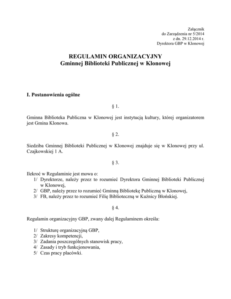 Załącznik do Zarządzenia nr 5/2014 z dn. 29.12.2014 r. Dyrektora GBP w Klonowej REGULAMIN ORGANIZACYJNY Gminnej Biblioteki Publicznej w Klonowej I. Postanowienia ogólne § 1. Gminna Biblioteka Publiczna w Klonowej jest instytucją kultury, której organizatorem jest Gmina Klonowa. § 2. Siedziba Gminnej Biblioteki Publicznej w Klonowej znajduje się w Klonowej przy ul. Czajkowskiej 1 A. § 3. Ilekroć w Regulaminie jest mowa o: 1/ Dyrektorze, należy przez to rozumieć Dyrektora Gminnej Biblioteki Publicznej w Klonowej, 2/ GBP, należy przez to rozumieć Gminną Bibliotekę Publiczną w Klonowej, 3/ FB, należy przez to rozumieć Filię Biblioteczną w Kuźnicy Błońskiej. § 4. Regulamin organizacyjny GBP, zwany dalej Regulaminem określa: 1/ 2/ 3/ 4/ 5/ Strukturę organizacyjną GBP, Zakresy kompetencji, Zadania poszczególnych stanowisk pracy, Zasady i tryb funkcjonowania, Czas pracy placówki. § 5. Gminna Biblioteka Publiczna w Klonowej realizuje zadania z zakresu upowszechniania czytelnictwa i kultury określone w Statucie. II. Struktura organizacyjna § 6. Strukturę organizacyjną GBP tworzą następujące stanowiska: 1/ 2/ 3/ 4/ 5/ Dyrektor, Pracownicy administracji: Główna księgowa, Pracownicy merytoryczni: młodszy bibliotekarz i bibliotekarz, Informatyk, Pracownik gospodarczy. § 7. Podziału zadań pomiędzy stanowiska pracy oraz kontroli wykonania zadań realizowanych przez poszczególnych pracowników dokonuje Dyrektor GBP. § 8. Schemat organizacyjny GBP zawiera Załącznik nr 1 do niniejszego Regulaminu. III. Zakresy kompetencji § 9. 1. Dyrektor jest zwierzchnikiem służbowym pracowników GBP. 2. Plan rzeczowo-finansowy podpisuje Dyrektor. 3. Umowy, porozumienia i zgody podpisuje Dyrektor; w sytuacji, gdy wymagają tego przepisy także Główny Księgowy. 4. Dyrektor zapewnia sprawne funkcjonowanie GBP oraz organizację pracy GBP, w tym zakresie nadzoruje działalność poszczególnych stanowisk pracy. 5. W razie nieobecności Dyrektora GBP bieżące decyzje dotyczące działalności GBP podejmuje osoba pisemnie upoważniona przez Dyrektora na czas jego nieobecności. IV. Zadania poszczególnych stanowisk pracy §10. Do zadań Dyrektora GBP należy w szczególności: 1/ kierowanie pracą instytucji, 2/ reprezentowanie instytucji na zewnątrz, 3/ ustalanie głównych kierunków pracy GBP, odpowiadanie za zgodność podejmowanych decyzji z prawem oraz podejmowanie inicjatyw organizacyjnych zmierzających do pełnej realizacji zadań merytorycznych, organizacyjnych i gospodarczo-finansowych instytucji, 4/ nadzorowanie opracowania planów działań, sprawozdań, analiz i informacji z działań merytorycznych i finansowych, 5/ współdziałanie w realizacji zadań informacyjnych i wydawniczych, reprezentowanie instytucji na zewnątrz we współdziałaniu z organizacjami społeczno-kulturalnymi na terenie Gminy, 6/ współpraca z Radą Gminy, Wójtem Gminy oraz jednostkami organizacyjnymi Gminy, 7/ nadzorowanie działalności administracyjno – gospodarczej GBP, 8/ dbanie o właściwe stosunki międzyludzkie w placówce, 9/ wydawanie zarządzeń, instrukcji wewnętrznych i poleceń służbowych, 10/ przygotowywanie stosownych dokumentów (informacje, sprawozdania, projekty uchwał, itp.) i przedkładanie ich Organizatorowi. 11/ systematyczna aktualizacja księgozbioru o nowe pozycje wydawnicze poprzez przygotowanie merytoryczne i prowadzenie procedur zakupu książek, czasopism i innych wydawnictw. §11. Do zadań księgowego GBP należy w szczególności: 1/ zapewnienie prawidłowości, terminowości i zgodności sprawozdań finansowych, 2/ kierowanie rachunkowością GBP, 3/ analizowanie wydatków w stosunku do przyjętego planu finansowego mające na celu niedopuszczenie do przekroczeń, 4/ dekretacje otrzymanych dokumentów finansowych i zatwierdzenie dokumentów księgowych do wypłaty, 5/ przygotowywanie wszelkich pism z zakresu spraw finansowych, 6/ dokonywanie okresowych analiz wykorzystania środków, 7/ prowadzenie księgowości oraz wszelkich urządzeń księgowych. §12. Do zadań informatyka należy w szczególności: 1/ administrowanie siecią komputerową Gminnej Biblioteki Publicznej w Klonowej i Filii Bibliotecznej w Kużnicy Błońskiej, 2/ archiwizowanie danych, 3/ instalacja i aktualizacja oprogramowań funkcjonujących w bibliotece, 4/ usuwanie zgłoszonych usterek sprzętu teleinformatycznego, 5/ inspirowanie i realizacja nowych wdrożeń informatycznych związanych z funkcjonowaniem biblioteki, 6/ tworzenie, rozwijanie i prowadzenie strony internetowej Gminnej Biblioteki Publicznej w Klonowej, 7/ sprawowanie nadzoru nad Biuletynem Informacji Publicznej Gminnej Biblioteki Publicznej w Klonowej, 8/ projektowanie i wykonywanie plakatów, zaproszeń, kart okolicznościowych, dyplomów, 9/ opracowywanie materiałów informacyjnych o działaniach podejmowanych przez bibliotekę, 10/ przygotowywanie i opracowywanie dokumentacji zdjęciowej z pracy biblioteki, 11/ zarządzanie bezpieczeństwem danych i systemów. Opracowywanie, aktualizacja oraz stosowanie zasad ochrony danych i systemów, 12/ kontrolowanie, modyfikacja oraz aktualizacja programów i zabezpieczeń informatycznych, 13/ wprowadzanie i opracowywanie księgozbioru w bibliotecznym systemie komputerowym, 14/ wprowadzanie i opracowywanie prasy w bibliotecznym systemie komputerowym, 15/ systematyczne podnoszenie kwalifikacji zawodowych, uczestniczenie w szkoleniach i kursach. Do zadań pracowników merytorycznych (bibliotekarza i młodszego bibliotekarza) należy w szczególności: 1/ 2/ 3/ 4/ realizowanie zadań ustalonych w planie pracy GBP i FB, udostępnianie zbiorów w wypożyczalni i czytelni GBP i FB, prawidłowa ewidencja czytelników i wypożyczeń w GBP i FB, prowadzenie działalności informacyjnej (informacja rzeczowa, bibliograficzna, biblioteczna) w GBP i FB, 5/ prawidłowa ewidencja i melioracja księgozbioru GBP i FB, 6/ prowadzenie dokumentacji wpływów i ubytków zbiorów b