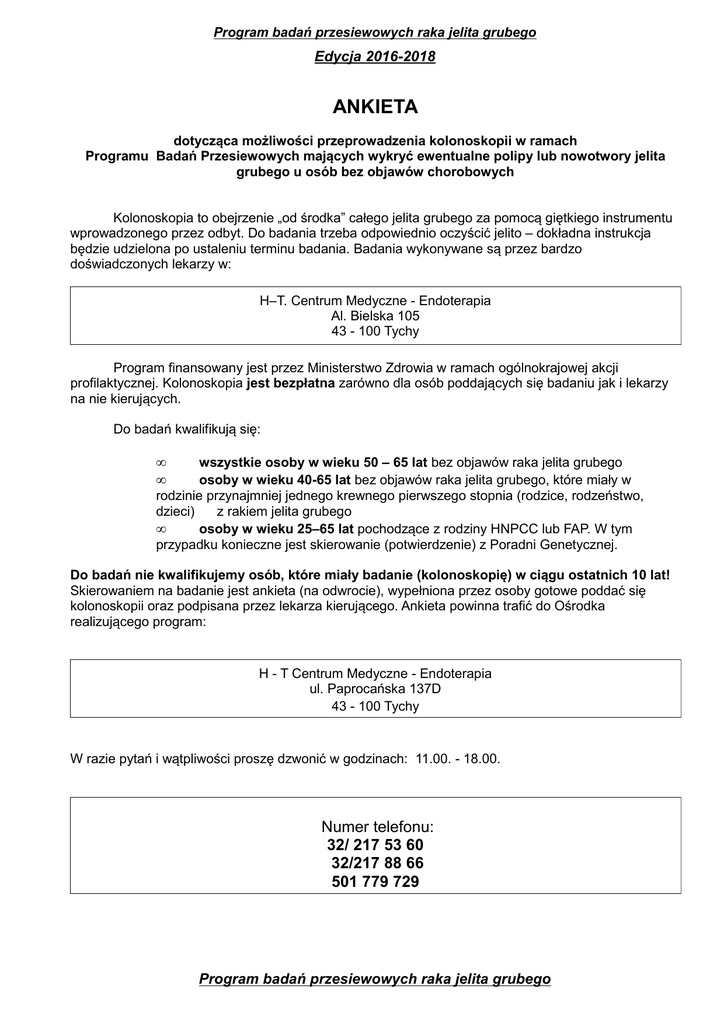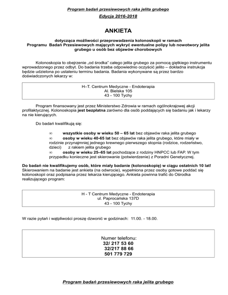Program badań przesiewowych raka jelita grubego Edycja 2016-2018 ANKIETA dotycząca możliwości przeprowadzenia kolonoskopii w ramach Programu Badań Przesiewowych mających wykryć ewentualne polipy lub nowotwory jelita grubego u osób bez objawów chorobowych Kolonoskopia to obejrzenie „od środka” całego jelita grubego za pomocą giętkiego instrumentu wprowadzonego przez odbyt. Do badania trzeba odpowiednio oczyścić jelito – dokładna instrukcja będzie udzielona po ustaleniu terminu badania. Badania wykonywane są przez bardzo doświadczonych lekarzy w: H–T. Centrum Medyczne - Endoterapia Al. Bielska 105 43 - 100 Tychy Program finansowany jest przez Ministerstwo Zdrowia w ramach ogólnokrajowej akcji profilaktycznej. Kolonoskopia jest bezpłatna zarówno dla osób poddających się badaniu jak i lekarzy na nie kierujących. Do badań kwalifikują się: • • wszystkie osoby w wieku 50 – 65 lat bez objawów raka jelita grubego osoby w wieku 40-65 lat bez objawów raka jelita grubego, które miały w rodzinie przynajmniej jednego krewnego pierwszego stopnia (rodzice, rodzeństwo, dzieci) z rakiem jelita grubego • osoby w wieku 25–65 lat pochodzące z rodziny HNPCC lub FAP. W tym przypadku konieczne jest skierowanie (potwierdzenie) z Poradni Genetycznej. Do badań nie kwalifikujemy osób, które miały badanie (kolonoskopię) w ciągu ostatnich 10 lat! Skierowaniem na badanie jest ankieta (na odwrocie), wypełniona przez osoby gotowe poddać się kolonoskopii oraz podpisana przez lekarza kierującego. Ankieta powinna trafić do Ośrodka realizującego program: H - T Centrum Medyczne - Endoterapia ul. Paprocańska 137D 43 - 100 Tychy W razie pytań i wątpliwości proszę dzwonić w godzinach: 11.00. - 18.00. Numer telefonu: 32/ 217 53 60 32/217 88 66 501 779 729 Program badań przesiewowych raka jelita grubego ANKIETA Imię, Nazwisko......................................................................płeć:..... data urodz:.................. PESEL wzrost (cm):.......... waga (kg):............. Adres:....................................................................................................................................... (kod pocztowy, miasto, ulica, nr domu, nr mieszkania) Telefon: dom: .............................................. kom: …….................................... Wyrażam zgodę na wykonanie u mnie kolonoskopii w ramach Programu Badań Przesiewowych. Wyrażam zgodę na przetwarzanie moich danych osobowych dla celów dokumentacji Programu. Data ......................................... Podpis ................................................ Oświadczam, że otrzymałam/em nieodpłatnie preparat do oczyszczenia jelita i zapoznałam/em się z instrukcją do przygotowania do kolonoskopii. Data ......................................... Podpis ................................................ Czy występują u Pana(i) następujące objawy (otoczyć kółkiem właściwą odpowiedź): - obecność krwi w stolcu (jeśli masz hemoroidy zawsze zaznacz NIE) - bez powodu biegunka lub zaparcie w ostatnich kilku miesiącach - chudnięcie lub anemia, których przyczyna nie jest znana Czy miał(a) Pan(i) wykonaną pełną kolonoskopię w ciągu ostatnich 10 lat TAK TAK TAK NIE NIE NIE TAK NIE Uwaga: do PBP kwalifikują się osoby, które na wszystkie powyższe pytania odpowiedziały NIE Dane o krewnych pierwszego stopnia (rodzice, rodzeństwo, dzieci): Czy ktoś z tych krewnych miał nowotwór w obrębie jamy brzusznej? TAK NIE NIE WIEM Jeśli TAK, proszę wypełnić poniższą tabelę: Pokrewieństwo (np. ojciec) Lokalizacja nowotworu (np. odbytnica, żołądek itp, lub nie wiem) Wiek tej osoby, gdy rozpoznano nowotwór (może być orientacyjnie) • Czy rozpoznano u Pana(i) istotne choroby: TAK NIE serca, płuc, nerek, zaburzenia krzepnięcia krwi, itp., jeśli TAK, proszę wymienić: ........................................................................................................................................... • Czy choruje Pan(i) na cukrzycę: TAK NIE Jeśli TAK: typ…..., od ilu lat……..... czy stosuje Pan(i) insulinę? Jeśli TAK, od ilu lat......... TAK NIE • Czy pali Pan(i) papierosy: TAK NIE Jeśli TAK, od ilu lat…….. ile sztuk dziennie…..…. • Czy w przeszłości palił(a) Pan(i) papierosy: TAK NIE Jeśli TAK, ile lat…..…. ile sztuk dziennie…..….od ilu lat nie pali……… • Czy w ciągu ostatnich 5 lat przyjmował(a) Pan(i) przewlekle (co najmniej przez 3 miesiące): - kwas acetylosalicylowy (Acard, Aspiryna) TAK NIE NIE WIEM - jeden z leków: (Polprazol, Controloc, Omeprazol, Lanzul, Helicid, TAK NIE NIE WIEM Omar, Gasec, Ortanol): U kobiet: Czy stosuje (stosowała) Pani hormonalną terapię zastępczą? TAK (ile lat…..) NIE Przebyte operacje brzuszne: .................................................................................................................. Uwagi: ................................................................................................................................................. Stwierdzam, że u danej osoby nie podejrzewam raka jelita grubego (pieczątka + podpis lekarza kierującego) ………………......................…….