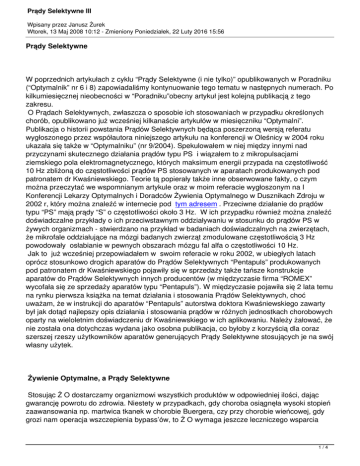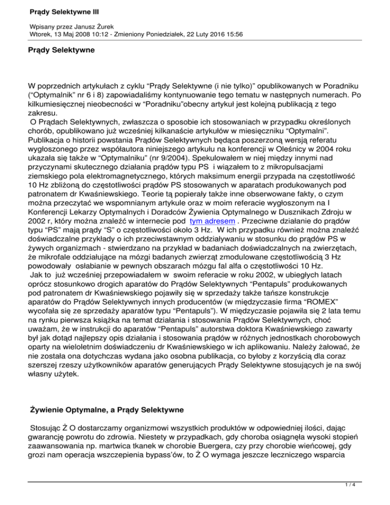 Prądy Selektywne III Wpisany przez Janusz Żurek Wtorek, 13 Maj 2008 10:12 - Zmieniony Poniedziałek, 22 Luty 2016 15:56 Prądy Selektywne W poprzednich artykułach z cyklu “Prądy Selektywne (i nie tylko)” opublikowanych w Poradniku (“Optymalnik” nr 6 i 8) zapowiadaliśmy kontynuowanie tego tematu w następnych numerach. Po kilkumiesięcznej nieobecności w “Poradniku”obecny artykuł jest kolejną publikacją z tego zakresu. O Prądach Selektywnych, zwłaszcza o sposobie ich stosowaniach w przypadku określonych chorób, opublikowano już wcześniej kilkanaście artykułów w miesięczniku “Optymalni”. Publikacja o historii powstania Prądów Selektywnych będąca poszerzoną wersją referatu wygłoszonego przez współautora niniejszego artykułu na konferencji w Oleśnicy w 2004 roku ukazała się także w “Optymalniku” (nr 9/2004). Spekulowałem w niej między innymi nad przyczynami skutecznego działania prądów typu PS i wiązałem to z mikropulsacjami ziemskiego pola elektromagnetycznego, których maksimum energii przypada na częstotliwość 10 Hz zbliżoną do częstotliwości prądów PS stosowanych w aparatach produkowanych pod patronatem dr Kwaśniewskiego. Teorie tą popierały także inne obserwowane fakty, o czym można przeczytać we wspomnianym artykule oraz w moim referacie wygłoszonym na I Konferencji Lekarzy Optymalnych i Doradców Żywienia Optymalnego w Dusznikach Zdroju w 2002 r, który można znaleźć w internecie pod tym adresem . Przeciwne działanie do prądów typu “PS” mają prądy “S” o częstotliwości około 3 Hz. W ich przypadku również można znaleźć doświadczalne przykłady o ich przeciwstawnym oddziaływaniu w stosunku do prądów PS w żywych organizmach - stwierdzano na przykład w badaniach doświadczalnych na zwierzętach, że mikrofale oddziałujące na mózgi badanych zwierząt zmodulowane częstotliwością 3 Hz powodowały osłabianie w pewnych obszarach mózgu fal alfa o częstotliwości 10 Hz. Jak to już wcześniej przepowiadałem w swoim referacie w roku 2002, w ubiegłych latach oprócz stosunkowo drogich aparatów do Prądów Selektywnych “Pentapuls” produkowanych pod patronatem dr Kwaśniewskiego pojawiły się w sprzedaży także tańsze konstrukcje aparatów do Prądów Selektywnych innych producentów (w międzyczasie firma “ROMEX” wycofała się ze sprzedaży aparatów typu “Pentapuls”). W międzyczasie pojawiła się 2 lata temu na rynku pierwsza książka na temat działania i stosowania Prądów Selektywnych, choć uważam, że w instrukcji do aparatów “Pentapuls” autorstwa doktora Kwaśniewskiego zawarty był jak dotąd najlepszy opis działania i stosowania prądów w różnych jednostkach chorobowych oparty na wieloletnim doświadczeniu dr Kwaśniewskiego w ich aplikowaniu. Należy żałować, że nie została ona dotychczas wydana jako osobna publikacja, co byłoby z korzyścią dla coraz szerszej rzeszy użytkowników aparatów generujących Prądy Selektywne stosujących je na swój własny użytek. Żywienie Optymalne, a Prądy Selektywne Stosując Ż O dostarczamy organizmowi wszystkich produktów w odpowiedniej ilości, dając gwarancję powrotu do zdrowia. Niestety w przypadkach, gdy choroba osiągnęła wysoki stopień zaawansowania np. martwica tkanek w chorobie Buergera, czy przy chorobie wieńcowej, gdy grozi nam operacja wszczepienia bypass’ów, to Ż O wymaga jeszcze leczniczego wsparcia 1/4 Prądy Selektywne III Wpisany przez Janusz Żurek Wtorek, 13 Maj 2008 10:12 - Zmieniony Poniedziałek, 22 Luty 2016 15:56 Prądami Selektywnymi. Prądy Selektywne, w zależności od rodzaju i obszaru na które są stosowane, wpływają bezpośrednio na mięśnie prążkowane, na mięśnie gładkie, na naczynia krwionośne, tętnice i żyły oraz na naczynia chłonne, na nerwy obwodowe, na centralny układ nerwowy i na układ wegetatywny. Najważniejsze jednak jest ich działanie na układ wegetatywny. Układ wegetatywny bezpośrednio lub pośrednio zarządza wszystkimi czynnościami komórek, tkanek i narządów w całym organizmie. 2/4 Prądy Selektywne III Wpisany przez Janusz Żurek Wtorek, 13 Maj 2008 10:12 - Zmieniony Poniedziałek, 22 Luty 2016 15:56 prawa mózgowych. Rys. 1.strona Schemat Rysunek rysunku, autonomicznego zaczerpnięto sympatyczny układu zmoże -operacji książki lewa. nerwowego. Liczby Claude rzymskie A. Układ Ville odnoszą Biologia parasympatyczny się Warszawa do nerwów przedstawia 1990 niezależne parasymaptycznego. kręgowego. piersiowo-lędźwiowego dwóch układu ulec “sterowanego” aby powinno są układów powinny narządach odżywianie), komórek, zaburzeniami nadmiar sympatycznego, obecnych Warte przyczyną prawidłowo osłabieniu odcinków: zauważenia elektrycznego bodźców -przewlekły być się tkanek, dolegliwości. jak od Itętnic znać w powodujące tak prawie w siebie i(za lub w wspomóc czynności którego “okablowanie” sympatycznego szyjnego narządów ich całym pobudzających ich uszkodzeniu, jest wszystkich “okablowania” przebieg “Okablowania” jakiegoś pomocą) odcinka to, organizmie nadmierne w Prądami układu iskutkach oraz krzyżowego. Przyczyną poszczególne urządzenia “podzespołu”. sympatyczne rdzenia chorób. organizmie. co całego lub dany wegetatywnego. Selektywnymi nerwowe; te także kolei “podłączone” układ. kręgowego, organizmu, Zaburzenia Można być (np zaburzenia organy Zaburzenia (nerwy Z osobne Dotyczy okablowania wadliwe powyższego jest powodować przypuszczać, przewodzenie układu Przyczyną ico te aprądów są często sympatyczne) narządy “okablowanie” to polegają jest w “zasilanie” także w zwłaszcza wegetatywnego polach układu W układzie równoznaczne samochodu) obserwowaną można zdrowym zaburzenia do człowieka zaburzeń że na elektromagnetycznych różnych sympatycznego metabolizmu podłączone podobnie przewadze wegetatywnym wyciągnąć parasympat