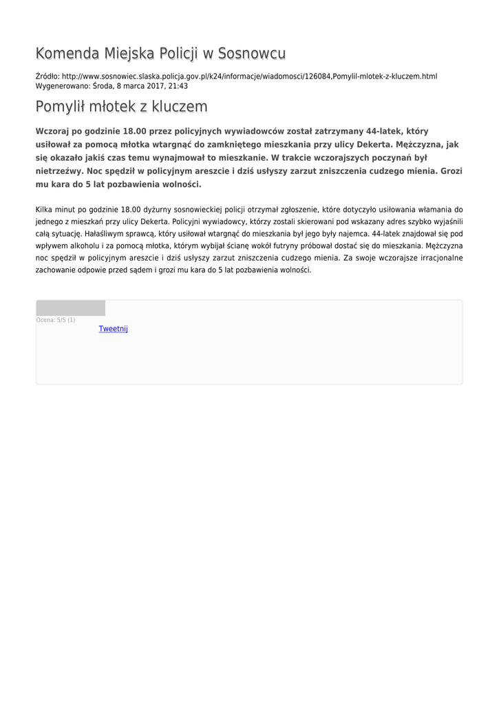 Komenda Miejska Policji w Sosnowcu Źródło: http://www.sosnowiec.slaska.policja.gov.pl/k24/informacje/wiadomosci/126084,Pomylil-mlotek-z-kluczem.html Wygenerowano: Środa, 8 marca 2017, 21:43 Pomylił młotek z kluczem Wczoraj po godzinie 18.00 przez policyjnych wywiadowców został zatrzymany 44-latek, który usiłował za pomocą młotka wtargnąć do zamkniętego mieszkania przy ulicy Dekerta. Mężczyzna, jak się okazało jakiś czas temu wynajmował to mieszkanie. W trakcie wczorajszych poczynań był nietrzeźwy. Noc spędził w policyjnym areszcie i dziś usłyszy zarzut zniszczenia cudzego mienia. Grozi mu kara do 5 lat pozbawienia wolności. Kilka minut po godzinie 18.00 dyżurny sosnowieckiej policji otrzymał zgłoszenie, które dotyczyło usiłowania włamania do jednego z mieszkań przy ulicy Dekerta. Policyjni wywiadowcy, którzy zostali skierowani pod wskazany adres szybko wyjaśnili całą sytuację. Hałaśliwym sprawcą, który usiłował wtargnąć do mieszkania był jego były najemca. 44-latek znajdował się pod wpływem alkoholu i za pomocą młotka, którym wybijał ścianę wokół futryny próbował dostać się do mieszkania. Mężczyzna noc spędził w policyjnym areszcie i dziś usłyszy zarzut zniszczenia cudzego mienia. Za swoje wczorajsze irracjonalne zachowanie odpowie przed sądem i grozi mu kara do 5 lat pozbawienia wolności. Ocena: 5/5 (1) Tweetnij