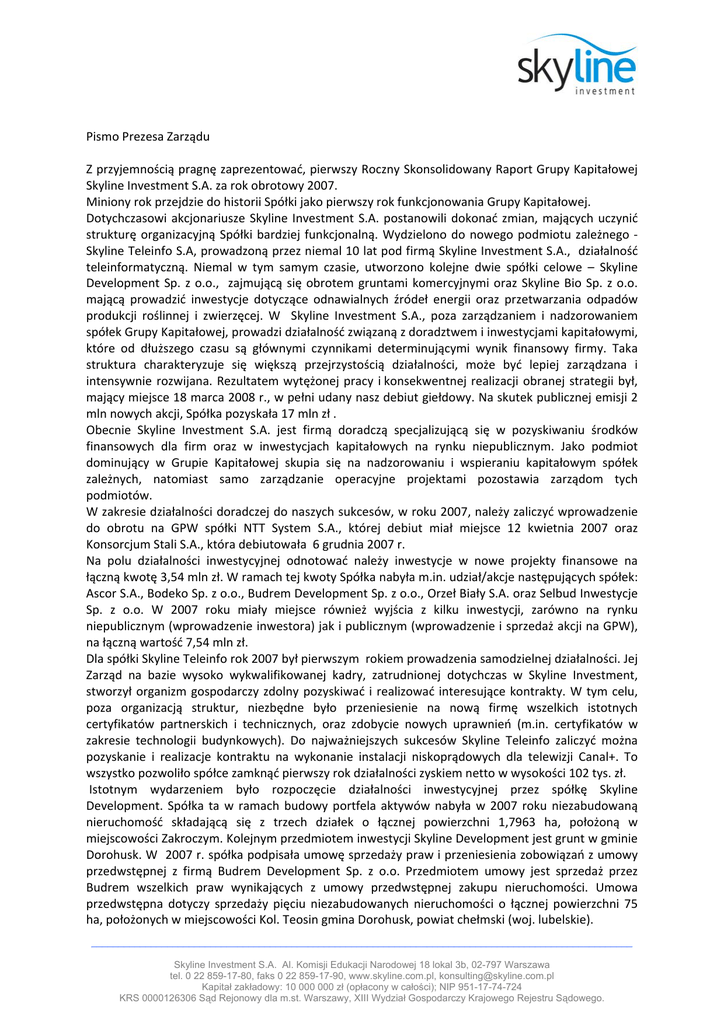 Pismo Prezesa Zarządu Z przyjemnością pragnę zaprezentować, pierwszy Roczny Skonsolidowany Raport Grupy Kapitałowej Skyline Investment S.A. za rok obrotowy 2007. Miniony rok przejdzie do historii Spółki jako pierwszy rok funkcjonowania Grupy Kapitałowej. Dotychczasowi akcjonariusze Skyline Investment S.A. postanowili dokonać zmian, mających uczynić strukturę organizacyjną Spółki bardziej funkcjonalną. Wydzielono do nowego podmiotu zależnego ‐ Skyline Teleinfo S.A, prowadzoną przez niemal 10 lat pod firmą Skyline Investment S.A., działalność teleinformatyczną. Niemal w tym samym czasie, utworzono kolejne dwie spółki celowe – Skyline Development Sp. z o.o., zajmującą się obrotem gruntami komercyjnymi oraz Skyline Bio Sp. z o.o. mającą prowadzić inwestycje dotyczące odnawialnych źródeł energii oraz przetwarzania odpadów produkcji roślinnej i zwierzęcej. W Skyline Investment S.A., poza zarządzaniem i nadzorowaniem spółek Grupy Kapitałowej, prowadzi działalność związaną z doradztwem i inwestycjami kapitałowymi, które od dłuższego czasu są głównymi czynnikami determinującymi wynik finansowy firmy. Taka struktura charakteryzuje się większą przejrzystością działalności, może być lepiej zarządzana i intensywnie rozwijana. Rezultatem wytężonej pracy i konsekwentnej realizacji obranej strategii był, mający miejsce 18 marca 2008 r., w pełni udany nasz debiut giełdowy. Na skutek publicznej emisji 2 mln nowych akcji, Spółka pozyskała 17 mln zł . Obecnie Skyline Investment S.A. jest firmą doradczą specjalizującą się w pozyskiwaniu środków finansowych dla firm oraz w inwestycjach kapitałowych na rynku niepublicznym. Jako podmiot dominujący w Grupie Kapitałowej skupia się na nadzorowaniu i wspieraniu kapitałowym spółek zależnych, natomiast samo zarządzanie operacyjne projektami pozostawia zarządom tych podmiotów. W zakresie działalności doradczej do naszych sukcesów, w roku 2007, należy zaliczyć wprowadzenie do obrotu na GPW spółki NTT System S.A., której debiut miał miejsce 12 kwietnia 2007 oraz Konsorcjum Stali S.A., która debiutowała 6 grudnia 2007 r. Na polu działalności inwestycyjnej odnotować należy inwestycje w nowe projekty finansowe na łączną kwotę 3,54 mln zł. W ramach tej kwoty Spółka nabyła m.in. udział/akcje następujących spółek: Ascor S.A., Bodeko Sp. z o.o., Budrem Development Sp. z o.o., Orzeł Biały S.A. oraz Selbud Inwestycje Sp. z o.o. W 2007 roku miały miejsce również wyjścia z kilku inwestycji, zarówno na rynku niepublicznym (wprowadzenie inwestora) jak i publicznym (wprowadzenie i sprzedaż akcji na GPW), na łączną wartość 7,54 mln zł. Dla spółki Skyline Teleinfo rok 2007 był pierwszym rokiem prowadzenia samodzielnej działalności. Jej Zarząd na bazie wysoko wykwalifikowanej kadry, zatrudnionej dotychczas w Skyline Investment, stworzył organizm gospodarczy zdolny pozyskiwać i realizować interesujące kontrakty. W tym celu, poza organizacją struktur, niezbędne było przeniesienie na nową firmę wszelkich istotnych certyfikatów partnerskich i technicznych, oraz zdobycie nowych uprawnień (m.in. certyfikatów w zakresie technologii budynkowych). Do najważniejszych sukcesów Skyline Teleinfo zaliczyć można pozyskanie i realizacje kontraktu na wykonanie instalacji niskoprądowych dla telewizji Canal+. To wszystko pozwoliło spółce zamknąć pierwszy rok działalności zyskiem netto w wysokości 102 tys. zł. Istotnym wydarzeniem było rozpoczęcie działalności inwestycyjnej przez spółkę Skyline Development. Spółka ta w ramach budowy portfela aktywów nabyła w 2007 roku niezabudowaną nieruchomość składającą się z trzech działek o łącznej powierzchni 1,7963 ha, położoną w miejscowości Zakroczym. Kolejnym przedmiotem inwestycji Skyline Development jest grunt w gminie Dorohusk. W 2007 r. spółka podpisała umowę sprzedaży praw i przeniesienia zobowiązań z umowy przedwstępnej z firmą Budrem Development Sp. z o.o. Przedmiotem umowy jest sprzedaż przez Budrem wszelkich praw wynikających z umowy przedwstępnej zakupu nieruchomości. Umowa przedwstępna dotyczy sprzedaży pięciu niezabudowanych nieruchomości o łącznej powierzchni 75 ha, położonych w miejscowości Kol. Teosin gmina Dorohusk, powiat chełmski (woj. lubelskie). ____________________________________________________________________________________________________ Skyline Investment S.A. Al. Komisji Edukacji Narodowej 18 lokal 3b, 02-797 Warszawa tel. 0 22 859-17-80, faks 0 22 859-17-90, www.skyline.com.pl, [email protected] Kapitał zakładowy: 10 000 000 zł (opłacony w całości); NIP 951-17-74-724 KRS 0000126306 Sąd Rejonowy dla m.st. Warszawy, XIII Wydział Gospodarczy Krajowego Rejestru Sądowego. W efekcie tych działań Grupa Kapitałowa Skyline Investment S.A. w roku obrotowym 2007 osiągnęła rekordowo wysoki wynik netto, zamykający się kwotą 32,5 mln zł, blisko czterokrotnie wyższą niż wynik Skyline Investment w roku poprzednim. Pozwoliło to na wzrost wartości kapitału własnego Spółki z 16,7 mln zł do 50,7 mln zł. W roku 2008 Zarząd Skyline Investment będzie kontynuował strategię rozwoju Grupy Kapitałowej. Pragnę zapewnić, że dołożymy wszelkich starań aby kolejne projekty inwestycyjne pozwoliły na znaczący wzrost wartości naszych aktywów, a zaufanie, którym Państwo obdarzyliście Spółkę i Zarząd, dało wymierny, pozytywny efekt finansowy. Z wyrazami szacunku Jerzy Rey Prezes Zarządu Skyline Investment S.A. Warszawa, 28 lipca 2008 r. ____________________________________________________________________________________________________ Skyline Investment S.A. Al. Komisji Edukacji Narodowej 18 lokal 3b, 02-797 Warszawa tel. 0 22 859-17-80, faks 0 22 859-17-90, www.skyline.com.pl, [email protected] Kapitał zakładowy: 10 000 000 zł (opłacony w całości); NIP 951-17-74-724 KRS 0000126306 Sąd Rejonowy
