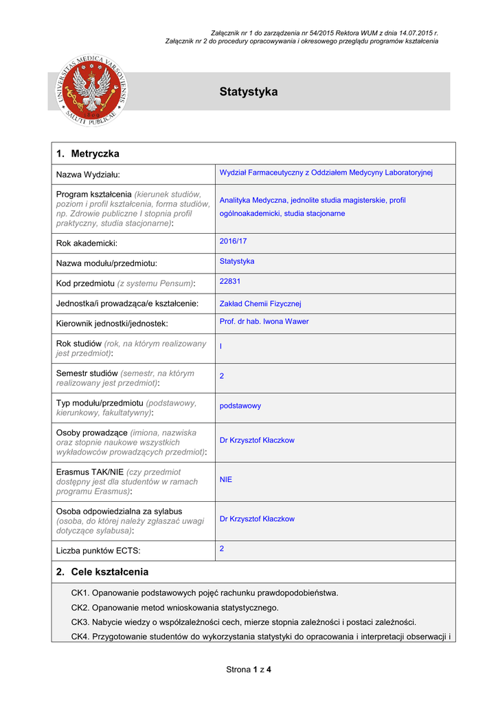 Załącznik nr 1 do zarządzenia nr 54/2015 Rektora WUM z dnia 14.07.2015 r. Załącznik nr 2 do procedury opracowywania i okresowego przeglądu programów kształcenia Statystyka 1. Metryczka Nazwa Wydziału: Program kształcenia (kierunek studiów, poziom i profil kształcenia, forma studiów, np. Zdrowie publiczne I stopnia profil praktyczny, studia stacjonarne): Wydział Farmaceutyczny z Oddziałem Medycyny Laboratoryjnej Analityka Medyczna, jednolite studia magisterskie, profil ogólnoakademicki, studia stacjonarne Rok akademicki: 2016/17 Nazwa modułu/przedmiotu: Statystyka Kod przedmiotu (z systemu Pensum): 22831 Jednostka/i prowadząca/e kształcenie: Zakład Chemii Fizycznej Kierownik jednostki/jednostek: Prof. dr hab. Iwona Wawer Rok studiów (rok, na którym realizowany jest przedmiot): I Semestr studiów (semestr, na którym realizowany jest przedmiot): 2 Typ modułu/przedmiotu (podstawowy, kierunkowy, fakultatywny): podstawowy Osoby prowadzące (imiona, nazwiska oraz stopnie naukowe wszystkich wykładowców prowadzących przedmiot): Dr Krzysztof Kłaczkow Erasmus TAK/NIE (czy przedmiot dostępny jest dla studentów w ramach programu Erasmus): NIE Osoba odpowiedzialna za sylabus (osoba, do której należy zgłaszać uwagi dotyczące sylabusa): Dr Krzysztof Kłaczkow Liczba punktów ECTS: 2 2. Cele kształcenia CK1. Opanowanie podstawowych pojęć rachunku prawdopodobieństwa. CK2. Opanowanie metod wnioskowania statystycznego. CK3. Nabycie wiedzy o współzależności cech, mierze stopnia zależności i postaci zależności. CK4. Przygotowanie studentów do wykorzystania statystyki do opracowania i interpretacji obserwacji i Strona 1 z 4 Załącznik nr 1 do zarządzenia nr 54/2015 Rektora WUM z dnia 14.07.2015 r. Załącznik nr 2 do procedury opracowywania i okresowego przeglądu programów kształcenia pomiarów w praktyce laboratoryjnej. 3. Wymagania wstępne WW1. Zna kombinatorykę i umie ją stosować do obliczania prawdopodobieństwa. WW2. Zna pojęcia matematyki elementarnej i wyższej (funkcje, granice, pochodne, całki). 4. Przedmiotowe efekty kształcenia Lista efektów kształcenia Symbol przedmiotowego efektu kształcenia Treść przedmiotowego efektu kształcenia W1 Zna elementy rachunku prawdopodobieństwa i statystyki. W2 Zna metody testowania hipotez statystycznych oraz znaczenie korelacji i regresji. U1 Zna znaczenie korelacji i regresji, ocenia stopień zależności cech, potrafi wyznaczyć prostą regresji. U2 Stosuje metody statystyczne do opracowania danych z badań oraz wyników obserwacji i pomiarów. Odniesienie do efektu kierunkowego (numer) 5. Formy prowadzonych zajęć Forma Liczba godzin Liczba grup Wykład - - Seminarium 15 3 Ćwiczenia 15 5 Minimalna liczba osób w grupie 6. Tematy zajęć i treści kształcenia C1. Obliczanie prawdopodobieństw z definicji klasycznej, własności prawdopodobieństw. C2. Prawdopodobieństwo warunkowe, zupełne, wzór Bayesa. C3. Zdarzenia niezależne, schemat Bernoulliego. C4. Zmienne losowe skokowe – rozkłady, dystrybuanty, parametry. C5. Zmienne losowe ciągłe – rozkłady, dystrybuanty, parametry. C6. Podstawowe rozkłady: dwumianowy, Poissona, normalny. C7. Rozkłady chi-kwadrat, t-Studenta, F-Fishera. S1. Statystyka opisowa. S2. Wyznaczanie przedziałów ufności dla wartości przeciętnej. Strona 2 z 4 Załącznik nr 1 do zarządzenia nr 54/2015 Rektora WUM z dnia 14.07.2015 r. Załącznik nr 2 do procedury opracowywania i okresowego przeglądu programów kształcenia S3. Wyznaczanie przedziałów ufności dla wariancji i odchylenia standardowego. S4. Testowanie hipotez: test Shapiro-Wilka, testowanie hipotez o wartości przeciętnej. S5. Testowanie hipotez: test o wariancji, test o dwóch wariancjach. S6. Testowanie hipotez: test o dwóch wartościach przeciętnych. S7. Wyznaczanie prostej regresji i analiza statystyczna regresji liniowej prostej. S8. Współczynnik korelacji Pearsona i analiza statystyczna korelacji. 7. Sposoby weryfikacji efektów kształcenia Symbol przedmiotowego efektu kształcenia W1, W2, U1, U2 Symbole form prowadzonych zajęć Sposoby weryfikacji efektu kształcenia Kolokwia, kartkówki C, S Kryterium zaliczenia Suma uzyskanych punktów jest wliczana do ogólnej puli możliwych do zdobycia punktów w ciągu semestru. Kolokwia semestralne z materiału całego semestru są zaliczane po uzyskaniu minimum 50% punktów. 8. Kryteria oceniania Student ma do zdobycia w semestrze 100 punktów: Kolokwium śródsemestralne I - 0-20 pkt. Kolokwium śródsemestralne II - 0-20 pkt. Kartkówki – 0-10 pkt. Kolokwium semestralne – 0-50 pkt. Forma zaliczenia przedmiotu: zaliczenie na ocenę ocena kryteria 2,0 (ndst) 0-49 pkt. 3,0 (dost) 50-59 pkt. 3,5 (ddb) 60-69 pkt. 4,0 (db) 70-79 pkt. 4,5 (pdb) 80-89 pkt. 5,0 (bdb) 90-100 pkt. 9. Literatura Strona 3 z 4 Załącznik nr 1 do zarządzenia nr 54/2015 Rektora WUM z dnia 14.07.2015 r. Załącznik nr 2 do procedury opracowywania i okresowego przeglądu programów kształcenia Literatura obowiązkowa: 1. Chmaj J.: Statystyka dla Analityki Medycznej – ćwiczenia. Materiały przygotowane do druku zawieszone w internecie. 2. Chmaj J.: Testy statystyczne. Materiały przygotowane do druku zawieszone w internecie. 3. Chmaj J.: Tablice statystyczne. Materiały przygotowane do druku zawieszone w internecie. Literatura uzupełniająca: 1. Daniel W.W.:Biostatistics, John Wiley & Sons, Inc., 9 wyd., 2010 10. Kalkulacja punktów ECTS (1 ECTS = od 25 do 30 godzin pracy studenta) Forma aktywności Liczba godzin Liczba punktów ECTS Godziny kontaktowe z nauczycielem akademickim: Wykład Seminarium 15 Ćwiczenia 15 2 Samodzielna praca studenta (przykładowe formy pracy): W tym polu opisujemy nakład samodzielnej pracy przeciętnego studenta konieczny aby zaliczyć przedmiot. W kalkulacji należy uwzględnić m.in. konieczność przygotowania się do zajęć, wykonania pracy domowych, przygotowania się do zaliczeń itp. Przygotowanie studenta do zajęć 15 Przy
