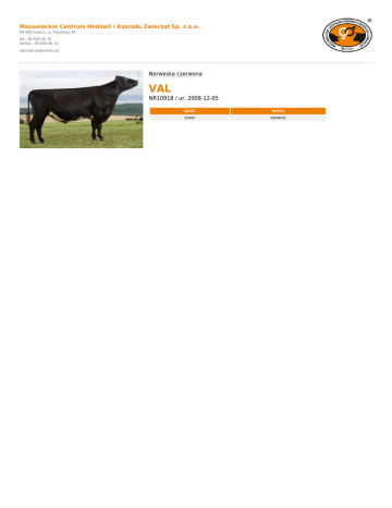Mazowieckie Centrum Hodowli i Rozrodu Zwierząt Sp. z o.o. 99-400 Łowicz, ul. Topolowa 49 tel.: 46 830 06 70 tel/fax.: 46 830 06 72 [email protected] Norweska czerwona VAL NR10918 / ur. 2008-12-05 OJCIEC MATKA SORBY ORRARYD Mazowieckie Centrum Hodowli i Rozrodu Zwierząt Sp. z o.o. w Łowiczu 99-400 Łowicz, ul. Topolowa 49, 99-400 Łowicz, ul. Topolowa 49 tel.: (46) 830 06 70 tel/fax.: (46) 830 06 72, email: [email protected] Strona www: http://www.mchirz.pl/katalog-buhaje/norweska-czerwona/val