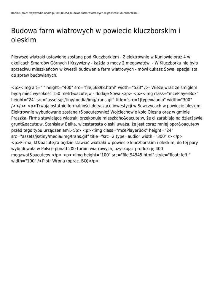 Radio Opole: http://radio.opole.pl/103,88854,budowa-farm-wiatrowych-w-powiecie-kluczborskim-i Budowa farm wiatrowych w powiecie kluczborskim i oleskim Pierwsze wiatraki ustawione zostaną pod Kluczborkiem - 2 elektrownie w Kuniowie oraz 4 w okolicach Smardów Górnych i Krzywizny - każda o mocy 2 megawatów. - W Kluczborku nie było sprzeciwu mieszkańców w kwestii budowania farm wiatrowych - mówi Łukasz Sowa, specjalista do spraw budowlanych. <p><img alt=" " height="400" src="file,56898.html" width="533" />- Wieże wraz ze śmigłem będą mieć wysokość 150 metrów - dodaje Sowa.</p> <p><img class="mcePlayerBox" height="24" src="assets/js/tiny/media/img/trans.gif" title="src=1|type=audio" width="300" /></p> <p>Trwają ostatnie formalności dotyczące inwestycji w Sowczycach w powiecie oleskim. Elektrownie wybudowane zostaną również Wojciechowie koło Olesna oraz w gminie Praszka. Firma stawiająca wiatraki przekonuje mieszkańców, że ci zarabiają na dzierżawie gruntów. Stanisław Belka, wicestarosta oleski uważa, że jest coraz mniej oporów przed tego typu urządzeniami.</p> <p><img class="mcePlayerBox" height="24" src="assets/js/tiny/media/img/trans.gif" title="src=2|type=audio" width="300" /></p> <p>Firma, która będzie stawiać wiatraki w powiecie kluczborskim i oleskim, do tej pory wybudowała w Polsce ponad 200 turbin wiatrowych, uzyskując produkcję 400 megawatów.</p> <p><img height="100" src="file,94945.html" style="float: left;" width="100" />Piotr Wrona (oprac. BO)</p>