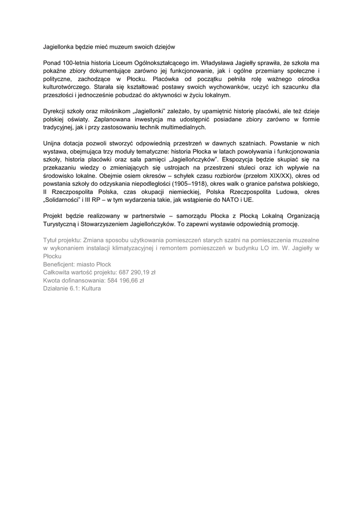 Jagiellonka będzie mieć muzeum swoich dziejów Ponad 100-letnia historia Liceum Ogólnokształcącego im. Władysława Jagiełły sprawiła, że szkoła ma pokaźne zbiory dokumentujące zarówno jej funkcjonowanie, jak i ogólne przemiany społeczne i polityczne, zachodzące w Płocku. Placówka od początku pełniła rolę ważnego ośrodka kulturotwórczego. Starała się kształtować postawy swoich wychowanków, uczyć ich szacunku dla przeszłości i jednocześnie pobudzać do aktywności w życiu lokalnym. Dyrekcji szkoły oraz miłośnikom „Jagiellonki” zależało, by upamiętnić historię placówki, ale też dzieje polskiej oświaty. Zaplanowana inwestycja ma udostępnić posiadane zbiory zarówno w formie tradycyjnej, jak i przy zastosowaniu technik multimedialnych. Unijna dotacja pozwoli stworzyć odpowiednią przestrzeń w dawnych szatniach. Powstanie w nich wystawa, obejmująca trzy moduły tematyczne: historia Płocka w latach powoływania i funkcjonowania szkoły, historia placówki oraz sala pamięci „Jagiellończyków”. Ekspozycja będzie skupiać się na przekazaniu wiedzy o zmieniających się ustrojach na przestrzeni stuleci oraz ich wpływie na środowisko lokalne. Obejmie osiem okresów – schyłek czasu rozbiorów (przełom XIX/XX), okres od powstania szkoły do odzyskania niepodległości (1905–1918), okres walk o granice państwa polskiego, II Rzeczpospolita Polska, czas okupacji niemieckiej, Polska Rzeczpospolita Ludowa, okres „Solidarności” i III RP – w tym wydarzenia takie, jak wstąpienie do NATO i UE. Projekt będzie realizowany w partnerstwie – samorządu Płocka z Płocką Lokalną Organizacją Turystyczną i Stowarzyszeniem Jagiellończyków. To zapewni wystawie odpowiednią promocję. Tytuł projektu: Zmiana sposobu użytkowania pomieszczeń starych szatni na pomieszczenia muzealne w wykonaniem instalacji klimatyzacyjnej i remontem pomieszczeń w budynku LO im. W. Jagiełły w Płocku Beneficjent: miasto Płock Całkowita wartość projektu: 687 290,19 zł Kwota dofinansowania: 584 196,66 zł Działanie 6.1: Kultura