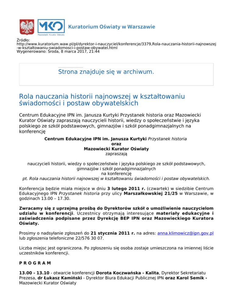 Źródło: http://www.kuratorium.waw.pl/pl/dyrektor-i-nauczyciel/konferencje/3379,Rola-nauczania-historii-najnowszej -w-ksztaltowaniu-swiadomosci-i-postaw-obywatel.html Wygenerowano: Środa, 8 marca 2017, 21:44 Strona znajduje się w archiwum. Rola nauczania historii najnowszej w kształtowaniu świadomości i postaw obywatelskich Centrum Edukacyjne IPN im. Janusza Kurtyki Przystanek historia oraz Mazowiecki Kurator Oświaty zapraszają nauczycieli historii, wiedzy o społeczeństwie i języka polskiego ze szkół podstawowych, gimnazjów i szkół ponadgimnazjalnych na konferencję Centrum Edukacyjne IPN im. Janusza Kurtyki Przystanek historia oraz Mazowiecki Kurator Oświaty zapraszają nauczycieli historii, wiedzy o społeczeństwie i języka polskiego ze szkół podstawowych, gimnazjów i szkół ponadgimnazjalnych na konferencję pt. Rola nauczania historii najnowszej w kształtowaniu świadomości i postaw obywatelskich. Konferencja będzie miała miejsce w dniu 3 lutego 2011 r. (czwartek) w siedzibie Centrum Edukacyjnego IPN Przystanek historia przy ulicy Marszałkowskiej 21/25 w Warszawie, w godzinach 13.00 – 17.30. Zwracamy się z uprzejmą prośbą do Dyrektorów szkół o umożliwienie nauczycielom udziału w konferencji. Uczestnicy otrzymają interesujące materiały edukacyjne i zaświadczenia podpisane przez Dyrekcję BEP IPN oraz Mazowieckiego Kuratora Oświaty. Prosimy o nadsyłanie zgłoszeń do 21 stycznia 2011 r. na adres: [email protected] lub zgłoszenia telefoniczne 22/576 30 07. Liczba miejsc jest ograniczona. Po zgłoszeniu się osoba zostaje umieszczona na imiennej liście uczestników konferencji. PROGRAM 13.00 - 13.10 - otwarcie konferencji Dorota Koczwańska - Kalita, Dyrektor Sekretariatu Prezesa, dr Łukasz Kamiński - Dyrektor Biura Edukacji Publicznej IPN oraz Karol Semik Mazowiecki Kurator Oświaty 13.10 - 13.20 -prezentacja oferty edukacyjnej Centrum Przystanek Historia IPN (m.in. zajęcia dla uczniów, Klub Aktywnego Nauczyciela Historii i WoS, Dzień gracza) 13.20 – 14.30 - Rola nauczania historii najnowszej w kształtowaniu świadomości i postaw obywatelskich - dyskusja panelowa, w której udział wezmą: Karol Semik - Mazowiecki Kurator Oświaty, Włodzimierz Paszyński - Zastępca Prezydenta m.st. Warszawy, Piotr KrólikiewiczZastępca Burmistrza Dzielnicy Śródmieście m.st. Warszawy, Jarosław Zaroń - Dyrektor Mazowieckiego Samorządowego Centrum Doskonalenia Nauczycieli, Arkadiusz Walczak Dyrektor Warszawskiego Centrum Innowacji Edukacyjno - Społecznych i Szkoleń, prof. dr hab. Jolanta Choińska-Mika - Zastępca Dyrektora Instytutu Historycznego UW, Alicja Pacewicz Dyrektor programowy Fundacji Centrum Edukacji Obywatelskiej, prof. Antoni Dudek, prof. Jerzy Eisler, dr Andrzej Zawistowski – Instytut Pamięci Narodowej 14.30 -15.15 - otwarta dyskusja uczestników 15.15 – 15.45 - przerwa na poczęstunek (w przerwie możliwość obejrzenia oferty edukacyjnej instytucji zajmujących się edukacją obywatelską i w obszarze historii najnowszej – BEP IPN, CEO, DSH, MSCDN, ORE, WCIES, ŻIH) 15.45 – 17.30 - zajęcia warsztatowe w trzech grupach (wg poziomów nauczania): Projekt edukacyjny jako interdyscyplinarna metoda nauczania i wykorzystanie metody projektu w nauczaniu historii najnowszej. Prowadzący: Magdalena Bogdan, Anna Klimowicz, Monika Koszyńska, Wiesława Młynarczyk, Kamila Sachnowska, Olga Tumińska. 17.30 - wręczenie zaświadczeń o udziale w konferencji oraz zajęciach warsztatowych Data wytworzenia 11.01.2011 Data publikacji 11.01.2011 Osoba wytwarzająca/odpowiadająca za informację: Agnieszka Wierzchowska Osoba udostępniająca informację: Kamil Żmudziński