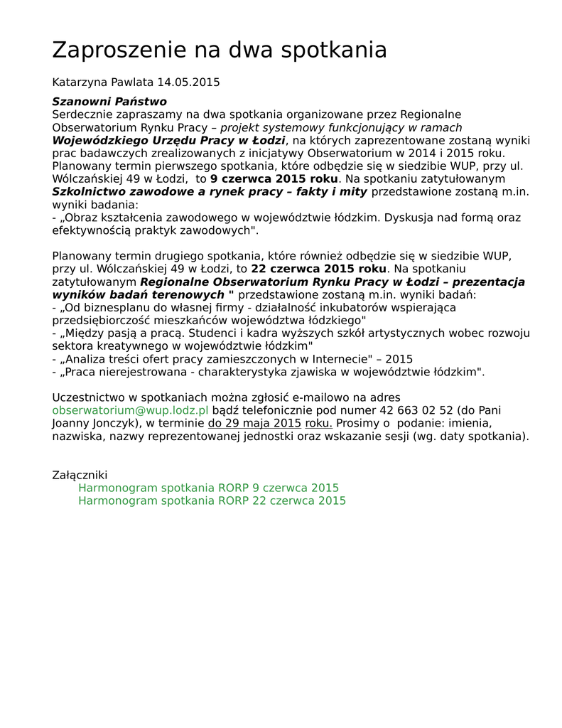Zaproszenie na dwa spotkania Katarzyna Pawlata 14.05.2015 Szanowni Państwo Serdecznie zapraszamy na dwa spotkania organizowane przez Regionalne Obserwatorium Rynku Pracy – projekt systemowy funkcjonujący w ramach Wojewódzkiego Urzędu Pracy w Łodzi, na których zaprezentowane zostaną wyniki prac badawczych zrealizowanych z inicjatywy Obserwatorium w 2014 i 2015 roku. Planowany termin pierwszego spotkania, które odbędzie się w siedzibie WUP, przy ul. Wólczańskiej 49 w Łodzi, to 9 czerwca 2015 roku. Na spotkaniu zatytułowanym Szkolnictwo zawodowe a rynek pracy – fakty i mity przedstawione zostaną m.in. wyniki badania: - „Obraz kształcenia zawodowego w województwie łódzkim. Dyskusja nad formą oraz efektywnością praktyk zawodowych". Planowany termin drugiego spotkania, które również odbędzie się w siedzibie WUP, przy ul. Wólczańskiej 49 w Łodzi, to 22 czerwca 2015 roku. Na spotkaniu zatytułowanym Regionalne Obserwatorium Rynku Pracy w Łodzi – prezentacja wyników badań terenowych " przedstawione zostaną m.in. wyniki badań: - „Od biznesplanu do własnej firmy - działalność inkubatorów wspierająca przedsiębiorczość mieszkańców województwa łódzkiego" - „Między pasją a pracą. Studenci i kadra wyższych szkół artystycznych wobec rozwoju sektora kreatywnego w województwie łódzkim" - „Analiza treści ofert pracy zamieszczonych w Internecie" – 2015 - „Praca nierejestrowana - charakterystyka zjawiska w województwie łódzkim". Uczestnictwo w spotkaniach można zgłosić e-mailowo na adres [email protected] bądź telefonicznie pod numer 42 663 02 52 (do Pani Joanny Jonczyk), w terminie do 29 maja 2015 roku. Prosimy o podanie: imienia, nazwiska, nazwy reprezentowanej jednostki oraz wskazanie sesji (wg. daty spotkania). Załączniki Harmonogram spotkania RORP 9 czerwca 2015 Harmonogram spotkania RORP 22 czerwca 2015