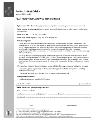 PLAN PRACY DYPLOMOWEJ INśYNIERSKIEJ Tytuł pracy: Moduł wizualizacji przestrzennej wyników pomiarów parametrów sieci radiowych Tytuł pracy w języku angielskim: A module for spatial visualization of radio network performance measurements dr inż. Piotr Korbel Opiekun pracy: Dodatkowy opiekun pracy: mgr inż. Piotr Wawrzyniak Cel i zakres pracy: Celem pracy jest opracowanie narzędzia sieciowego do wizualizacji danych o parametrach sieci komórkowych, np. o mocach sygnałów pochodzących z nadajników stacji bazowych, zbieranych w trybie "crowdsourcingowym" przez użytkowników telefonów komórkowych. Narzędzie powinno umożliwiać wizualizację parametrów sieci w wybranych przez użytkownika obszarach geograficznych. Dodatkowo, narzędzie powinno mieć modułową strukturę w celu umożliwienia jego dalszej rozbudowy. Pierwszy etap pracy obejmuje przegląd parametrów sygnałów radiowych monitorowanych przez terminale sieci komórkowych GSM/UMTS/LTE oraz narzędzi służących do graficznej wizualizacji danych na tle cyfrowych map terenu. Wyniki przeglądu posłużą do wyboru narzędzi, które zostaną wykorzystane do opracowania narzędzia do wizualizacji parametrów sieci gromadzonych w bazach danych. Wymagania w stosunku do studenta (np. znajomość języka programowania lub języka obcego): - znajomość języka angielskiego w stopniu umożliwiającym swobodne korzystanie z literatury naukowo-technicznej; - znajomość baz danych, języka SQL oraz technologii usług sieciowych. Literatura podstawowa: Publikacje dostępne w serwisie IEEEXplore. Łódź, dn. 2014-10-29 (podpis opiekuna) Deklaruję wybór powyŜszego tematu Imię i nazwisko studenta: ............................................................................................................................. nr albumu: ........................ rodzaj studiów1 ....................... kierunek ........................................................... specjalność .................................................................................................................................................... ................................. (data) ..................................................... (podpis studenta) –––––––––––––––––––––––– 1 Wybrać rodzaj studiów stosując oznaczenia jak poniżej: S1 – studia stacjonarne 1-go stopnia, NS1 – studia niestacjonarne 1-go stopnia, S2 – studia stacjonarne 2-go stopnia, NS2 – studia niestacjonarne 2-go stopnia, SM – stacjonarne jednolite magisterskie, SI – stacjonarne inżynierskie, NSI – niestacjonarne inżynierskie, SMU – stacjonarne magisterskie uzupełniające, NSMU – niestacjonarne magisterskie uzupełniające