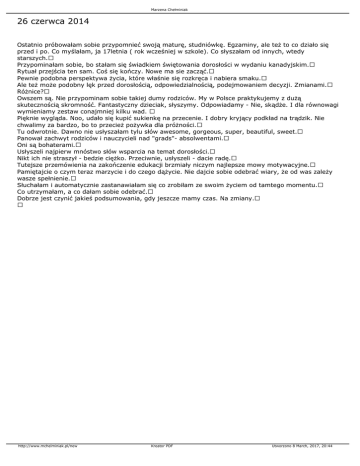 Marzena Chełminiak 26 czerwca 2014 Ostatnio próbowałam sobie przypomnieć swoją maturę, studniówkę. Egzaminy, ale też to co działo się przed i po. Co myślałam, ja 17letnia ( rok wcześniej w szkole). Co słyszałam od innych, wtedy starszych. Przypominałam sobie, bo stałam się świadkiem świętowania dorosłości w wydaniu kanadyjskim. Rytuał przejścia ten sam. Coś się kończy. Nowe ma sie zacząć. Pewnie podobna perspektywa życia, które właśnie się rozkręca i nabiera smaku. Ale też może podobny lęk przed dorosłością, odpowiedzialnością, podejmowaniem decyzji. Zmianami. Różnice? Owszem są. Nie przypominam sobie takiej dumy rodziców. My w Polsce praktykujemy z dużą skutecznością skromność. Fantastyczny dzieciak, słyszymy. Odpowiadamy - Nie, skądże. I dla równowagi wymieniamy zestaw conajmniej kilku wad. Pięknie wygląda. Noo, udało się kupić sukienkę na przecenie. I dobry kryjący podkład na trądzik. Nie chwalimy za bardzo, bo to przecież pożywka dla próżności. Tu odwrotnie. Dawno nie usłyszałam tylu słów awesome, gorgeous, super, beautiful, sweet. Panował zachwyt rodziców i nauczycieli nad "grads"- absolwentami. Oni są bohaterami. Usłyszeli najpierw mnóstwo słów wsparcia na temat dorosłości. Nikt ich nie straszył - bedzie ciężko. Przeciwnie, usłyszeli - dacie radę. Tutejsze przemówienia na zakończenie edukacji brzmiały niczym najlepsze mowy motywacyjne. Pamiętajcie o czym teraz marzycie i do czego dążycie. Nie dajcie sobie odebrać wiary, że od was zależy wasze spełnienie. Słuchałam i automatycznie zastanawiałam się co zrobiłam ze swoim życiem od tamtego momentu. Co utrzymałam, a co dałam sobie odebrać. Dobrze jest czynić jakieś podsumowania, gdy jeszcze mamy czas. Na zmiany. http://www.mchelminiak.pl/new Kreator PDF Utworzono 8 March, 2017, 20:44