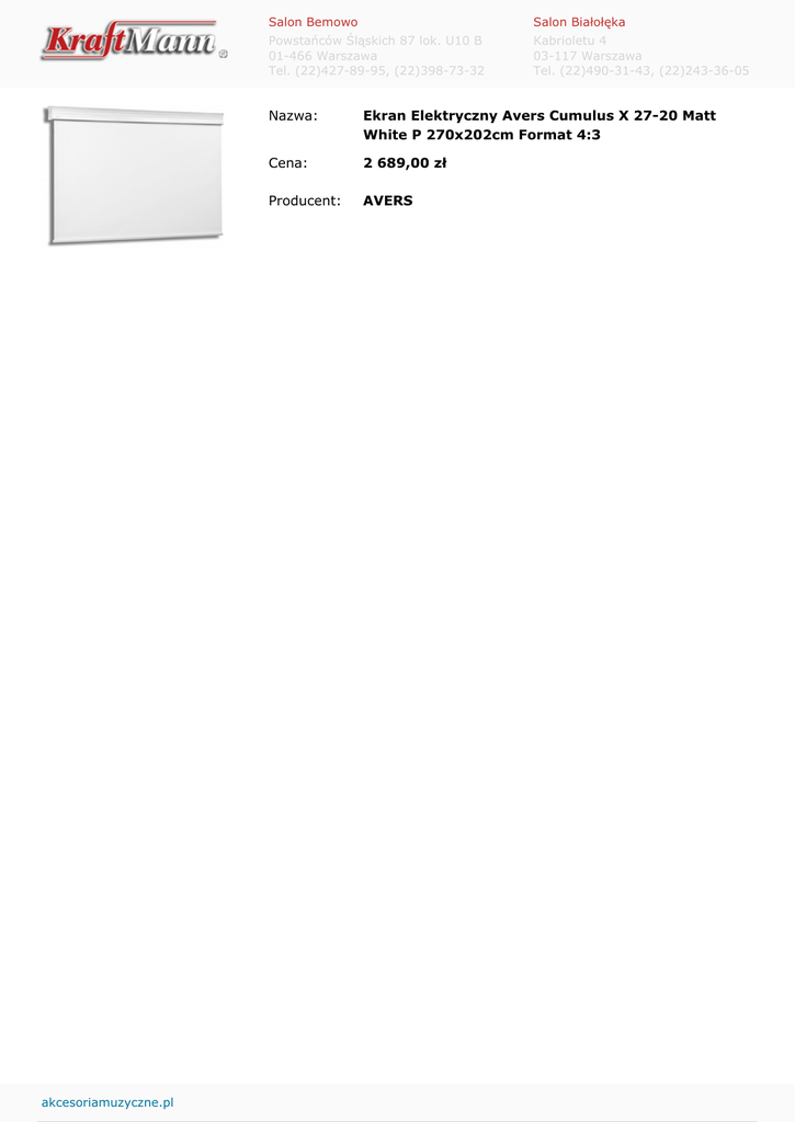 akcesoriamuzyczne.pl Salon Bemowo Salon Białołęka Powstańców Śląskich 87 lok. U10 B 01-466 Warszawa Tel. (22)427-89-95, (22)398-73-32 Kabrioletu 4 03-117 Warszawa Tel. (22)490-31-43, (22)243-36-05 Nazwa: Ekran Elektryczny Avers Cumulus X 27-20 Matt White P 270x202cm Format 4:3 Cena: 2 689,00 zł Producent: AVERS