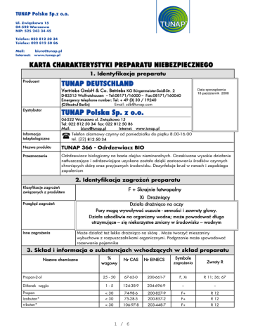 TUNAP Polska Sp.z o.o. Ul. Związkowa 15 04-522 Warszawa NIP: 525 243 34 45 Telefon: 022 812 50 34 Telefax: 022 812 50 86 Mail: Internet: [email protected] www.tunap.pl KARTA CHARAKTERYSTYKI PREPARATU NIEBEZPIECZNEGO 1. Identyfikacja preparatu Producent TUNAP DEUTSCHLAND Vertriebs GmbH & Co. Betriebs KG Bürgermeister-Seidl-Str. 2 Data sporządzenia 18 październik 2008 D-82515 Wolfratshausen -- Tel:08171/16000 -- Fax:08171/160040 Emergency telephone number: Tel: + 49 (0) 30 / 19240 (Giftnotruf Berlin) Email: [email protected] Dystrybutor TUNAP Polska Sp. z o.o. 04-522 Warszawa ul. Związkowa 15 Tel: 022 812 50 34 fax: 022 812 50 86 Mail: [email protected] Internet: www.tunap.pl Informacja toksykologiczna alarmowy czynny od poniedziałku do piątku 8.00-16.00 Telefon tel. (22) 812 50 34 Nazwa produktu TUNAP 366 - Odrdzewiacz BIO Przeznaczenie Odrdzewiacz biologiczny na bazie olejów niemineralnych. Oczekiwane wysokie działanie natłuszczające i odrdzewiające uzyskane zostało dzięki zastosowaniu środków czynnych chroniących skórę oraz przyjaznych środowisku. Dezynfekuje brud w ranach i zapobiega zapaleniom 2. Identyfikacja zagrożeń preparatu Klasyfikacje zagrożeń związanych z produktem F + Skrajnie łatwopalny Xi Drażniący Działa drażniąco na oczy Pary mogą wywoływać uczucie - senności i zawroty głowy. Działa szkodliwie na organizmy wodne; może powodować długo utrzymujące – się niekorzystne zmiany w środowisku – wodnym Przegląd zagrożeń Inne zagrożenia Może działać też lekko drażniąco na skórę . Może tworzyć mieszaniny wybuchowe z rozpuszczalnikami organicznymi. Podgrzanie może spowodować rozerwanie pojemnika 3. Skład i informacja o substancjach wchodzących w skład preparatu % wagowy Nr CAS Nr EINECS 25 - 50 67-63-0 Ditlenek węgla 1-5 Propan Nazwa chemiczna Symbole zagrożenia Zwroty R 200-661-7 F, Xi R 11; 36; 67 124-38-9 204-696-9 -- -- < 30 74-98-6 200-827-9 F+ R 12 Izobutan* < 30 75-28-5 200-857-2 F+ R 12 n-butan* < 30 106-97-8 203-448-7 F+ R 12 Propan-2-ol 1 / 6 Zawiera powyżej 30% węglowodorów alifatycznych * n-Butan zawiera poniżej 0,1% butadienu (numer WE 203-450-8) * Izobutan zawiera poniżej 0,1% butadienu (numer WE 203-450-8) 4. Pierwsza pomoc Spożycie Nie powodować wymiotów. Zasięgnąć porady lekarza . Pokazać kartę charakterystyki Podczas ewentualnych wymiotów trzymać poszkodowanego na boku i pilnować aby się nie zakrztusił. Wdychanie W przypadku narażenia wyprowadzić ( wynieść ) poszkodowanego na świeże powietrze. Zasięgnąć porady lekarza . Zanieczyszczenie oczu Natychmiast wypłukać szeroko otwarte oczy łagodnym strumieniem wody przez minimum 5 minut . Jeżeli podrażnienie nie ustąpi, zasięgnąć porady lekarza. Soczewki kontaktowe wyjąć i umyć. Zanieczyszczenie skóry Umyć dokładnie skórę wodą z mydłem , spłukać. Zmienić zabrudzoną odzież. 5. Postępowanie w przypadku pożaru Środki gaśnicze Niebezpieczne produkty spalania Sprzęt ochronny dla strażaków Porady Dwutlenek węgla, piana , gaśnice proszkowe. Nie stosować silnego strumienia wody - niebezpieczeństwo rozszerzenia pożaru. Używać wody do schładzania okolicznych nie palących się pomieszczeń lub budynków W przypadku termicznego rozkładu lub rozkładu podczas pożaru może tworzyć się gęsty dym, zawierający tlenek węgla i dwutlenek węgla oraz tlenki siarki, ew. sadze. Nie wdychać – wyjść na świeże powietrze. Zaleca się używanie samodzielnego aparatu do oddychania i noszenie ubrań całkowicie chroniących ciało. Zaleca się usunięcie pojemników ze strefy pożaru ( ale bez ryzyka ). Nie zaleca się aby środki gaśnicze dostały się do gleby. Zebrać odpady po pożarze (zużyte środki gaśnicze) . 6. Postępowanie w przypadku niezamierzonego uwolnienia do środowiska Indywidualne środki ostrożności Okulary ochronne, odzież i rękawice ochronne. Procedury w przypadku rozlania lub wycieku Zebrać produkt piaskiem, ziemią okrzemkową (lub innym niepalnym materiałem absorbującym). Zaleca się stosowanie systemów wentylacyjnych. Poczekać aż materiał nasiąknie i umieścić absorbent w odpowiednim pojemniku . Środki ostrożności w zakresie ochrony środowiska Uważać by produkt nie dostał się do gleby, kanalizacji lub wód powierzchniowych. 7. Postępowanie z preparatem i jego magazynowanie Środki ostrożności Należy stosować sprawną wentylację mechaniczną. Wymiana powietrza co najmniej 5 krotna. Nie jeść, nie pić ani nie palić w miejscu pracy. Myć ręce po kontakcie z tym preparatem. Sposób użycia Nanieść preparat na luzowane elementy. Czynność w razie konieczności powtórzyć Środki ochrony podczas magazynowania i wymagane pojemniki Trzymać pojemnik dobrze zamknięty. Nie należy przechowywać z utleniaczami, silnymi kwasami i silnymi zasadami. Przechowywać w chłodnym i suchym miejscu poniżej 20 °C 8. Kontrola narażenia i środki ochrony indywidualnej Kontrola narażenia NDS [ mg/m3] NDSCh [ mg/m3] Propan 1800 28 PN-Z-04252-1:1997 Butan ( n-butan) 1900 3000 PN-Z-04252-1:1997 2 / 6 Metoda oznaczenia Ditlenek węgla 9000 27000 900 1200 Propan-2-ol PN-74/Z-04095/01 lub 02 PN-92/Z-04224/02 Narażenie Należy zainstalować system wentylacji mechanicznej nawiewno-wyciągowej w miejscu pracy i magazynowania. Układ oddechowy Przy prawidłowej wentylacji ( 5-krotna wymiana ) nie potrzeba dodatkowych zabezpieczeń. W przypadku dużego narażenia stosować maski z filtrem AP2P ( EN 141). Oczy Urządzenie do przepłukiwania oczu. Zabezpieczające okulary (EN 166). Skóra Używać rękawic ochronnych np. nitrylowe (EN 374) Ogólne Stosować ochronną odzież. Unikać kontaktu z preparatem. 9. Właściwości fizyczne i chemiczne pH Temperatura wrzenia Temperatura zapłonu Temperatura samozapłonu Dolna granica wybuchowości Górna granica wybuchowości Prężność w 20 °C Stan skupienia Zapach Barwa Rozpuszczalność w wodzie LZO Lepkość Gęstość g/ml w 