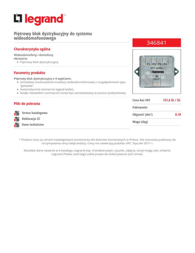 Piętrowy blok dystrybucyjny do systemu wideodomofonowego 346841 Charakterystyka ogólna Wideodomofony i domofony Akcesoria Piętrowy blok dystrybucyjny Parametry produktu Piętrowy blok dystrybucyjny z 4 wyjściami. Umożliwia zrealizowanie instalacji wideodomofonowej z rozgałęzieniami typu ”gwiazda”. Automatycznie wzmacnia sygnał wideo. Dzięki niewielkim rozmiarom może być zainstalowany w puszce podtynkowej. Pliki do pobrania Strona katalogowa Deklaracja CE Dane techniczne Cena bez VAT 131,6 ZŁ / SZ. Pakowanie Objętość (dm³) 0.19 Waga (dag) * Podane ceny są cenami katalogowymi producenta dla klientów biznesowych w Polsce. Nie stanowią podstawy do utrzymywania ceny odsprzedaży. Ceny nie zawierają podatku VAT. Styczeń 2017 r. Wszelkie dane zawarte w e-katalogu Legrand (np. charakterystyki, rysunki, zdjęcia, ceny) mogą ulec zmianie. Legrand Polska zastrzega sobie prawo do dokonywania tych zmian.