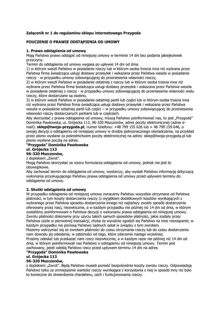 Załącznik nr 1 do regulaminu sklepu internetowego Przygoda POUCZENIE O PRAWIE ODSTĄPIENIA OD UMOWY 1. Prawo odstąpienia od umowy Mają Państwo prawo odstąpić od niniejszej umowy w terminie 14 dni bez podania jakiejkolwiek przyczyny. Termin do odstąpienia od umowy wygasa po upływie 14 dni od dnia: 1) w którym weszli Państwo w posiadanie rzeczy lub w którym osoba trzecia inna niż wybrana przez Państwa firma świadcząca usługi dostawy przesyłek i wskazana przez Państwa weszła w posiadanie rzeczy - w przypadku umowy zobowiązującej do przeniesienia własności rzeczy, 2) w którym weszli Państwo w posiadanie ostatniej z rzeczy lub w którym osoba trzecia inna niż wybrana przez Państwa firma świadcząca usługi dostawy przesyłek i wskazana przez Państwa weszła w posiadanie ostatniej z rzeczy - w przypadku umowy zobowiązującej do przeniesienia własności wielu rzeczy, które dostarczane są osobno, 3) w którym weszli Państwo w posiadanie ostatniej partii lub części lub w którym osoba trzecia inna niż wybrana przez Państwa firma świadcząca usługi dostawy przesyłek i wskazana przez Państwa weszła w posiadanie ostatniej partii lub części – w przypadku umowy zobowiązującej do przeniesienia własności rzeczy dostarczanych partiami lub w częściach. Aby skorzystać z prawa odstąpienia od umowy, muszą Państwo poinformować nas, to jest „Przygoda” Dominika Pawłowska, ul. Grójecka 113, 96-320 Mszczonów, adres poczty elektronicznej (adres email): [email protected], numer telefonu: +48 799 155 626 lub + 48 799 159 646, o swojej decyzji o odstąpieniu od niniejszej umowy w drodze jednoznacznego oświadczenia, na przykład przez pismo wysłane za pośrednictwem poczty elektronicznej na adres: [email protected] lub pismo wysłane pocztą na adres: “Przygoda” Dominika Pawłowska ul. Grójecka 113 96-320 Mszczonów, z dopiskiem „Zwrot”. Mogą Państwo skorzystać ze wzoru formularza odstąpienia od umowy, jednak nie jest to obowiązkowe. Aby zachować termin do odstąpienia od umowy, wystarczy, aby wysłali Państwo informację dotyczącą wykonania przysługującego Państwu prawa odstąpienia od umowy przed upływem terminu do odstąpienia od umowy. 2. Skutki odstąpienia od umowy W przypadku odstąpienia od niniejszej umowy zwracamy Państwu wszystkie otrzymane od Państwa płatności, w tym koszty dostarczenia rzeczy (z wyjątkiem dodatkowych kosztów wynikających z wybranego przez Państwa sposobu dostarczenia innego niż najtańszy zwykły sposób dostarczenia oferowany przez nas), niezwłocznie, a w każdym przypadku nie później niż 14 dni od dnia, w którym zostaliśmy poinformowani o Państwa decyzji o wykonaniu prawa odstąpienia od niniejszej umowy. Zwrotu płatności dokonamy przy użyciu takich samych sposobów płatności, jakie zostały przez Państwa użyte w pierwotnej transakcji, chyba że wyraźnie zgodzili się Państwo na inne rozwiązanie; w każdym przypadku nie poniosą Państwo żadnych opłat w związku z tym zwrotem. Możemy wstrzymać się ze zwrotem płatności do czasu otrzymania rzeczy lub do czasu dostarczenia nam dowodu jej odesłania, w zależności od tego, które zdarzenie nastąpi wcześniej. Prosimy odesłać lub przekazać nam rzecz niezwłocznie, a w każdym razie nie później niż 14 dni od dnia, w którym poinformowali nas Państwo o odstąpieniu od niniejszej umowy. Termin jest zachowany, jeżeli odeślą Państwo rzecz przed upływem terminu 14 dni na adres: “Przygoda” Dominika Pawłowska ul. Grójecka 113 96-320 Mszczonów, z dopiskiem „Zwrot”. Będą Państwo musieli ponieść bezpośrednie koszty zwrotu rzeczy. Odpowiadają Państwo tylko za zmniejszenie wartości rzeczy wynikające z korzystania z niej w sposób inny niż było to konieczne do stwierdzenia charakteru, cech i funkcjonowania rzeczy.