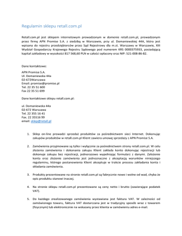 Regulamin sklepu retall.com.pl Retall.com.pl jest sklepem internetowym prowadzonym w domenie retall.com.pl, prowadzonym przez firmę APN Promise S.A. z siedzibą w Warszawie, przy ul. Domaniewskiej 44A, która jest wpisana do rejestru przedsiębiorców przez Sąd Rejestrowy dla m.st. Warszawy w Warszawie, XIII Wydział Gospodarczy Krajowego Rejestru Sądowego pod numerem KRS 0000375933, posiadającą kapitał zakładowy w wysokości 817 568,60 PLN w całości opłacony oraz NIP: 521-008-86-82. Dane kontaktowe: APN Promise S.A. Ul. Domaniewska 44a 02-672Warszawa Email: [email protected] Tel. 22 35 51 600 Fax 22 35 51 699 Dane kontaktowe sklepu retall.com.pl: ul. Domaniewska 44a 02-672 Warszawa Tel. 22 355 16 41 Fax. 22 35516 99 email: [email protected] 1. Sklep on-line prowadzi sprzedaż produktów za pośrednictwem sieci Internet. Dokonując zakupów produktów w retall.com.pl Klient zawiera umowę sprzedaży z APN Promise S.A. 2. Zamówienia przyjmowane są tylko i wyłącznie za pośrednictwem strony retall.com.pl. W celu złożenia zamówienia i dokonania zakupu Klient zakłada konto dokonując rejestracji lub dokonuje zakupu bez rejestracji, jednorazowo wypełniając formularz z danymi. Założenie konta oraz złożenie zamówienia jest jednoznaczne z akceptacją warunków niniejszego regulaminu, którego postanowienia Klient akceptuje w trakcie procesu zakładania konta i składania zamówienia. 3. Produkty prezentowane na stronie retall.com.pl są fabrycznie nowe i wolne od wad, chyba że opis produktu stanowi inaczej. 4. Na stronie sklepu retall.com.pl prezentowane są ceny netto i brutto (zawierające podatek VAT). 5. Do każdego zrealizowanego zamówienia wystawiana jest faktura VAT. W zależności od zamówionego towaru, faktura VAT dostarczana jest w tradycyjny sposób wraz z towarem (fizycznym) lub elektronicznie na wskazany przez klienta w zamówieniu adres e-mail. 6. Doręczeniem przedmiotów zamówienia zajmuje się firma kurierska DHL, z którą firma APN Promise S.A. posiada umowę w tym właśnie zakresie. Cennik dostaw: - DHL po przedpłacie: 14,99 zł brutto* - DHL za pobraniem: 19,99 zł brutto* - Wysyłka elektroniczna: 0 zł * Darmowa wysyłka dla zamówień powyżej 300 zł Koszt dostawy stanowi wyodrębnioną pozycję na fakturze. 7. Złożenie zamówienia z obowiązkiem zapłaty w systemie sprzedaży retall.com.pl, nakłada na klienta obowiązek dokonania płatności za zamówione produkty nie później niż do 14 dni od złożenia zamówienia. W sklepie retall.com.pl dostępne są następujące formy płatności: - Przelew bankowy na podstawie faktury proforma na konto APN Promise S.A. - Płatność online przez serwis PayU 8. Czas dostawy produktów z zamówienia uzależniony jest od dostępności towaru w magazynie APN Promise S.A. oraz Dystrybutorów. Realizacja zamówienia nie może przekraczać 30 dni. W przypadku gdy realizacja może przekroczyć wyżej wymieniony termin, klient informowany jest przez obsługę sklepu o planowanej dacie wysyłki. 9. Wszystkie produkty oferowane na stronie Retall.com.pl mogą posiadać gwarancję. Gwarancja może być udzielona przez producenta, dystrybutora lub sprzedawcę. Szczegółowe warunki realizacji gwarancji określone są w druku gwarancji wystawionym przez gwaranta. Większość produktów posiada gwarancje realizowane bezpośrednio przez autoryzowane punkty serwisowe producentów, których adresy znajdują się na kartach gwarancyjnych. 10. Gwarancja na produkty nie ogranicza rękojmi za wady produktu. 11. Firma APN Promise S.A. odpowiada za wady produktów zgodnie z aktualnie obowiązującymi przepisami prawa. 12. Sprzedaż niebędąca sprzedażą konsumencką, wyłącza przepisy o rękojmi, które zawarte są w Kodeksie Cywilnym. 13. Reklamacje z tytułu rękojmi Klient może złożyć w formie elektronicznej i przesyłając go na adres: [email protected] 14. Koszt odesłania towaru pokrywa Klient. 15. Reklamacja z tytułu rękojmi rozpatrywana jest w terminie 14 dni od otrzymania zgłoszenia od Klienta. 16. Klientowi przysługuje prawo do zwrotu zakupionego towaru bez podania przyczyny w terminie 14 dni od otrzymania zamówionego produktu. Powyższe prawo nie obejmuje produktów i usług, które zgodnie z obowiązującym prawem nie podlegają zwrotowi.* * Prawo odstąpienia od umowy nie ma zastosowania w przypadku umów: - o świadczenie usług, kiedy usługa została wykonana na zlecenie i za zgodą Klienta, - kiedy przedmiotem zamówienia jest rzecz nieprefabrykowania, wyprodukowana wg specyfikacji Klienta lub służąca zaspokojeniu indywidualnych potrzeb Klienta; - w której przedmiotem świadczenia są produkty, które po dostarczeniu do Klienta, ze względu na swój charakter, zostają nierozłącznie połączone z innymi produktami; - kiedy przedmiotem świadczenia są programy komputerowe dostarczane w zapieczętowanym opakowaniu, jeżeli opakowanie zostało otwarte po dostarczeniu; - o dostarczenie treści cyfrowych, które nie są zapisane na nośniku materialnym, jeżeli świadczenie rozpoczęło się za wyraźną zgodą Klienta, przed upływem terminu do odstąpienia od umowy. 17. Informacje znajdujące się na stronie retall.com.pl nie stanowią oferty w rozumieniu Kodeksu Cywilnego. Klient składając zamówienie przez internet na stronie retall.com.pl, składa ofertę kupna określonego produktu na warunkach określonych w zamówieniu oraz akceptuje postanowienia niniejszego regulaminu. 18. APN Promise S.A. zastrzega sobie prawo do wprowadzania zmian do niniejszego regulaminu. 19. W pozostałych kwestiach spornych nieuregulowanych niniejszym regulaminem stosuje się przepisy prawa polskiego. Przykładowy formularz odstąpienia od umowy: Ja ............................................................ informuję o moim odstąpieniu od umowy sprzedaży niżej wymienionych produktów: . ......................................................................................., .......................
