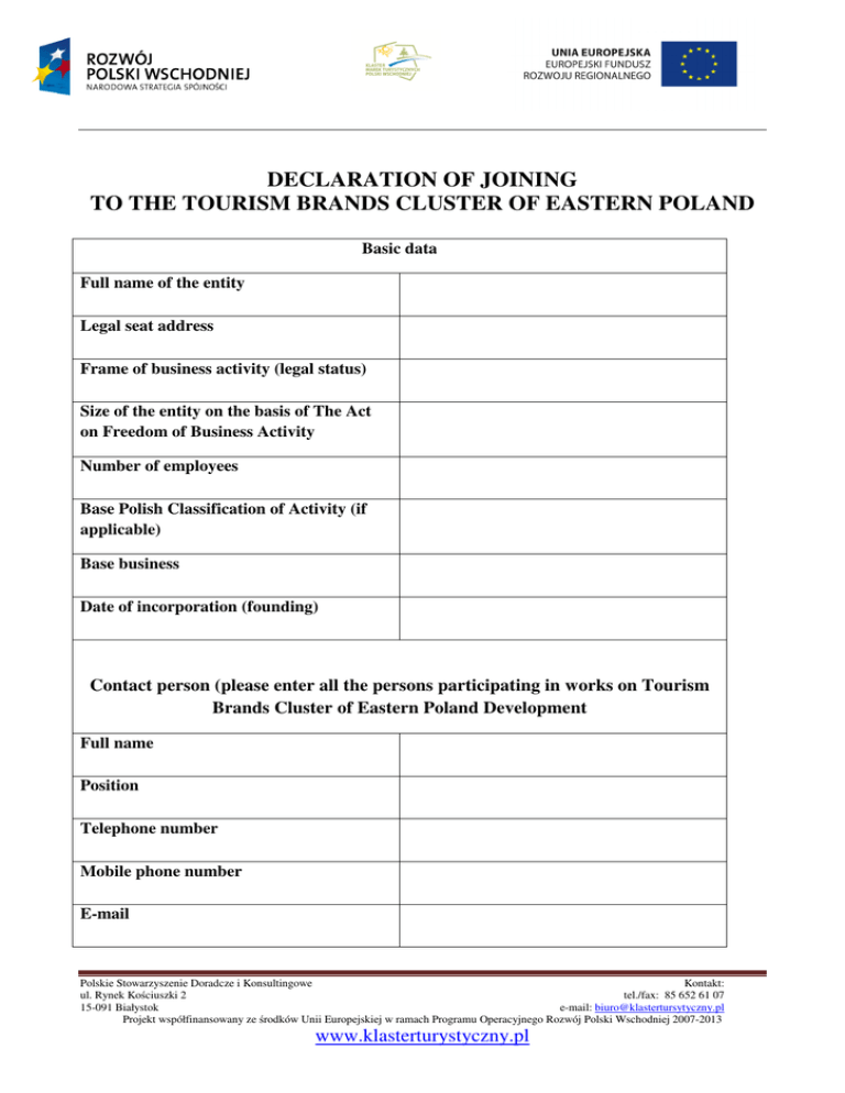 DECLARATION OF JOINING TO THE TOURISM BRANDS CLUSTER OF EASTERN POLAND Basic data Full name of the entity Legal seat address Frame of business activity (legal status) Size of the entity on the basis of The Act on Freedom of Business Activity Number of employees Base Polish Classification of Activity (if applicable) Base business Date of incorporation (founding) Contact person (please enter all the persons participating in works on Tourism Brands Cluster of Eastern Poland Development Full name Position Telephone number Mobile phone number E-mail Polskie Stowarzyszenie Doradcze i Konsultingowe Kontakt: ul. Rynek Kościuszki 2 tel./fax: 85 652 61 07 15-091 Białystok e-mail: [email protected] Projekt współfinansowany ze środków Unii Europejskiej w ramach Programu Operacyjnego Rozwój Polski Wschodniej 2007-2013 www.klasterturystyczny.pl Detailed information Description of entity Entity’s offer (products, services) Clients (e.g. institutions, industry, public administration, uniformed services etc.), business sector Participation in Tourism Brands Cluster of Eastern Poland Development Initial expectations of the entity from the Tourism Brands Cluster of Eastern Poland Polskie Stowarzyszenie Doradcze i Konsultingowe Kontakt: ul. Rynek Kościuszki 2 tel./fax: 85 652 61 07 15-091 Białystok e-mail: [email protected] Projekt współfinansowany ze środków Unii Europejskiej w ramach Programu Operacyjnego Rozwój Polski Wschodniej 2007-2013 www.klasterturystyczny.pl Proposed role of the entity in the Tourism Brands Cluster of Eastern Poland By filling in this form, I hereby agree to: 1. have this data processed for the needs of participation in Tourism Brands Cluster of Eastern Poland 2. make this data accessible to other member entities of the Tourism Brands Cluster of Eastern Poland 3. receive information concerning the Tourism Brands Cluster of Eastern Poland ………………………………………….. Signature of person authorised Polskie Stowarzyszenie Doradcze i Konsultingowe Kontakt: ul. Rynek Kościuszki 2 tel./fax: 85 652 61 07 15-091 Białystok e-mail: [email protected] Projekt współfinansowany ze środków Unii Europejskiej w ramach Programu Operacyjnego Rozwój Polski Wschodniej 2007-2013 www.klasterturystyczny.pl