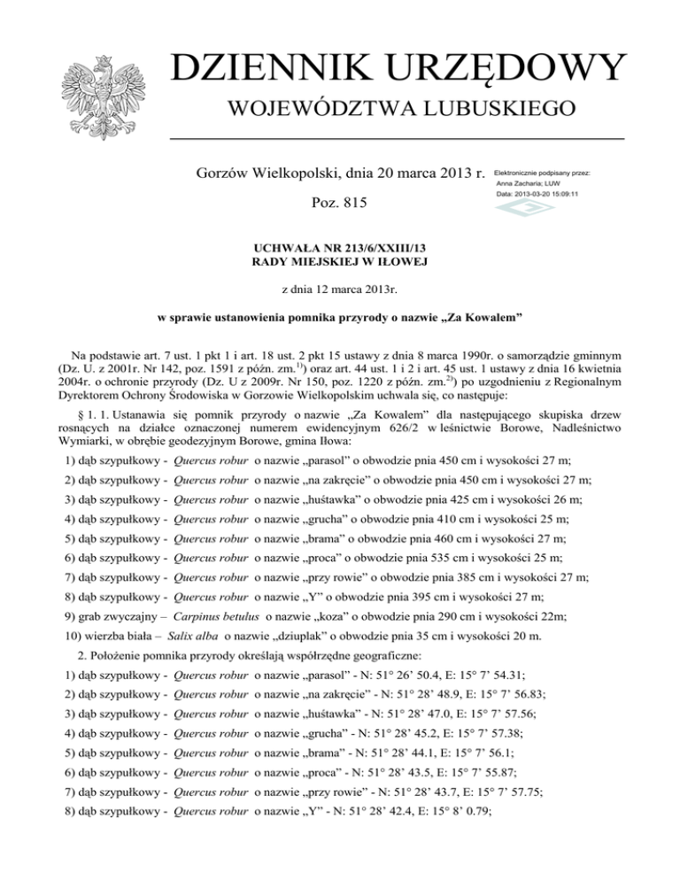 DZIENNIK URZĘDOWY WOJEWÓDZTWA LUBUSKIEGO Gorzów Wielkopolski, dnia 20 marca 2013 r. Elektronicznie podpisany przez: Anna Zacharia; LUW Poz. 815 Data: 2013-03-20 15:09:11 UCHWAŁA NR 213/6/XXIII/13 RADY MIEJSKIEJ W IŁOWEJ z dnia 12 marca 2013r. w sprawie ustanowienia pomnika przyrody o nazwie „Za Kowalem” Na podstawie art. 7 ust. 1 pkt 1 i art. 18 ust. 2 pkt 15 ustawy z dnia 8 marca 1990r. o samorządzie gminnym (Dz. U. z 2001r. Nr 142, poz. 1591 z późn. zm.1)) oraz art. 44 ust. 1 i 2 i art. 45 ust. 1 ustawy z dnia 16 kwietnia 2004r. o ochronie przyrody (Dz. U z 2009r. Nr 150, poz. 1220 z późn. zm.2)) po uzgodnieniu z Regionalnym Dyrektorem Ochrony Środowiska w Gorzowie Wielkopolskim uchwala się, co następuje: § 1. 1. Ustanawia się pomnik przyrody o nazwie „Za Kowalem” dla następującego skupiska drzew rosnących na działce oznaczonej numerem ewidencyjnym 626/2 w leśnictwie Borowe, Nadleśnictwo Wymiarki, w obrębie geodezyjnym Borowe, gmina Iłowa: 1) dąb szypułkowy - Quercus robur o nazwie „parasol” o obwodzie pnia 450 cm i wysokości 27 m; 2) dąb szypułkowy - Quercus robur o nazwie „na zakręcie” o obwodzie pnia 450 cm i wysokości 27 m; 3) dąb szypułkowy - Quercus robur o nazwie „huśtawka” o obwodzie pnia 425 cm i wysokości 26 m; 4) dąb szypułkowy - Quercus robur o nazwie „grucha” o obwodzie pnia 410 cm i wysokości 25 m; 5) dąb szypułkowy - Quercus robur o nazwie „brama” o obwodzie pnia 460 cm i wysokości 27 m; 6) dąb szypułkowy - Quercus robur o nazwie „proca” o obwodzie pnia 535 cm i wysokości 25 m; 7) dąb szypułkowy - Quercus robur o nazwie „przy rowie” o obwodzie pnia 385 cm i wysokości 27 m; 8) dąb szypułkowy - Quercus robur o nazwie „Y” o obwodzie pnia 395 cm i wysokości 27 m; 9) grab zwyczajny – Carpinus betulus o nazwie „koza” o obwodzie pnia 290 cm i wysokości 22m; 10) wierzba biała – Salix alba o nazwie „dziuplak” o obwodzie pnia 35 cm i wysokości 20 m. 2. Położenie pomnika przyrody określają współrzędne geograficzne: 1) dąb szypułkowy - Quercus robur o nazwie „parasol” - N: 51° 26’ 50.4, E: 15° 7’ 54.31; 2) dąb szypułkowy - Quercus robur o nazwie „na zakręcie” - N: 51° 28’ 48.9, E: 15° 7’ 56.83; 3) dąb szypułkowy - Quercus robur o nazwie „huśtawka” - N: 51° 28’ 47.0, E: 15° 7’ 57.56; 4) dąb szypułkowy - Quercus robur o nazwie „grucha” - N: 51° 28’ 45.2, E: 15° 7’ 57.38; 5) dąb szypułkowy - Quercus robur o nazwie „brama” - N: 51° 28’ 44.1, E: 15° 7’ 56.1; 6) dąb szypułkowy - Quercus robur o nazwie „proca” - N: 51° 28’ 43.5, E: 15° 7’ 55.87; 7) dąb szypułkowy - Quercus robur o nazwie „przy rowie” - N: 51° 28’ 43.7, E: 15° 7’ 57.75; 8) dąb szypułkowy - Quercus robur o nazwie „Y” - N: 51° 28’ 42.4, E: 15° 8’ 0.79; Dziennik Urzędowy Województwa Lubuskiego –2– Poz. 815 9) grab zwyczajny – Carpinus betulus o nazwie „koza” - N: 51° 28’ 41.6, E: 15° 8’ 1.5; 10) wierzba biała – Salix alba o nazwie „dziuplak” - N: 51° 28’ 40.6, E: 15° 8’ 1.87. 3. Mapa przedstawiająca położenie pomnika przyrody stanowi załącznik do uchwały. § 2. Celem ochrony pomnika jest zachowanie wartości przyrodniczej i krajobrazowej ze względu na indywidualne cechy wyróżniającego go spośród otaczającego krajobrazu, w szczególności sędziwy wiek i okazałe rozmiary. § 3. W stosunku do pomnika przyrody ustanowionego w § 1, w ramach czynnej ochrony, ustala się: 1) obowiązek stałego monitoringu stanu zdrowotnego pomnika przyrody oraz wykonania zabiegów pielęgnacyjnych i zabezpieczających; 2) wykonania działań w celu utrzymania właściwego stanu pomnika przyrody i realizacji celów ochrony; 3) obowiązek stałego monitoringu oznakowania pomnika przyrody i uzupełniania jego braków. § 4. W stosunku do pomnika przyrody ustanowionego w § 1 zakazuje się: 1) niszczenia, uszkadzania lub przekształcania obiektu; 2) wykonywania prac ziemnych trwale zniekształcających rzeźbę terenu, z wyjątkiem prac związanych z zabezpieczeniem przeciwpowodziowym albo budową, odbudową, utrzymywaniem, remontem lub naprawą urządzeń wodnych; 3) uszkadzania i zanieczyszczania gleby; 4) umieszczania tablic reklamowych. § 5. Nadzór nad pomnikiem przyrody sprawuje Nadleśnictwo Wymiarki. § 6. Wykonanie uchwały powierza się Burmistrzowi Iłowej. § 7. Uchwała wchodzi w życie po upływie 14 dni od dnia ogłoszenia w Dzienniku Urzędowym Województwa Lubuskiego. Przewodniczący Rady Józef Brzezicki Dziennik Urzędowy Województwa Lubuskiego –3– Poz. 815 Załącznik do uchwały Nr 213/6/XXIII/13 Rady Miejskiej w Iłowej z dnia 12 marca 2013r. 1) Zmiany tekstu jednolitego wymienionej ustawy zostały ogłoszone w Dz. U. z 2002r. Nr 23, poz. 220, Nr 62, poz. 558, Nr 113, poz. 984, Nr 153, poz. 1271 i Nr 214, poz. 1806, z 2003r. Nr 80, poz. 717 i Nr 162, poz. 1568, z 2004r. Nr 102, poz. 1055, Nr 116, poz. 1203 i Nr 167, poz. 1759, z 2005r. Nr 172, poz. 1441 i Nr 175, poz. 1457, z 2006r. Nr 17, poz. 128 i Nr 181, poz. 1337, z 2007r. Nr 48, poz. 327, Nr 138, poz. 974 i Nr 173, poz. 1218, z 2008r. Nr 180, poz. 1111 i Nr 223, poz. 1458, z 2009r. Nr 52, poz. 420 i Nr 157, poz. 1241, z 2010r. Nr 28, poz. 142 i 146, Nr 40, poz. 230 i Nr 106, poz. 675, z 2011r. Nr 21, poz. 113, Nr 117, poz. 679, Nr 134, poz. 777, Nr 149, poz. 887 i Nr 217, poz. 1281, z 2012r. poz. 567 oraz z 2013r. poz. 153. 2) Zmiany tekstu jednolitego wymienionej ustawy zostały ogłoszone w Dz. U. z 2009r. Nr 157, poz. 1241 i Nr 215, poz. 1664, z 2010r. Nr 76, poz. 489 i Nr 119, poz. 804, z 2011r. Nr 34, poz. 170, Nr 94, poz. 549, Nr 208, poz. 1241 i Nr 224, poz. 1337, z 2012r. poz. 985 oraz z 2013r. poz. 7, poz. 73 i poz. 165.