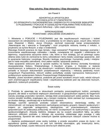 Etap szkolny, Etap dekanalny i Etap diecezjalny Jan Paweł II ADHORTACJA APOSTOLSKA RECONCILIATIO ET PAENITENTIA DO EPISKOPATU DUCHOWIEŃSTWA I WIERNYCH PO SYNODZIE BISKUPÓW O POJEDNANIU I POKUCIE W DZISIEJSZYM POSŁANNICTWIE KOŚCIOŁA (fragment Adhortacji – tylko część pierwsza) WPROWADZENIE POWSTANIE I ZNACZENIE DOKUMENTU 1. Mówienie o POKUCIE I POJEDNANIU jest dla współczesnych mężczyzn i kobiet wezwaniem do odnalezienia na nowo, w przekładzie na ich własny język, owych słów, którymi nasz Zbawiciel i Mistrz, Jezus Chrystus, zechciał rozpocząć swoje przepowiadanie: „Nawracajcie się i wierzcie w Ewangelię”1, czyli przyjmijcie radosną nowinę o miłości, o przybraniu za synów Bożych, a więc o braterstwie. Dlaczego Kościół powraca do tego tematu i tego wezwania? Pragnienie lepszego poznania i zrozumienia współczesnego człowieka i świata, rozwiązania ich zagadki i odsłonięcia ich tajemnicy, rozpoznania zaczynów dobra i zła, które w nich działają, już od pewnego czasu skłania wielu ludzi do zwrócenia ku temu człowiekowi i temu światu uważnego spojrzenia. Jest to spojrzenie historyka i socjologa, filozofa i teologa, psychologa i humanisty, poety i mistyka: jest to nade wszystko zatroskane, choć pełne nadziei, spojrzenie pasterza. Takie spojrzenie widoczne jest w sposób wybitny na każdej stronicy doniosłej Konstytucji duszpasterskiej Soboru Watykańskiego II, Gaudium et spes, o Kościele w świecie współczesnym, a zwłaszcza w jej obszernym i wnikliwym Wprowadzeniu. Widoczne jest ono ponadto w licznych dokumentach podyktowanych mądrością i miłością pasterską moich czcigodnych Poprzedników, których wielkie pontyfikaty zostały naznaczone historycznym i profetycznym wydarzeniem Soboru Powszechnego Watykańskiego II. Niestety, przed wzrokiem pasterza, podobnie jak przed wzrokiem innych ludzi, wśród różnych cech znamionujących współczesny świat i współczesną ludzkość jawi się obecność licznych, głębokich, bolesnych podziałów. Świat rozbity 2. Podziały te ujawniają się w stosunkach pomiędzy poszczególnymi ludźmi, pomiędzy grupami, ale także w wymiarze większych zbiorowości: w gorączkowym dążeniu do hegemonii narody powstają przeciwko narodom, istnieją bloki przeciwstawnych sobie państw. Bez trudu można określić konflikty znajdujące się u korzeni rozdarcia, które zamiast być rozwiązywane na drodze dialogu, zaostrzają się w konfrontacji i sporach. Badając czynniki sprawcze podziału uważni obserwatorzy stwierdzają wielką ich różnorodność: od rosnącej nierówności zachodzącej pomiędzy grupami, klasami społecznymi i krajami po zagorzałe antagonizmy ideologiczne; od przeciwstawnych interesów gospodarczych do polaryzacji politycznej; od różnic szczepowych do dyskryminacji z przyczyn społecznoreligijnych. Zresztą niektóre, dziejące się na oczach wszystkich fakty, są jakby żałosnym obliczem podziału, z którego się wywodzą, odsłaniając jego powagę z całą wyrazistością. Spośród tak wielu bolesnych zjawisk społecznych naszych czasów można tu przypomnieć: — deptanie podstawowych praw osoby ludzkiej, a przede wszystkim prawa do życia i do egzystencji godnej człowieka, co jest tym bardziej oburzające, gdy towarzyszy temu, niespotykana dotąd, czysto retoryczna obrona tych właśnie praw; — zasadzki i naciski stosowane przeciwko wolności jednostek i zbiorowości, nie wyłączając wolności posiadania, wyznawania i praktykowania własnej wiary, która to wolność jest może bardziej naruszana i zagrożona; — różne formy dyskryminacji: rasowej, kulturalnej, religijnej itd.; — przemoc i terroryzm; — stosowanie tortur oraz niesprawiedliwych i bezprawnych form represji; — nagromadzenie broni konwencjonalnej bądź atomowej, wyścig zbrojeń, przy wielkim nakładzie środków, które mogłyby służyć ulżeniu niezawinionej nędzy ludów o niższym poziomie społecznym i ekonomicznym; — niesprawiedliwy podział zasobów świata i dóbr cywilizacji, osiągający swój szczyt w danym modelu organizacji społecznej, który sprawia, że coraz bardziej powiększa się różnica między warunkami życia ludzi bogatych i ludzi biednych2. Przewrotna siła tego podziału czyni ze świata, w którym żyjemy, świat rozbity3 już u samych jego podstaw. Z drugiej strony nie należy się dziwić, że w samej strukturze Kościoła, który nie utożsamiając się ze światem ani nie będąc ze świata, jest jednak wszczepiony w świat i prowadzi dialog ze światem4, dostrzega się echa i znaki podziału, który rani społeczeństwo ludzkie. Poza rozłamami wśród wspólnot chrześcijańskich, nękającymi je od wieków, Kościół dzisiaj w swym łonie tu i ówdzie doświadcza podziałów między składającymi się nań i uzupełniającymi komponentami, które spowodowane są odmiennością spojrzenia lub wyboru na polu doktrynalnym i pastoralnym5. Również te podziały mogą niekiedy wydawać się nieuleczalne. Jakkolwiek rozdarcia te wywołują wrażenie już na pierwszy rzut oka, to jednak tylko sięgając w głąb można wyodrębnić ich przyczynę: tkwi ona w wewnętrznej ranie człowieka. W świetle wiary nazywamy ją grzechem: począwszy od grzechu pierworodnego, który każdy nosi w sobie od urodzenia jako dziedzictwo otrzymane od praojców, aż po grzech, który popełnia, nadużywając własnej wolności. Tęsknota za pojednaniem 3. Już jednak to samo badawcze spojrzenie, jeżeli dość przenikliwe, docierając do samej istoty podziału odkrywa u Judzi dobrej woli i u prawdziwych chrześcijan wyraźne pragnienie, aby naprawić pęknięcia, zabliźnić rany i aby na wszystkich poziomach przywrócić zasadniczą jedność. Pragnienie takie wywołuje u wielu prawdziwą tęsknotę za pojednaniem, nawet jeżeli to wyrażenie nie jest używane. To, że pojednanie mogłoby stać się doskonałą dźwignią prawdziwej przemiany społeczeństwa, dla 