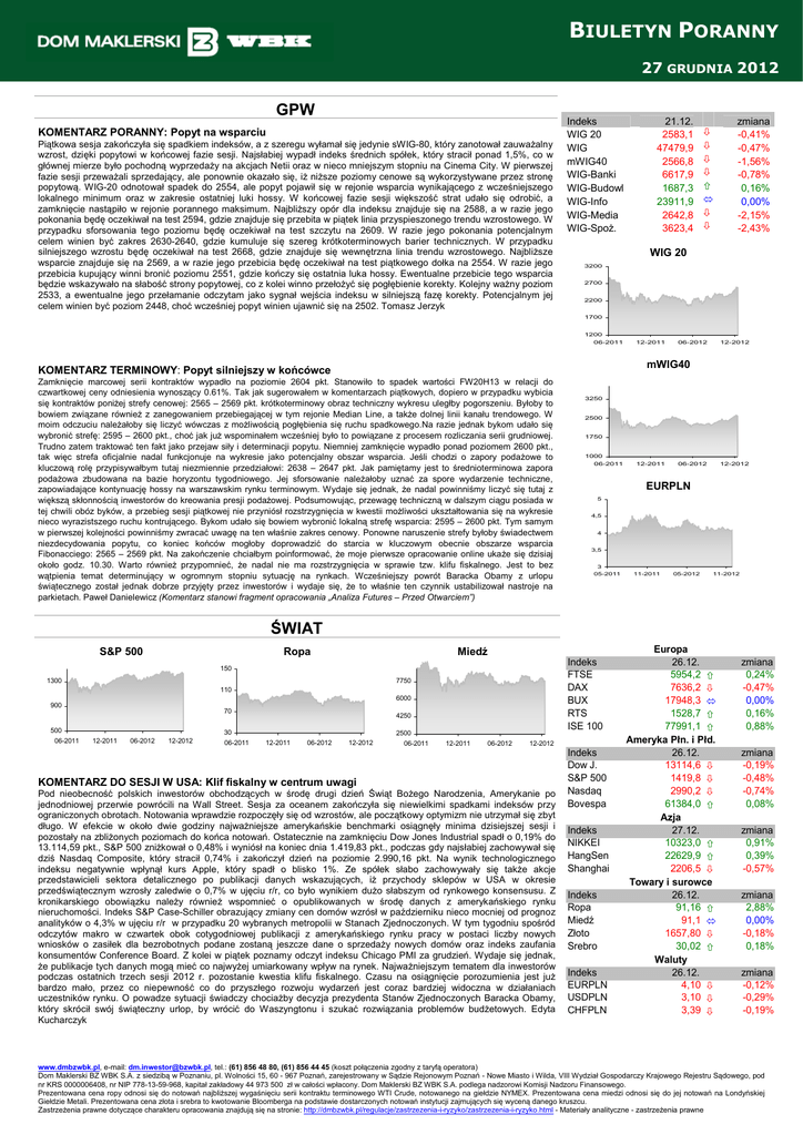 BIULETYN PORANNY o 27 GRUDNIA 2012 GPW KOMENTARZ PORANNY: Popyt na wsparciu Piątkowa sesja zakończyła się spadkiem indeksów, a z szeregu wyłamał się jedynie sWIG-80, który zanotował zauwaŜalny wzrost, dzięki popytowi w końcowej fazie sesji. Najsłabiej wypadł indeks średnich spółek, który stracił ponad 1,5%, co w głównej mierze było pochodną wyprzedaŜy na akcjach Netii oraz w nieco mniejszym stopniu na Cinema City. W pierwszej fazie sesji przewaŜali sprzedający, ale ponownie okazało się, iŜ niŜsze poziomy cenowe są wykorzystywane przez stronę popytową. WIG-20 odnotował spadek do 2554, ale popyt pojawił się w rejonie wsparcia wynikającego z wcześniejszego lokalnego minimum oraz w zakresie ostatniej luki hossy. W końcowej fazie sesji większość strat udało się odrobić, a zamknięcie nastąpiło w rejonie porannego maksimum. NajbliŜszy opór dla indeksu znajduje się na 2588, a w razie jego pokonania będę oczekiwał na test 2594, gdzie znajduje się przebita w piątek linia przyspieszonego trendu wzrostowego. W przypadku sforsowania tego poziomu będę oczekiwał na test szczytu na 2609. W razie jego pokonania potencjalnym celem winien być zakres 2630-2640, gdzie kumuluje się szereg krótkoterminowych barier technicznych. W przypadku silniejszego wzrostu będę oczekiwał na test 2668, gdzie znajduje się wewnętrzna linia trendu wzrostowego. NajbliŜsze wsparcie znajduje się na 2569, a w razie jego przebicia będę oczekiwał na test piątkowego dołka na 2554. W razie jego przebicia kupujący winni bronić poziomu 2551, gdzie kończy się ostatnia luka hossy. Ewentualne przebicie tego wsparcia będzie wskazywało na słabość strony popytowej, co z kolei winno przełoŜyć się pogłębienie korekty. Kolejny waŜny poziom 2533, a ewentualne jego przełamanie odczytam jako sygnał wejścia indeksu w silniejszą fazę korekty. Potencjalnym jej celem winien być poziom 2448, choć wcześniej popyt winien ujawnić się na 2502. Tomasz Jerzyk Indeks WIG 20 WIG mWIG40 WIG-Banki WIG-Budowl WIG-Info WIG-Media WIG-SpoŜ. 21.12. 2583,1 47479,9 2566,8 6617,9 1687,3 23911,9 2642,8 3623,4 zmiana -0,41% -0,47% -1,56% -0,78% 0,16% 0,00% -2,15% -2,43% WIG 20 3200 2700 2200 1700 1200 06-2011 12-2011 06-2012 12-2012 mWIG40 KOMENTARZ TERMINOWY: Popyt silniejszy w końcówce Zamknięcie marcowej serii kontraktów wypadło na poziomie 2604 pkt. Stanowiło to spadek wartości FW20H13 w relacji do czwartkowej ceny odniesienia wynoszący 0.61%. Tak jak sugerowałem w komentarzach piątkowych, dopiero w przypadku wybicia się kontraktów poniŜej strefy cenowej: 2565 – 2569 pkt. krótkoterminowy obraz techniczny wykresu uległby pogorszeniu. Byłoby to bowiem związane równieŜ z zanegowaniem przebiegającej w tym rejonie Median Line, a takŜe dolnej linii kanału trendowego. W moim odczuciu naleŜałoby się liczyć wówczas z moŜliwością pogłębienia się ruchu spadkowego.Na razie jednak bykom udało się wybronić strefę: 2595 – 2600 pkt., choć jak juŜ wspominałem wcześniej było to powiązane z procesem rozliczania serii grudniowej. Trudno zatem traktować ten fakt jako przejaw siły i determinacji popytu. Niemniej zamknięcie wypadło ponad poziomem 2600 pkt., tak więc strefa oficjalnie nadal funkcjonuje na wykresie jako potencjalny obszar wsparcia. Jeśli chodzi o zapory podaŜowe to kluczową rolę przypisywałbym tutaj niezmiennie przedziałowi: 2638 – 2647 pkt. Jak pamiętamy jest to średnioterminowa zapora podaŜowa zbudowana na bazie horyzontu tygodniowego. Jej sforsowanie naleŜałoby uznać za spore wydarzenie techniczne, zapowiadające kontynuację hossy na warszawskim rynku terminowym. Wydaje się jednak, Ŝe nadal powinniśmy liczyć się tutaj z większą skłonnością inwestorów do kreowania presji podaŜowej. Podsumowując, przewagę techniczną w dalszym ciągu posiada w tej chwili obóz byków, a przebieg sesji piątkowej nie przyniósł rozstrzygnięcia w kwestii moŜliwości ukształtowania się na wykresie nieco wyrazistszego ruchu kontrującego. Bykom udało się bowiem wybronić lokalną strefę wsparcia: 2595 – 2600 pkt. Tym samym w pierwszej kolejności powinniśmy zwracać uwagę na ten właśnie zakres cenowy. Ponowne naruszenie strefy byłoby świadectwem niezdecydowania popytu, co koniec końców mogłoby doprowadzić do starcia w kluczowym obecnie obszarze wsparcia Fibonacciego: 2565 – 2569 pkt. Na zakończenie chciałbym poinformować, Ŝe moje pierwsze opracowanie online ukaŜe się dzisiaj około godz. 10.30. Warto równieŜ przypomnieć, Ŝe nadal nie ma rozstrzygnięcia w sprawie tzw. klifu fiskalnego. Jest to bez wątpienia temat determinujący w ogromnym stopniu sytuację na rynkach. Wcześniejszy powrót Baracka Obamy z urlopu świątecznego został jednak dobrze przyjęty przez inwestorów i wydaje się, Ŝe to właśnie ten czynnik ustabilizował nastroje na parkietach. Paweł Danielewicz (Komentarz stanowi fragment opracowania „Analiza Futures – Przed Otwarciem”) 3250 2500 1750 1000 06-2011 12-2011 06-2012 12-2012 EURPLN 5 4,5 4 3,5 3 05-2011 11-2011 05-2012 11-2012 ŚWIAT S&P 500 Ropa Miedź Indeks FTSE DAX BUX RTS ISE 100 150 1300 7750 110 6000 900 70 500 06-2011 4250 30 12-2011 06-2012 12-2012 06-2011 2500 12-2011 06-2012 12-2012 06-2011 12-2011 06-2012 12-2012 KOMENTARZ DO SESJI W USA: Klif fiskalny w centrum uwagi Pod nieobecność polskich inwestorów obchodzących w środę drugi dzień Świąt BoŜego Narodzenia, Amerykanie po jednodniowej przerwie powrócili na Wall Street. Sesja za oceanem zakończyła się niewielkimi spadkami indeksów przy ograniczonych obrotach. Notowania wprawdzie rozpoczęły się od wzrostów, ale początkowy optymizm nie utrzymał się zbyt długo. W efekcie w około dwie godziny najwaŜniejsze amerykańskie benchmarki osiągnęły minima dzisiejszej sesji i pozostały na zbliŜonych poziomach do końca notowań. Ostatecznie na zamknięciu Dow Jones Indust
