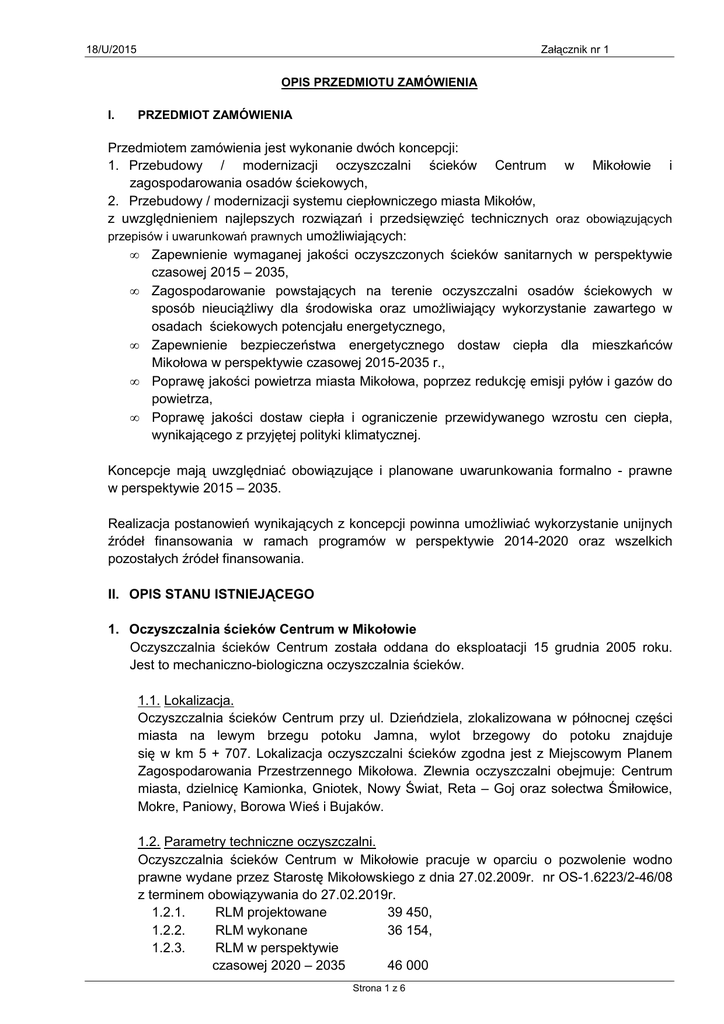 18/U/2015 Załącznik nr 1 OPIS PRZEDMIOTU ZAMÓWIENIA I. PRZEDMIOT ZAMÓWIENIA Przedmiotem zamówienia jest wykonanie dwóch koncepcji: 1. Przebudowy / modernizacji oczyszczalni ścieków Centrum w Mikołowie i zagospodarowania osadów ściekowych, 2. Przebudowy / modernizacji systemu ciepłowniczego miasta Mikołów, z uwzględnieniem najlepszych rozwiązań i przedsięwzięć technicznych oraz obowiązujących przepisów i uwarunkowań prawnych umożliwiających: • Zapewnienie wymaganej jakości oczyszczonych ścieków sanitarnych w perspektywie czasowej 2015 – 2035, • Zagospodarowanie powstających na terenie oczyszczalni osadów ściekowych w sposób nieuciążliwy dla środowiska oraz umożliwiający wykorzystanie zawartego w osadach ściekowych potencjału energetycznego, • Zapewnienie bezpieczeństwa energetycznego dostaw ciepła dla mieszkańców Mikołowa w perspektywie czasowej 2015-2035 r., • Poprawę jakości powietrza miasta Mikołowa, poprzez redukcję emisji pyłów i gazów do powietrza, • Poprawę jakości dostaw ciepła i ograniczenie przewidywanego wzrostu cen ciepła, wynikającego z przyjętej polityki klimatycznej. Koncepcje mają uwzględniać obowiązujące i planowane uwarunkowania formalno - prawne w perspektywie 2015 – 2035. Realizacja postanowień wynikających z koncepcji powinna umożliwiać wykorzystanie unijnych źródeł finansowania w ramach programów w perspektywie 2014-2020 oraz wszelkich pozostałych źródeł finansowania. II. OPIS STANU ISTNIEJĄCEGO 1. Oczyszczalnia ścieków Centrum w Mikołowie Oczyszczalnia ścieków Centrum została oddana do eksploatacji 15 grudnia 2005 roku. Jest to mechaniczno-biologiczna oczyszczalnia ścieków. 1.1. Lokalizacja. Oczyszczalnia ścieków Centrum przy ul. Dzieńdziela, zlokalizowana w północnej części miasta na lewym brzegu potoku Jamna, wylot brzegowy do potoku znajduje się w km 5 + 707. Lokalizacja oczyszczalni ścieków zgodna jest z Miejscowym Planem Zagospodarowania Przestrzennego Mikołowa. Zlewnia oczyszczalni obejmuje: Centrum miasta, dzielnicę Kamionka, Gniotek, Nowy Świat, Reta – Goj oraz sołectwa Śmiłowice, Mokre, Paniowy, Borowa Wieś i Bujaków. 1.2. Parametry techniczne oczyszczalni. Oczyszczalnia ścieków Centrum w Mikołowie pracuje w oparciu o pozwolenie wodno prawne wydane przez Starostę Mikołowskiego z dnia 27.02.2009r. nr OS-1.6223/2-46/08 z terminem obowiązywania do 27.02.2019r. 1.2.1. RLM projektowane 39 450, 1.2.2. RLM wykonane 36 154, 1.2.3. RLM w perspektywie czasowej 2020 – 2035 46 000 Strona 1 z 6 18/U/2015 Załącznik nr 1 1.2.4. 1.2.5. 1.2.6. 1.2.7. 1.2.8. 1.2.9. 1.2.10. Ilość ścieków 2 013 439 m3/rok, Przepływ ścieków 4 075 m3/d Ładunek 2 579 kg O2/d Kod osadu ściekowego 190805 Ilość osadu ściekowego 671 Mg s.m. /rok Stopień uwodnienia 78-80% Wartość opałowa 14 MJ/m3 1.3. Technologia oczyszczalni. 1.3.1. Pompownia główna ścieków, 1.3.2. Osadnik wód deszczowych, 1.3.3. Sito piaskownik, 1.3.4. Bioreaktory ze stacją dmuchaw, 1.3.5. Osadniki wtórne, 1.3.6. Pompownia osadów ściekowych, 1.3.7. Prasa odwadniająca. 2. System ciepłowniczy miasta Mikołowa. System ciepłowniczy miasta Mikołowa, wytwarza ciepło użytkowe, przeznaczone do ogrzewania budynków mieszkalnych i samorządowych oraz krytej pływalni, a także przeznaczony jest do grupowego przygotowania ciepłej wody użytkowej. 2.1. Lokalizacja. Sieć ciepłownicza zlokalizowana na terenie miasta Mikołów obejmuje swym zasięgiem centrum miasta w tym osiedla: Norwida, Grunwaldzkie, Kochanowskiego, Słowackiego, Mickiewicza, XXX – lecia, Skalna. 2.2. Opis systemu ciepłowniczego. 2.2.1. Kotłownia węglowa, ul. Grażyńskiego 17, 2.2.2. Kotłownia olejowo – gazowa, ul. Skalna 10, 2.2.3. Wysokoparametrowa sieć ciepłownicza, 2.2.4. Grupowe węzły ciepła, 2.2.5. Zewnętrzna instalacja ciepłownicza CO, 2.2.6. Zewnętrzna instalacja ciepłownicza CWU, 2.2.7. Indywidualne węzły ciepła. 2.3. Parametry techniczne systemu ciepłowniczego. W istniejącym systemie ciepłowniczym funkcjonują dwie kotłownie (Grażyńskiego – węglowa, Skalna – olejowo gazowa) oraz prowadzona jest dystrybucja ciepła zakupionego w kotłowni zewnętrznej. Wielkość Jedn. Kotłownia węglowa Grażyński Moc zamówiona MW 21,0 1,4 6.6 Moc wykorzystana MW 15,6 1,3 6,5 Temp. wody sieciowej °C 113/70 90/70 120/70 Strona 2 z 6 Kotłownia gazowa Skalna Dystrybucja ciepła ze źródła zewnętrznego 18/U/2015 Załącznik nr 1 Sprzedaż ciepła Ilość grupowych SCW - CO Ilość grupowych SWC – CO i CWU Długość sieci GJ 106 897 6 946 32 373 szt. 8 0 0 szt. 4 0 1 km 15,2 0,4 3,9 III. WYMAGANIA ZAMAWIAJĄCEGO DOTYCZĄCE PRZEDMIOTU ZAMÓWIENIA Przedmiot zamówienia, tj. wykonanie dwóch koncepcji jak w pkt. I ma składać się z: 1. Analizy uwarunkowań formalno – prawnych oraz wynikających z nich szans i zagrożeń. Wzięte pod uwagę rozwiązania, powinny uwzględniać obowiązujące i planowane uwarunkowania prawne w tym szczególności: 1.1. Dyrektywa Rady 86/278/EWG z dnia 12 czerwca 1986r. w sprawie ochrony środowiska, w szczególności gleby, w przypadku wykorzystywania osadów ściekowych w rolnictwie, 1.2. Ustawy za dnia 18 lipca 2001r., Prawo wodne z późniejszymi zmianami, 1.3. Ustawy z dnia 27 kwietnia 2001r., Prawo ochrony środowiska z późniejszymi zmianami, 1.4. Ustawy z dnia 14 grudniach 2012r., o odpadach z późniejszymi zmianami, 1.5. Ustawy z dnia 10 kwietnia 1997r., Prawo Energetyczne z późniejszymi zmianami, 1.6. Ustawy z dnia 20 lutego 2015r., o odnawialnych źródłach energii, 1.7. Krajowy program oczyszczania ścieków komunalnych, 1.8. Krajowy plan gospodarkami odpadami, 1.9. Dyrektywa MCP z dnia 18-12-2013 z późniejszymi zmianami, Parlamentu Europejskiego i Rady, w sprawie ograniczenia emisji niektórych zanieczyszczeń do powietrza ze średnich obiektów energetycznego spalania, 1.10. Dyrektywy EED z dnia 25 października 2012 r. Parlamentu Europe