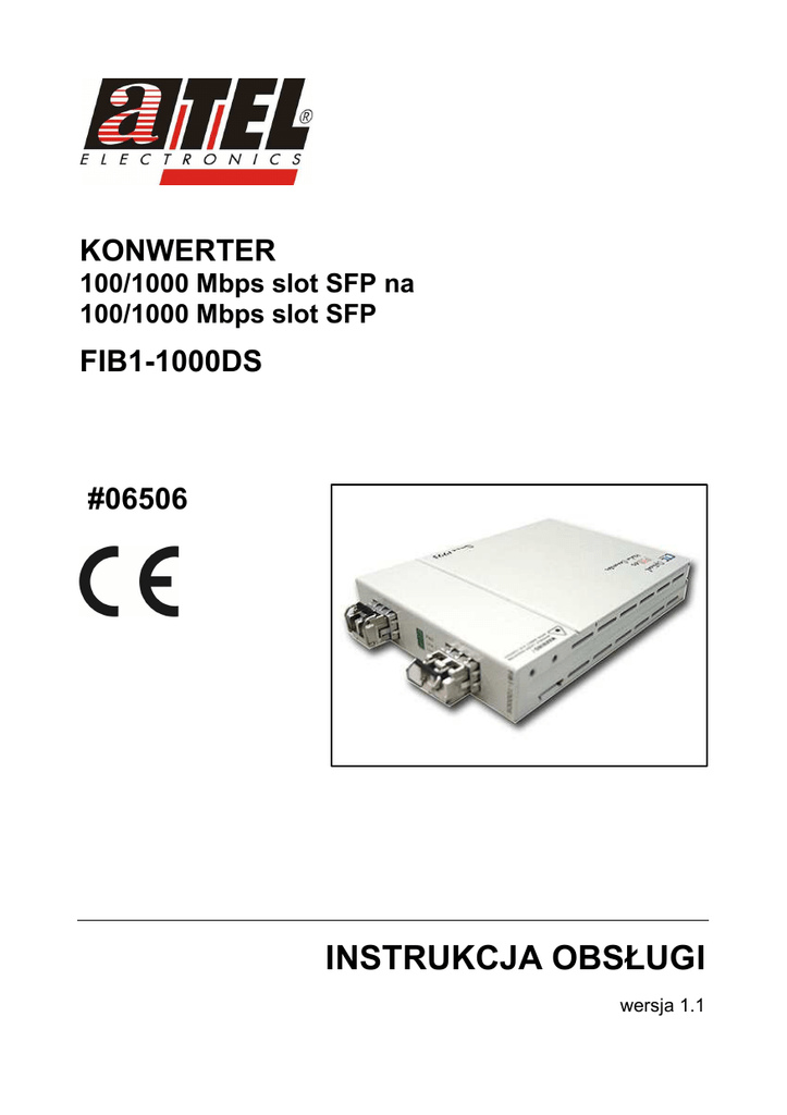 KONWERTER 100/1000 Mbps slot SFP na 100/1000 Mbps slot SFP FIB1-1000DS #06506 INSTRUKCJA OBSŁUGI wersja 1.1 FIB1-1000DS SPIS TREŚCI Wstęp ............................................................................................................ 3 Właściwości .................................................................................................. 3 Bezpieczeństwo uŜytkowania ....................................................................... 3 1. Zawartość opakowania ............................................................................. 4 2. Zasady bezpieczeństwa ........................................................................... 4 3. Środowisko pracy ..................................................................................... 4 4. Budowa urządzenia .................................................................................. 5 4.1 Zasilanie ............................................................................................. 5 4.2 Panele urządzenia .............................................................................. 5 4.3 Diody LED .......................................................................................... 5 5. Instalacja ................................................................................................... 6 6. Konserwacja ............................................................................................. 6 7. Składowanie zuŜytego sprzętu ................................................................. 7 8. Parametry techniczne ............................................................................... 8 2 FIB1-1000DS Wstęp Konwerter firmy CTC Union Technology FIB1-1000DS pozwala połączyć segmenty wykonane kablem miedzianym z segmentami wykonanymi kablem światłowodowym, a takŜe róŜnych elementów okablowania światłowodowego (jednodomowych i wielodomowych). Konwerter posiada ponadto funkcję wzmacniacza pozwalając łączyć segmenty światłowodowe MM lub SM. UmoŜliwia łączenie okablowania opartego na standardach Fast Ethernet, Gigabit Ethernet, FDDI, STM-1, STM-4, OC1, OC3, OC12, OC24 oraz 1G Fiber Channel. Zapewnia regenerację sygnału typu 2R (reamplification - regeneracja amplitudy sygnału, reshaping - regeneracja profilu sygnału). Właściwości Prędkość transmisji – do 2.67Gbps; Kompatybilny z FRM301 Chassis dla zarządzania SNMP; Rodzaje konwersji: MM na MM, MM na SM, SM na SM, kabel miedziany RJ-45 na MM oraz kabel miedziany na SM; Regeneracja sygnału typu 2R; WydłuŜenie odległości przesyłania danych na światłowodzie MM – do 2 km; WydłuŜenie odległości przesyłania danych na światłowodzie SM – do 120 km; WydłuŜenie odległości przesyłania danych na kablu miedzianym – do 100 m; Złącze optyczne: SFP-LC. Bezpieczeństwo uŜytkowania Urządzenie zostało zaprojektowane i wyprodukowane z najwyŜszą starannością o bezpieczeństwo osób instalujących i uŜytkujących. Dla zapewnienia bezpieczeństwa pracy, naleŜy stosować się do wszelkich wskazań zawartych w tej instrukcji jak i instrukcjach obsługi urządzeń towarzyszących (np. komputera PC). Przed przystąpieniem do instalacji urządzenia naleŜy dokładnie przeczytać całość tej instrukcji, w szczególności zaś punkty poświęcone bezpieczeństwu. NaleŜy zapewnić bezpieczne warunki pracy urządzenia (np. uŜywać tylko ekranowanych przewodów do połączenia z komputerem lub innym urządzeniem peryferyjnym). Dokonanie przez uŜytkownika jakichkolwiek własnych zmian w urządzeniu moŜe spowodować utratę moŜliwości jego legalnego uŜytkowania. Urządzenie zostało poddane obowiązkowej ocenie zgodności i spełnienia zasadnicze wymagania zawarte w europejskich Dyrektywach Nowego Podejścia. Produkt jest oznakowany znakiem CE. 3 FIB1-1000DS 1. Zawartość opakowania konwerter FIB1-1000DS, zasilacz AC/CD, instrukcja obsługi w języku angielskim, niniejsza instrukcja obsługi. Podczas dostawy naleŜy upewnić się, Ŝe opakowanie nie jest uszkodzone. W przypadku stwierdzonych uszkodzeń naleŜy niezwłocznie skontaktować się z dostawcą. Prosimy równieŜ o sprawdzenie zgodności zawartości opakowania z powyŜej zamieszczoną listą. 2. Zasady bezpieczeństwa Konwerter jest zgodny z przepisami w zakresie bezpieczeństwa uŜytkowania urządzeń elektrycznych. NaleŜy przestrzegać następujących zaleceń: - gniazdo sieciowe musi być uziemione zgodnie z obowiązującymi przepisami, - przed przeniesieniem lub wykonywaniem innych operacji technicznych urządzenie naleŜy odłączyć od zasilania, - nie stosować uszkodzonych lub zuŜytych przewodów zasilania, gdyŜ powodują one znaczne zagroŜenie dla bezpieczeństwa uŜytkownika, - prace instalacyjne muszą być wykonywane przez odpowiednio przeszkolony personel techniczny, - nie stosować urządzenia w miejscach występowania substancji łatwopalnych, - zabezpieczyć urządzenie przed dostępem dzieci lub osób niepowołanych, - upewnić się, Ŝe urządzenie zostało odpowiednio zamocowane, - urządzenie traktowane jest jako wyłączone dopiero po odłączeniu przewodów zasilania oraz przewodów łączących je z innymi urządzeniami, - jeśli urządzenie zostanie przeniesione z miejsca chłodnego do ciepłego, w jego wnętrzu moŜe skroplić się para wodna uniemoŜliwiając prawidłowe funkcjonowanie. NaleŜy wówczas odczekać, aŜ wilgoć odparuje. Uwaga! Nadajniki optyczne korzystają z lasera o duŜej mocy. Skierowanie go w kierunku oczu moŜe spowodować uszkodzenie wzroku. Nie naleŜy dotykać styków gniazd znajdujących się na obudowie urządzenia. Wyładowanie elektrostatyczne moŜe spowodować trwałe uszkodzenie urządzenia. 3. Środowisko pracy NaleŜy zadbać, aby urządzenie umieszczone było w sposób zapewniający dobry przepływ powietrza i łatwy dostęp do portów. Powietrze powinno być wolne od zanieczyszczeń, a urządzenie nie powinno znajdować się w bezpośredn