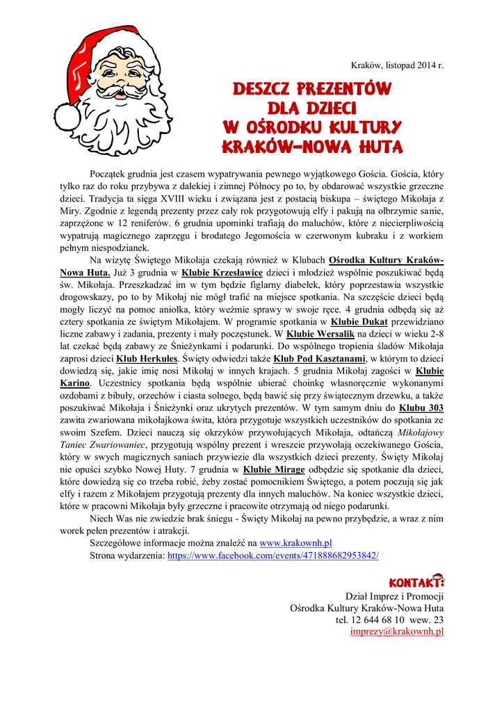 Kraków, listopad 2014 r. Początek grudnia jest czasem wypatrywania pewnego wyjątkowego Gościa. Gościa, który tylko raz do roku przybywa z dalekiej i zimnej Północy po to, by obdarować wszystkie grzeczne dzieci. Tradycja ta sięga XVIII wieku i związana jest z postacią biskupa – świętego Mikołaja z Miry. Zgodnie z legendą prezenty przez cały rok przygotowują elfy i pakują na olbrzymie sanie, zaprzężone w 12 reniferów. 6 grudnia upominki trafiają do maluchów, które z niecierpliwością wypatrują magicznego zaprzęgu i brodatego Jegomościa w czerwonym kubraku i z workiem pełnym niespodzianek. Na wizytę Świętego Mikołaja czekają również w Klubach Ośrodka Kultury KrakówNowa Huta. Już 3 grudnia w Klubie Krzesławice dzieci i młodzież wspólnie poszukiwać będą św. Mikołaja. Przeszkadzać im w tym będzie figlarny diabełek, który poprzestawia wszystkie drogowskazy, po to by Mikołaj nie mógł trafić na miejsce spotkania. Na szczęście dzieci będą mogły liczyć na pomoc aniołka, który weźmie sprawy w swoje ręce. 4 grudnia odbędą się aż cztery spotkania ze świętym Mikołajem. W programie spotkania w Klubie Dukat przewidziano liczne zabawy i zadania, prezenty i mały poczęstunek. W Klubie Wersalik na dzieci w wieku 2-8 lat czekać będą zabawy ze Śnieżynkami i podarunki. Do wspólnego tropienia śladów Mikołaja zaprosi dzieci Klub Herkules. Święty odwiedzi także Klub Pod Kasztanami, w którym to dzieci dowiedzą się, jakie imię nosi Mikołaj w innych krajach. 5 grudnia Mikołaj zagości w Klubie Karino. Uczestnicy spotkania będą wspólnie ubierać choinkę własnoręcznie wykonanymi ozdobami z bibuły, orzechów i ciasta solnego, będą bawić się przy świątecznym drzewku, a także poszukiwać Mikołaja i Śnieżynki oraz ukrytych prezentów. W tym samym dniu do Klubu 303 zawita zwariowana mikołajkowa świta, która przygotuje wszystkich uczestników do spotkania ze swoim Szefem. Dzieci nauczą się okrzyków przywołujących Mikołaja, odtańczą Mikołajowy Taniec Zwariowaniec, przygotują wspólny prezent i wreszcie przywołają oczekiwanego Gościa, który w swych magicznych saniach przywiezie dla wszystkich dzieci prezenty. Święty Mikołaj nie opuści szybko Nowej Huty. 7 grudnia w Klubie Mirage odbędzie się spotkanie dla dzieci, które dowiedzą się co trzeba robić, żeby zostać pomocnikiem Świętego, a potem poczują się jak elfy i razem z Mikołajem przygotują prezenty dla innych maluchów. Na koniec wszystkie dzieci, które w pracowni Mikołaja były grzeczne i pracowite otrzymają od niego podarunki. Niech Was nie zwiedzie brak śniegu - Święty Mikołaj na pewno przybędzie, a wraz z nim worek pełen prezentów i atrakcji. Szczegółowe informacje można znaleźć na www.krakownh.pl Strona wydarzenia: https://www.facebook.com/events/471888682953842/ Dział Imprez i Promocji Ośrodka Kultury Kraków-Nowa Huta tel. 12 644 68 10 wew. 23 [email protected]