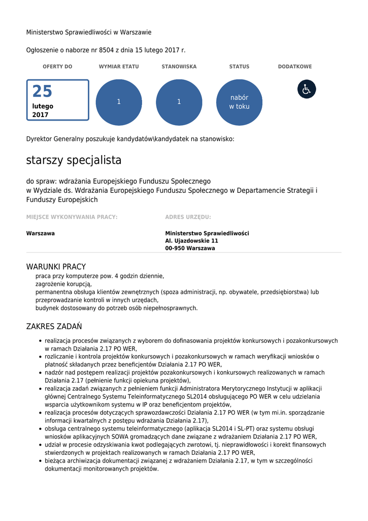 Ministerstwo Sprawiedliwości w Warszawie Ogłoszenie o naborze nr 8504 z dnia 15 lutego 2017 r. OFERTY DO 25 lutego 2017 WYMIAR ETATU STANOWISKA STATUS 1 1 nabór w toku DODATKOWE Dyrektor Generalny poszukuje kandydatów\kandydatek na stanowisko: starszy specjalista do spraw: wdrażania Europejskiego Funduszu Społecznego w Wydziale ds. Wdrażania Europejskiego Funduszu Społecznego w Departamencie Strategii i Funduszy Europejskich MIEJSCE WYKONYWANIA PRACY: ADRES URZĘDU: Warszawa Ministerstwo Sprawiedliwości Al. Ujazdowskie 11 00-950 Warszawa WARUNKI PRACY praca przy komputerze pow. 4 godzin dziennie, zagrożenie korupcją, permanentna obsługa klientów zewnętrznych (spoza administracji, np. obywatele, przedsiębiorstwa) lub przeprowadzanie kontroli w innych urzędach, budynek dostosowany do potrzeb osób niepełnosprawnych. ZAKRES ZADAŃ realizacja procesów związanych z wyborem do dofinasowania projektów konkursowych i pozakonkursowych w ramach Działania 2.17 PO WER, rozliczanie i kontrola projektów konkursowych i pozakonkursowych w ramach weryfikacji wniosków o płatność składanych przez beneficjentów Działania 2.17 PO WER, nadzór nad postępem realizacji projektów pozakonkursowych i konkursowych realizowanych w ramach Działania 2.17 (pełnienie funkcji opiekuna projektów), realizacja zadań związanych z pełnieniem funkcji Administratora Merytorycznego Instytucji w aplikacji głównej Centralnego Systemu Teleinformatycznego SL2014 obsługującego PO WER w celu udzielania wsparcia użytkownikom systemu w IP oraz beneficjentom projektów, realizacja procesów dotyczących sprawozdawczości Działania 2.17 PO WER (w tym mi.in. sporządzanie informacji kwartalnych z postępu wdrażania Działania 2.17), obsługa centralnego systemu teleinformatycznego (aplikacja SL2014 i SL-PT) oraz systemu obsługi wniosków aplikacyjnych SOWA gromadzących dane związane z wdrażaniem Działania 2.17 PO WER, udział w procesie odzyskiwania kwot podlegających zwrotowi, tj. nieprawidłowości i korekt finansowych stwierdzonych w projektach realizowanych w ramach Działania 2.17 PO WER, bieżąca archiwizacja dokumentacji związanej z wdrażaniem Działania 2.17, w tym w szczególności dokumentacji monitorowanych projektów. WYMAGANIA NIEZBĘDNE Wykształcenie: wyższe doświadczenie zawodowe: 1 rok w prowadzeniu lub zarządzaniu projektami lub zarządzaniu programami europejskimi w jednostkach sektora finansów publicznych zorientowanie na osiąganie celów, doskonalenie zawodowe, identyfikacja z misją urzędu, pozytywne podejście do klienta, otwartość na zmiany, asertywność, podejmowanie decyzji i odpowiedzialność, myślenie analityczne, znajomość języka angielskiego na poziomie B1, znajomość zasad realizacji projektów współfinansowanych ze środków UE, w szczególności dotyczących PO WER, znajomość kodeksu cywilnego, ustawy o finansach publicznych i ustawy - Prawo zamówień publicznych, znajomość aktów prawnych dot. organizacji wymiaru sprawiedliwości, Posiadanie obywatelstwa polskiego Korzystanie z pełni praw publicznych Nieskazanie prawomocnym wyrokiem za umyślne przestępstwo lub umyślne przestępstwo skarbowe WYMAGANIA DODATKOWE studia podyplomowe w zakresie zarządzania projektami lub zarządzania projektami europejskimi, DOKUMENTY I OŚWIADCZENIA NIEZBĘDNE Życiorys/CV i list motywacyjny Kopie dokumentów potwierdzających spełnienie wymagania niezbędnego w zakresie wykształcenia Kopie dokumentów potwierdzających spełnienie wymagania niezbędnego w zakresie doświadczenia zawodowego / stażu pracy Kopia dokumentu określonego w załączniku nr 2 do Rozporządzenia Prezesa Rady Ministrów, z dnia 16 grudnia 2009 r. w sprawie sposobu przeprowadzania postępowania kwalifikacyjnego w służbie cywilnej (Dz. U. Nr 218, poz. 1695), potwierdzająca znajomość języka angielskiego na poziomie B1. W przypadku składania dyplomu ukończenia Krajowej Szkoły Administracji Publicznej należy złożyć dodatkowo zaświadczenie potwierdzające znajomość języka angielskiego wydane przez KSAP, jeśli z treści dyplomu ukończenia KSAP nie wynika, że absolwent Szkoły posiada znajomość tego języka. Kandydatki/kandydaci, którzy nie złożą dokumentów potwierdzających znajomość języka angielskiego na wymaganym poziomie zostaną poddani procedurze sprawdzającej. Oświadczenie o posiadaniu obywatelstwa polskiego albo kopia dokumentu potwierdzającego posiadanie polskiego obywatelstwa Oświadczenie o wyrażeniu zgody na przetwarzanie danych osobowych do celów naboru Oświadczenie o korzystaniu z pełni praw publicznych Oświadczenie o nieskazaniu prawomocnym wyrokiem za umyślne przestępstwo lub umyślne przestępstwo skarbowe DOKUMENTY I OŚWIADCZENIA DODATKOWE kopia dokumentu potwierdzającego niepełnosprawność - w przypadku kandydatek/kandydatów, zamierzających skorzystać z pierwszeństwa w zatrudnieniu w przypadku, gdy znajdą się w gronie najlepszych kandydatek/kandydatów Kopia dokumentu potwierdzającego spełnianie wymagania dodatkowego w zakresie wykształcenia (fakultatywnie). TERMINY I MIEJSCE SKŁADANIA DOKUMENTÓW Dokumenty należy złożyć do: 25 lutego 2017 r. Decyduje data: stempla pocztowego / osobistego dostarczenia oferty do urzędu Miejsce składania dokumentów: Ministerstwo Sprawiedliwości Biuro Dyrektora Generalnego Wydział Zarządzania Zasobami Ludzkimi Al. Ujazdowskie 11 00-950 Warszawa Z podaniem na kopercie numeru ogłoszenia INNE INFORMACJE: W miesiącu poprzedzającym datę upublicznienia ogłoszenia wskaźnik zatrudnienia osób niepełnosprawnych w urzędzie, w rozumieniu przepisów o rehabilitacji zawodowej i społecznej oraz zatrudnianiu osób niepełnosprawnych, nie wynosi co najmniej 6%. Nasz urząd jest pracodawcą równych szans i wszystkie aplikacje są rozważane z równą uwagą bez względu na płeć, wiek, niepełnosprawność, rasę, narodowość, przekonania polityczne, przynależność zwi