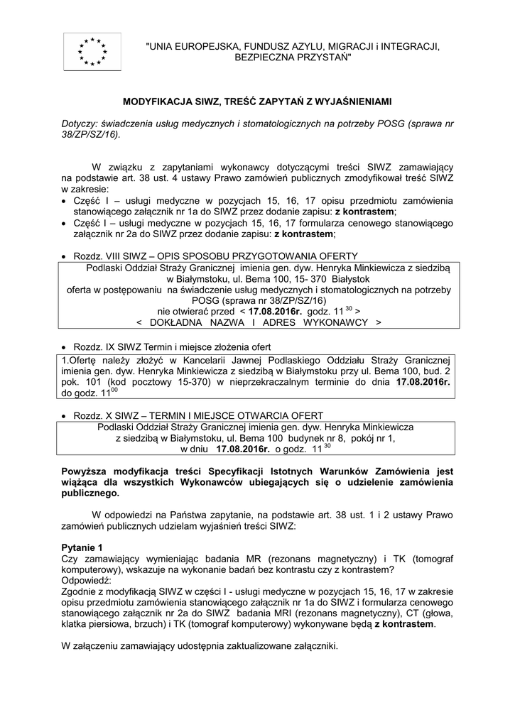 "UNIA EUROPEJSKA, FUNDUSZ AZYLU, MIGRACJI i INTEGRACJI, BEZPIECZNA PRZYSTAŃ" MODYFIKACJA SIWZ, TREŚĆ ZAPYTAŃ Z WYJAŚNIENIAMI Dotyczy: świadczenia usług medycznych i stomatologicznych na potrzeby POSG (sprawa nr 38/ZP/SZ/16). W związku z zapytaniami wykonawcy dotyczącymi treści SIWZ zamawiający na podstawie art. 38 ust. 4 ustawy Prawo zamówień publicznych zmodyfikował treść SIWZ w zakresie: Część I – usługi medyczne w pozycjach 15, 16, 17 opisu przedmiotu zamówienia stanowiącego załącznik nr 1a do SIWZ przez dodanie zapisu: z kontrastem; Część I – usługi medyczne w pozycjach 15, 16, 17 formularza cenowego stanowiącego załącznik nr 2a do SIWZ przez dodanie zapisu: z kontrastem; Rozdz. VIII SIWZ – OPIS SPOSOBU PRZYGOTOWANIA OFERTY Podlaski Oddział Straży Granicznej imienia gen. dyw. Henryka Minkiewicza z siedzibą w Białymstoku, ul. Bema 100, 15- 370 Białystok oferta w postępowaniu na świadczenie usług medycznych i stomatologicznych na potrzeby POSG (sprawa nr 38/ZP/SZ/16) nie otwierać przed < 17.08.2016r. godz. 11 30 > < DOKŁADNA NAZWA I ADRES WYKONAWCY > Rozdz. IX SIWZ Termin i miejsce złożenia ofert 1.Ofertę należy złożyć w Kancelarii Jawnej Podlaskiego Oddziału Straży Granicznej imienia gen. dyw. Henryka Minkiewicza z siedzibą w Białymstoku przy ul. Bema 100, bud. 2 pok. 101 (kod pocztowy 15-370) w nieprzekraczalnym terminie do dnia 17.08.2016r. do godz. 1100 Rozdz. X SIWZ – TERMIN I MIEJSCE OTWARCIA OFERT Podlaski Oddział Straży Granicznej imienia gen. dyw. Henryka Minkiewicza z siedzibą w Białymstoku, ul. Bema 100 budynek nr 8, pokój nr 1, w dniu 17.08.2016r. o godz. 11 30 Powyższa modyfikacja treści Specyfikacji Istotnych Warunków Zamówienia jest wiążąca dla wszystkich Wykonawców ubiegających się o udzielenie zamówienia publicznego. W odpowiedzi na Państwa zapytanie, na podstawie art. 38 ust. 1 i 2 ustawy Prawo zamówień publicznych udzielam wyjaśnień treści SIWZ: Pytanie 1 Czy zamawiający wymieniając badania MR (rezonans magnetyczny) i TK (tomograf komputerowy), wskazuje na wykonanie badań bez kontrastu czy z kontrastem? Odpowiedź: Zgodnie z modyfikacją SIWZ w części I - usługi medyczne w pozycjach 15, 16, 17 w zakresie opisu przedmiotu zamówienia stanowiącego załącznik nr 1a do SIWZ i formularza cenowego stanowiącego załącznik nr 2a do SIWZ badania MRI (rezonans magnetyczny), CT (głowa, klatka piersiowa, brzuch) i TK (tomograf komputerowy) wykonywane będą z kontrastem. W załączeniu zamawiający udostępnia zaktualizowane załączniki. "UNIA EUROPEJSKA, FUNDUSZ AZYLU, MIGRACJI i INTEGRACJI, BEZPIECZNA PRZYSTAŃ" Załącznik nr 1a OPIS PRZEDMIOTU ZAMÓWIENIA Część I - Usługi Medyczne CPV-85121000-3 - dotyczące osób przebywających w Strzeżonym Ośrodku dla Cudzoziemców - dorośli mężczyźni. Wykonawca jest zobowiązany świadczyć wszystkie usługi wskazane w poniższej tabeli w miejscowości Białystok co najmniej od poniedziałku do piątku (z wyjątkiem dni ustawowo wolnych od pracy) przez przynajmniej przez 2 godziny dziennie. Badania z Części I punkty 19, 26 i 28 przynajmniej raz w tygodniu przez 2 godziny. Badania i konsultacje specjalistyczne będą odbywały się po telefonicznym ustaleniu wizyty, czas oczekiwania nie dłuższy niż 2 dni robocze. Usługa kończy się wydaniem pisemnego wyniku badania, podpisanego przez osobę/y z odpowiednimi kwalifikacjami i uprawnieniami. Wykonawca jest zobowiązany do prowadzenia dokumentacji wykonywanych usług zgodnie z obowiązującymi przepisami z zachowaniem należytej staranności. Wykonawca zobowiązany jest do ochrony danych osobowych. Badania i konsultacje specjalistyczne stanowiące przedmiot umowy będą wykonywane zgodnie z zasadami wiedzy, należytą starannością i obowiązującymi w tym zakresie przepisami prawa i normami przez osoby o odpowiednich uprawnieniach i kwalifikacjach zawodowych. Świadczenia usług medycznych będą wykonywane zgodnie z wymogami wynikającymi z przepisów prawa. Usługi służą zachowaniu, ratowaniu, przywracaniu i poprawie zdrowia cudzoziemców. Art. 43 ust. 1 pkt 18 ustawy z dnia 11 marca 2004 r. o podatku od towarów i usług zwalnia z podatku VAT usługi w zakresie opieki medycznej służące profilaktyce, zachowaniu, ratowaniu, przywracaniu i poprawie zdrowia. Usługi opisane w punkt 11 nie są zwolnione z podatku VAT 23%. Zamawiający zobowiązuje się do przewiezienia cudzoziemca na własny koszt do wykonawcy, zagwarantowania bezpieczeństwa pracownikom w czasie wykonywania badania, zagwarantowania w uzasadnionych przypadkach obecności tłumacza podczas wykonywania usługi na ustny wniosek lekarza badającego. Zamawiający nie będzie dokonywał opłaty za badania nie zlecone. RTG wraz z opisem z Części I punkt 1, 2, 3, 4, 5, 6, 7, 8, 9, 10, 11 będzie dostarczany przez Wykonawcę na drugi dzień roboczy do Służby Zdrowia - siedziby Zamawiającego. TK/MRI wraz z opisem z Części I punkt 15,16 i 17 będzie dostarczany przez Wykonawcę w ciągu siedmiu dni roboczych do Służby Zdrowia - siedziby Zamawiającego. BAC wraz z opisem z Części I punkt 21 będzie dostarczany przez Wykonawcę nie dłużej niż 14 dni od momentu wykonania do Służby Zdrowia - siedziby Zamawiającego. Cena za konsultacje specjalistyczne jest ceną ryczałtową oraz uwzględnia wszelkie koszty związane z wykonaniem opinii specjalistycznej w tym m. in. wykonanie ewentualnych dodatkowych badań, konsultacji z innymi lekarzami. Zamawiający nie będzie dokonywał opłaty za badania, które będą zlecane przez lekarza specjalistę w celu wydania opinii specjalistycznej a ich koszt ponosi Wykonawca. Zamawiający zastrzega możliwość zlecania Wykonawcy wykonywania mniejszej ilości badań lekarskich i konsultacji oraz badań RTG oraz możliwość całkowitej rezygnacji z wykonania badania lub konsultacji danego rodzaju, w zależności od potrzeb Zamawiającego. Celem konsultacji specjalistycznych j