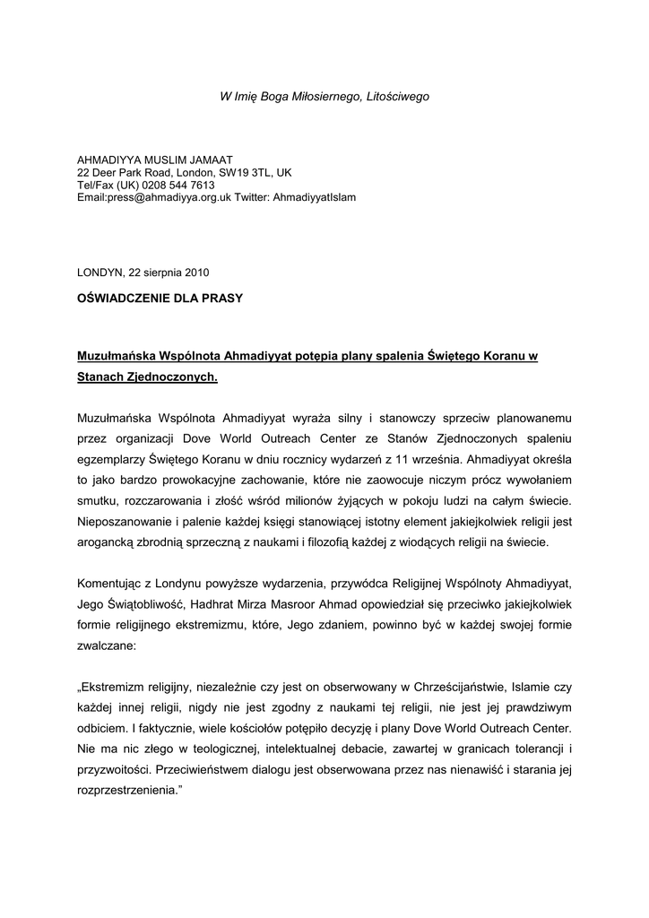 W Imię Boga Miłosiernego, Litościwego AHMADIYYA MUSLIM JAMAAT 22 Deer Park Road, London, SW19 3TL, UK Tel/Fax (UK) 0208 544 7613 Email:[email protected] Twitter: AhmadiyyatIslam LONDYN, 22 sierpnia 2010 OŚWIADCZENIE DLA PRASY Muzułmańska Wspólnota Ahmadiyyat potępia plany spalenia Świętego Koranu w Stanach Zjednoczonych. Muzułmańska Wspólnota Ahmadiyyat wyraŜa silny i stanowczy sprzeciw planowanemu przez organizacji Dove World Outreach Center ze Stanów Zjednoczonych spaleniu egzemplarzy Świętego Koranu w dniu rocznicy wydarzeń z 11 września. Ahmadiyyat określa to jako bardzo prowokacyjne zachowanie, które nie zaowocuje niczym prócz wywołaniem smutku, rozczarowania i złość wśród milionów Ŝyjących w pokoju ludzi na całym świecie. Nieposzanowanie i palenie kaŜdej księgi stanowiącej istotny element jakiejkolwiek religii jest arogancką zbrodnią sprzeczną z naukami i filozofią kaŜdej z wiodących religii na świecie. Komentując z Londynu powyŜsze wydarzenia, przywódca Religijnej Wspólnoty Ahmadiyyat, Jego Świątobliwość, Hadhrat Mirza Masroor Ahmad opowiedział się przeciwko jakiejkolwiek formie religijnego ekstremizmu, które, Jego zdaniem, powinno być w kaŜdej swojej formie zwalczane: „Ekstremizm religijny, niezaleŜnie czy jest on obserwowany w Chrześcijaństwie, Islamie czy kaŜdej innej religii, nigdy nie jest zgodny z naukami tej religii, nie jest jej prawdziwym odbiciem. I faktycznie, wiele kościołów potępiło decyzję i plany Dove World Outreach Center. Nie ma nic złego w teologicznej, intelektualnej debacie, zawartej w granicach tolerancji i przyzwoitości. Przeciwieństwem dialogu jest obserwowana przez nas nienawiść i starania jej rozprzestrzenienia.” Tym bardziej niefortunnym jest fakt, ze niektórzy nazywający siebie samych “Muzułmanami” szargają znaczenie i reputację Islamu poprzez ich działania przepełnione nienawiścią i okrucieństwem. Ci, którzy dopuszczają się takich czynów, nie są jednak świadomi prawdziwej nauki głoszonej przez Islam. Święty Koran został objawiony jako dar dla ludzkości, a zawarte nim nauki przepełnione są miłością, tolerancją i szacunkiem. Jednak, zbrodnicze czyny ekstremistów, którzy są mniejszością, sprawiają, Ŝe wierzy się, Ŝe nauki Islamu obejmują nienawiść, zachęcanie do mordów i brak tolerancji. Jego Świątobliwość kontynuował: „Świat potrzebuje pokoju, miłości i braterstwa. Świat potrzebuje końca wojen. Zamiast wznoszenia ścian nienawiści, potrzebujemy pokoju, koniecznym jest by pokój zwycięŜał, i w tym celu ludzie wszystkich wyznań muszą się razem zjednoczyć. Tak jak powiedziałem, nie ma nic złego w debatach i dialogu, lecz musi on mieć miejsce w pokojowej i tolerancyjnej atmosferze” Hadhrat Mirza Masroor Ahmad równieŜ mówił o ogromnej starcie dwuch kolejnych Ahmadi, zamordowanych w prowincji Sidh, w zeszłym tygodniu. Zarówno Dr Najam al-Hasan jak i Pir Habib-ur-Rehman zginęli śmiercią męczeńską, w wyniku prześladowań z powodu ich wiary. Łączna, aktualna liczba Muzułmanów Ahamdi, którzy zginęli śmiercią męczeńsko wynosi 95 osób w tym roku. Wspólnota Muzułmańska Ahmadiyyay wyraziła nadzieję, Ŝe Dove World Outreach Center zrezygnuje, ze swoich wcześniejszych zamiarów spalenia egzemplarzy Świętego Koranu. Jeśli do tego jednak nie dojdzie z ich inicjatywy, Hazur wyraził nadzieję, Ŝe nie dopuszczą do tego lokalne władze. Jeśli jednak, pomimo wszystko, dojdzie do tego barbarzyńskiego aktu, Wspólnota Muzułmańska Ahmadiyyat będzie kontynuowała swój sprzeciw w pokojowy i zgodny z prawem sposób. Na fanatyzm nie moŜna odpowiadać fanatyzmem, przeciwnie naleŜy mu się sprzeciwiać w umotywowany i pokojowy sposób. Koniec Więcej informacji: Abid Khan [email protected]
