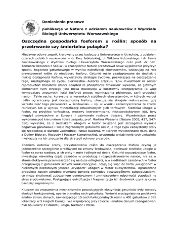 Doniesienie prasowe publikacja w Nature z udziałem naukowców z Wydziału Biologii Uniwersytetu Warszawskiego Oszczędna gospodarka fosforem u roślin: sposób na przetrwanie czy śmiertelna pułapka? Międzynarodowy zespół, kierowany przez badaczy z Uniwersytetu w Utrechcie, z udziałem czterech polskich naukowców – dr Ewy Jabłońskiej, dr Wiktora Kotowskiego i dr Pawła Pawlikowskiego z Wydziału Biologii Uniwersytetu Warszawskiego oraz prof. dr hab. Tomasza Okruszko z SGGW, w czasopiśmie Nature przedstawił nowe wyjaśnienie przyczyn spadku bogactwa gatunkowego w wyniku eutrofizacji ekosystemów, wskazując na rolę przystosowań roślin do niedoboru fosforu. Gatunki roślin zaadaptowane do siedlisk o niskiej dostępności fosforu, wykształciły strategie życiowe, pozwalające na oszczędzanie tego, niezbędnego do życia, pierwiastka. Autorzy artykułu ‘Low investment in sexual reproduction threatens plants adapted to phosphorus limitation’ wykazali, że głównym elementem tych strategii jest niska inwestycja w kosztowny energetycznie (a więc wymagający znacznych ilości fosforu) proces rozmnażania płciowego, czyli produkcji nasion. Takie cechy, korzystne w warunkach stabilnych ekosystemów, w których wzrost roślin ograniczany jest dostępnością fosforu, okazują się skrajnie niekorzystne, gdy wzrasta ilość tego pierwiastka w środowisku – np. w wyniku zanieczyszczenia ze źródeł rolniczych lub w wyniku mineralizacji odwodnionych gleb torfowych. Siedliska ubogie w fosfor, na przykład torfowiska, murawy kserotermiczne, niskoproduktywne łąki, były niegdyś powszechne w Europie i zajmowały rozległe obszary. Wcześniejsza praca wykonana pod kierunkiem lidera zespołu, prof. Martina Wassena (Nature 2005, 437, 547550) wykazała, że z siedliskami ubogimi w fosfor związane jest szczególnie wysokie bogactwo gatunkowe i wiele zagrożonych gatunków roślin, a tego typu ekosystemy stały się rzadkością w Europie Zachodniej. Nowe badania, w których wykorzystano m.in. dane z Doliny Biebrzy, Rospudy i Puszczy Kampinoskiej, proponują wyjaśnienie tych związków i wskazują na ich znaczenie dla strategii ochrony przyrody. Zdaniem autorów pracy, przystosowania roślin do oszczędzania fosforu czynią je jednocześnie szczególnie wrażliwymi na zmiany środowiska, ponieważ siedliska ubogie w fosfor są coraz rzadsze, a ich płaty – małe i odległe od siebie. Gatunki oszczędzające fosfor, inwestując niewielką część zasobów w produkcję i rozprzestrzenianie nasion, nie są w stanie efektywnie przemieszczać się na duże odległości, a w siedliskach zasobnych w fosfor przegrywają z gatunkami silnymi konkurencyjnie. Stają się więc de facto „uwięzione” w nielicznych pozostałych jeszcze „wyspach” ubogich w fosfor ekosystemów. Ograniczona produkcja nasion utrudnia wymianę genową pomiędzy poszczególnymi subpopulacjami, co może skutkować zubożeniem genetycznym i zmniejszeniem odporności populacji na stres środowiskowy. Postępująca eutrofizacja i fragmentacja ich środowisk czyni je coraz bardziej zagrożonymi. Kluczem do zrozumienia mechanizmów powodujących ekstynkcję gatunków były metody ekologii funkcjonalnej, oparte o analizę cech gatunków. Wnioski wyciągnięto na podstawie analizy zbioru danych, zawierającego 15 cech funkcjonalnych roślin u 491 gatunków z 599 lokalizacji w 9 krajach Eurazji. We współpracę przy zbiorze i analizie danych zaangażowani byli naukowcy z Holandii, Belgii, Niemiec i Polski. Aby ochronić wyspecjalizowane zagrożone gatunki, jak twierdzą autorzy cytowanej pracy, potrzebujemy dostosować obecne strategie ochrony przyrody tak, aby zachować siedliska ubogie w fosfor, przeciwdziałając eutrofizacji oraz odtwarzać je metodami restytucji przyrodniczej. Konieczne jest też zwiększenie przestrzennej spójności istniejących obszarów chronionych, np. poprzez tworzenie korytarzy ekologicznych, w celu poprawy łączności genetycznej pomiędzy izolowanymi płatami siedlisk i populacjami zagrożonych gatunków. Dr Ewa Jabłońska, dr Wiktor Kotowski oraz dr Paweł Pawlikowski są członkami Grupy Badawczej ds. Ekologii i Ochrony Ekosystemów w Zakładzie Ekologii Roślin i Ochrony Środowiska, na Wydziale Biologii Uniwersytetu Warszawskiego. Część danych została zebrana w ramach grantu badawczego Ministerstwa Nauki i Szkolnictwa Wyższego nr N304 010 31/0414. Prof. dr hab. Tomasz Okruszko jest kierownikiem Zakładu Hydrologii i Zasobów Wodnych Szkoły Głównej Gospodarstwa Wiejskiego w Warszawie. Informacje: dr Wiktor Kotowski, Zakład Ekologii Roślin i Ochrony Środowiska, Wydział Biologii, Uniwersytet Warszawski, [email protected], tel. 517751379 Y Fujiita, H Olde Venterink, PM van Bodegom, JC Douma, GW Heil, N Hölzel, E Jabłońska, W Kotowski, T Okruszko, P Pawlikowski, PC de Ruiter, MJ Wassen. 2013. Low investment in sexual reproduction threatens plants adapted to phosphorus limitation. Nature DOI 10.1038/nature12733