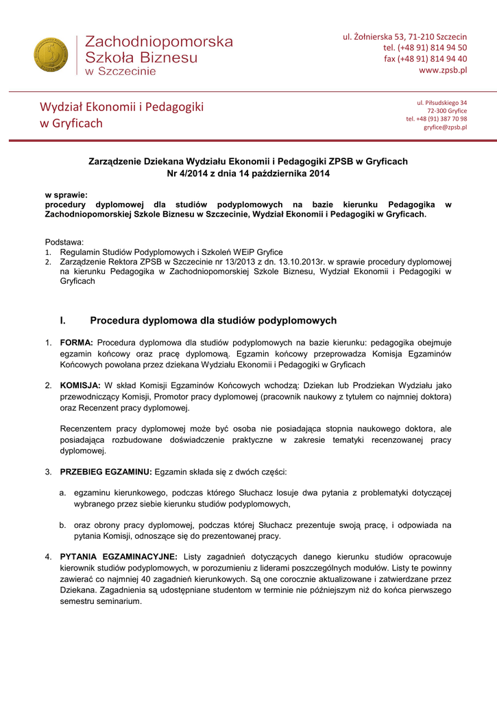 ul. Żołnierska 53, 71-210 Szczecin tel. (+48 91) 814 94 50 fax (+48 91) 814 94 40 www.zpsb.pl Wydział Ekonomii i Pedagogiki w Gryficach ul. Piłsudskiego 34 72-300 Gryfice tel. +48 (91) 387 70 98 [email protected] Zarządzenie Dziekana Wydziału Ekonomii i Pedagogiki ZPSB w Gryficach Nr 4/2014 z dnia 14 października 2014 w sprawie: procedury dyplomowej dla studiów podyplomowych na bazie kierunku Pedagogika Zachodniopomorskiej Szkole Biznesu w Szczecinie, Wydział Ekonomii i Pedagogiki w Gryficach. w Podstawa: 1. Regulamin Studiów Podyplomowych i Szkoleń WEiP Gryfice 2. Zarządzenie Rektora ZPSB w Szczecinie nr 13/2013 z dn. 13.10.2013r. w sprawie procedury dyplomowej na kierunku Pedagogika w Zachodniopomorskiej Szkole Biznesu, Wydział Ekonomii i Pedagogiki w Gryficach I. Procedura dyplomowa dla studiów podyplomowych 1. FORMA: Procedura dyplomowa dla studiów podyplomowych na bazie kierunku: pedagogika obejmuje egzamin końcowy oraz pracę dyplomową. Egzamin końcowy przeprowadza Komisja Egzaminów Końcowych powołana przez dziekana Wydziału Ekonomii i Pedagogiki w Gryficach 2. KOMISJA: W skład Komisji Egzaminów Końcowych wchodzą: Dziekan lub Prodziekan Wydziału jako przewodniczący Komisji, Promotor pracy dyplomowej (pracownik naukowy z tytułem co najmniej doktora) oraz Recenzent pracy dyplomowej. Recenzentem pracy dyplomowej może być osoba nie posiadająca stopnia naukowego doktora, ale posiadająca rozbudowane doświadczenie praktyczne w zakresie tematyki recenzowanej pracy dyplomowej. 3. PRZEBIEG EGZAMINU: Egzamin składa się z dwóch części: a. egzaminu kierunkowego, podczas którego Słuchacz losuje dwa pytania z problematyki dotyczącej wybranego przez siebie kierunku studiów podyplomowych, b. oraz obrony pracy dyplomowej, podczas której Słuchacz prezentuje swoją pracę, i odpowiada na pytania Komisji, odnoszące się do prezentowanej pracy. 4. PYTANIA EGZAMINACYJNE: Listy zagadnień dotyczących danego kierunku studiów opracowuje kierownik studiów podyplomowych, w porozumieniu z liderami poszczególnych modułów. Listy te powinny zawierać co najmniej 40 zagadnień kierunkowych. Są one corocznie aktualizowane i zatwierdzane przez Dziekana. Zagadnienia są udostępniane studentom w terminie nie późniejszym niż do końca pierwszego semestru seminarium. ul. Żołnierska 53, 71-210 Szczecin tel. (+48 91) 814 94 50 fax (+48 91) 814 94 40 www.zpsb.pl Wydział Ekonomii i Pedagogiki w Gryficach ul. Piłsudskiego 34 72-300 Gryfice tel. +48 (91) 387 70 98 [email protected] II. Wytyczne dotyczące pracy dyplomowej 1. FORMA a/ Praca dyplomowa jest pracą samodzielną, tworzoną pod kierunkiem i nadzorem promotora (opiekuna naukowego). Istotą pracy dyplomowej jest powiązanie jej tematu z kierunkiem studiów podyplomowych. b/ W pracy dyplomowej autor musi wykazać się umiejętnością samodzielnego przeprowadzenia określonego procesu intelektualnego, opartego na znajomości literatury przedmiotu i własnym wysiłku twórczym. c/ Praca dyplomowa może mieć charakter: a. systematyzujący - w zakresie przedstawiania poglądów pedagogicznych, b. badawczy - wykrywając nowe zależności, nowe aspekty zjawisk pedagogicznych. d/ W każdym z przypadków powinna mieć osadzenie w praktyce zawodu. 2. POŻĄDANA STRUKTURA PRACY Praca powinna zawierać: a/ stronę tytułową zgodną z wzorem obowiązującym w Uczelni, spis treści, wstęp, rozdziały, a w nich podrozdziały pracy, zakończenie, bibliografię, spis wykresów, ewentualny aneks, b/ treść pracy dyplomowej powinna być zgodna z tytułem pracy, włączając również zgodność poszczególnych części pracy z ich tytułami, c/ wstęp: genezę i uzasadnienie tematu pracy, cel pracy, informacje o czym praca stanowi, opis treści poszczególnych rozdziałów, można podać krótkie, istotne informacje dla czytelnika pracy np.: na temat specyfiki tematu lub trudności związanych z pisaniem pracy, d/ aneks: narzędzia badawcze lub inne materiały, istotne do zaprezentowania w pracy, np. zestawienia tabelaryczne, fotografie itp, e/ analizę literatury, wyników badań własnych Słuchacza oraz wnioski. 3. FORMA PREZENTACJI a/ Praca dyplomowa powinna mieć od 20 do 40 stron ze wszystkimi częściami pracy; w szczególnych przypadkach może być dłuższa lub krótsza, zgodnie ze specyfiką tematu i decyzją promotora. b/ Należy złożyć 2 egzemplarze w wersji papierowej, w tym jeden egzemplarz wydrukowany dwustronnie w miękkiej oprawie oraz wersję elektroniczną na CD zapisaną w formacie Word). Pożądana jest również prezentacja (np. w standardzie Power Point, Flash, itp.). ul. Żołnierska 53, 71-210 Szczecin tel. (+48 91) 814 94 50 fax (+48 91) 814 94 40 www.zpsb.pl Wydział Ekonomii i Pedagogiki w Gryficach ul. Piłsudskiego 34 72-300 Gryfice tel. +48 (91) 387 70 98 [email protected] 4. WYMOGI METODYCZNE Przygotowanie pracy dyplomowej powinno ukształtować umiejętności: oceny dorobku teoretycznego w danej dyscyplinie, w szczególności w przypadku prac teoretycznych, samodzielnego poszukiwania materiałów źródłowych w istniejących opracowaniach naukowych, diagnozowania i oceny problemu w badanym podmiocie, zaprojektowania nowych rozwiązań lub modyfikacji istniejących, identyfikacji i analizowania obserwowanych zjawisk pedagogicznych, zwłaszcza tych, z którymi absolwent będzie miał do czynienia w praktyce, f/ dostrzegania prawidłowości występujących w obrębie tych zjawisk, g/ wyciągania właściwych wniosków, h/ czynnego posługiwania się nabytą w czasie studiów wiedzą i wykorzystania jej w zastosowaniu do praktyki lub do wnioskowania teoretycznego, i/ osadzenia problemu w literaturze, j/ prowadzenia logicznego toku wywodów, k/ posługiwania się jasnym i precyzyjnym językiem. a/ b/ c/ d/ e/ 5. WERYFIKACJA Praca dyplomowa jest oceniana przez promotora i przez recenzenta. 6. ROLA PROMOTORA a/ Temat pracy dyplomowej musi być zaakceptowany przez promotora, który ustala tak