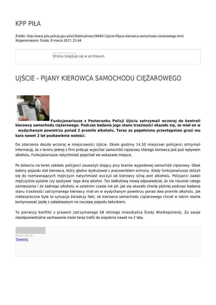 KPP PIŁA Źródło: http://www.pila.policja.gov.pl/w19/aktualnosci/94947,Ujscie-Pijany-kierowca-samochodu-ciezarowego.html Wygenerowano: Środa, 8 marca 2017, 21:44 Strona znajduje się w archiwum. UJŚCIE - PIJANY KIEROWCA SAMOCHODU CIĘŻAROWEGO Funkcjonariusze z Posterunku Policji Ujściu zatrzymali wczoraj do kontroli kierowcę samochodu ciężarowego. Podczas badania jego stanu trzeźwości okazało się, że miał on w wydychanym powietrzu ponad 2 promile alkoholu. Teraz za popełnione przestępstwo grozi mu kara nawet 2 lat pozbawienia wolości. Do zdarzenia doszło wczoraj w miejscowości Ujście. Około godziny 14.30 miejscowi policjanci otrzymali informację, że z terenu jednej z firm próbuje wyjechać samochód ciężarowy którego kierowca jest pod wpływem alkoholu. Funkcjonariusze natychmiast pojechali we wskazane miejsce. Po dotarciu na teren zakładu policjanci zauważyli stojący przy bramie wyjazdowej samochód ciężarowy. Obok kabiny pojazdu stał kierowca, który głośno dyskutował z pracownikiem ochrony. Kiedy funkcjonariusze zbliżyli się do rozmawiających mężczyzn natychmiast wyczuli od kierowcy silną woń alkoholu. Policjanci zadali mężczyźnie pytanie czy spożywał tego dnia alkohol. Ten bełkotliwą mową odpowiedział, że nie rozumie całego zamieszania i że żadnego alkoholu w ostatnim czasie nie pił. Jak się okazało chwilę później podczas badania stanu trzeźwości zatrzymanego kierowcy miał on w wydychanym powietrzu ponad dwa promile alkoholu. Jak niebezpieczna była to sytuacja świadczy fakt, że kierowca samochodu ciężarowego chciał w takim stanie kontynuować jazdę z załadowanym na naczepę pojazdu ładunkiem. To pierwszy konflikt z prawem zatrzymanego 58 letniego mieszkańca Środy Wielkopolskiej. Za swoje nieodpowiedzialne zachowanie może teraz trafić do więzienia nawet na 2 lata. Ocena: 0/5 (0) Tweetnij