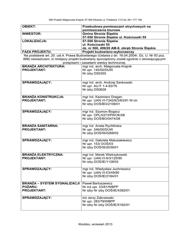 MD Projekt Małgorzata Krajnik 57-300 Kłodzko ul. Połabska 1/12 tel. 601 777 156 OBIEKT: Przebudowa pomieszczeń strychowych na pomieszczenia biurowe INWESTOR: Gmina Stronie Śląskie 57-550 Stronie Śląskie ul. Kościuszki 55 LOKALIZACJA: 57-550 Stronie Śląskie ul. Kościuszki 55 dz. nr 500, 499/20 AM-8, obręb Stronie Śląskie FAZA PROJEKTU: Projekt budowlano-wykonawczy Na podstawie art. 20. ust.4. Prawa Budowlanego (Ustawa z dn. 16.04.2004r. Dz. U. Nr 93 poz. 888) oświadczam, iż niniejszy projekt budowlany sporządzony został zgodnie z obowiązującymi przepisami i zasadami wiedzy technicznej. BRANŻA ARCHITEKTURA: mgr inż. arch. Małgorzata Krajnik PROJEKTANT: Nr upr. 145/00/DUW Nr izby DS0355 SPRAWDZAJĄCY: mgr inż. arch. Andrzej Sankowski Nr upr. AU-F 1-4-83/79 Nr izby DS0628 BRANŻA KONSTRUKCJA: PROJEKTANT: mgr inż. Kazimierz Dragan Nr upr. UAN VI-7342/6/3/63/91 W-ch Nr izby DOŚ/BO/2109/01 SPRAWDZAJĄCY: mgr inż. Szymon Bogacz Nr upr. OPL/0373/PWOK/08 Nr izby DOŚ/BO/0474/08 BRANŻA SANITARNA: PROJEKTANT: mgr inż. Aneta Rychlińska Nr upr. 346/00/DUW Nr izby DOŚ/IS/0268/02 SPRAWDZAJĄCY: mgr inż. Gabriela Matusiakiewicz Nr upr. 153/ DOŚ/03 Nr izby DOŚ/IS/2039/01 BRANŻA ELEKTRYCZNA: PROJEKTANT: mgr inż. Marek Wietrzykowski Nr upr. UAN.VI-6/3/125/90 Nr izby DOŚ/IE/1128/02 SPRAWDZAJĄCY: mgr inż. Władysław Juchniewicz Nr upr. UAN.VI-f/3/49/90 Nr izby DOŚ/IE/2184/01 BRANŻA – SYSTEM SYGNALIZACJI Paweł Bartoszewicz POŻARU: Nr inż upr. 53/81/WBPP PROJEKTANT: Nr izby Nr izby DOŚ/IE/4392/01 SPRAWDZAJĄCY: inż Jerzy Zakrzewski Nr upr. 283/79/WBPP Nr izby Nr izby DOŚ/IE/5182/01 Kłodzko, wrzesień 2013 2 SPIS ZAWARTOŚCI PROJEKTU BUDOWLANEGO: I. Część ogólna z częścią architektoniczną: 1.część opisowa: Str. nr 1 Str. nr 2-3 Metryka projektu wraz z oświadczeniem projektanta i sprawdzającego o wykonaniu projektu zgodnie z obowiązującymi przepisami Zawartość opracowania Str. nr 4-13 Opis techniczny. Str. nr 13-15 Informacja BIOZ Str. nr 16 Spis załączników Str. nr 17-19 Zaświadczenie o przynależności do właściwej izby samorządu zawodowego oraz decyzja o nadaniu uprawnień budowlanych 2.część rysunkowa: Rys. nr 1 – Plan sytuacyjny. Skala 1:500 Rys. nr 2/A – Rzut parteru. Skala 1:75 Rys. nr 3/A – Rzut II piętra. Skala 1:50 Rys. nr 4/A – Rzut dachu. Skala 1:50 Rys. nr 5/A – Przekrój A-A. Skala 1:50 Rys. nr 6/A – Przekroje A-A, B-B. Skala 1:50 Rys. nr 7/A – Elewacja zachodnia. Skala 1:100 Rys. nr 8/A – Elewacja południowa. Skala 1:100 Rys. nr 9/A – Elewacja wschodnia. Skala 1:100 Rys. nr 10/A - Detale lukarny – rzut. Skala 1:25 Rys. nr 11/A - Detale lukarny – przekroje 1-1, 2-2. Skala 1:25 Rys. nr 12/A – Przekrój przez ściankę czołową lukarny. Skala 1:25 II. Część konstrukcyjna: 1. część opisowa: Str. nr 1 Strona tytułowa Str. nr 2-3 Ekspertyza stanu technicznego budynku. Str. nr 4-25 Str. nr 26-29 Opis techniczny rozwiązań konstrukcyjnych wraz z obliczeniami statyczno-wytrzymałościowymi Zaświadczenie o przynależności do właściwej izby samorządu zawodowego oraz decyzja o nadaniu uprawnień budowlanych 2.część rysunkowa: Rys. nr 1/K – Wzmocnienia stropu nad I piętrem Skala 1:50 Rys. nr 2/K – Szczegóły konstrukcyjne wzmocnienia stropu nad I piętrem. III. Część sanitarna: Skala 1:15 1.część opisowa: Str. nr 1 Strona tytułowa 3 Str. nr 2-6 Opis techniczny Str. nr 7-8 Zaświadczenie o przynależności do właściwej izby samorządu zawodowego oraz decyzja o nadaniu uprawnień budowlanych 2.część rysunkowa: Rys. nr 1/S – Rzut piwnicy – instalacje sanitarne. Skala 1:100 Rys. nr 2/S – Rzut parteru – instalacje sanitarne. Skala 1:100 Rys. nr 3/S – Rzut I piętra – instalacje sanitarne. Skala 1:100 Rys. nr 4/S – Rzut II pietra – instalacje sanitarne Skala 1:75 IV. Część elektryczna: 1.część opisowa: Str. nr 1 Strona tytułowa Str. nr 2 Spis treści Str. nr 3-7 Opis techniczny Str. nr 8-11 Zaświadczenie o przynależności do właściwej izby samorządu zawodowego oraz decyzja o nadaniu uprawnień budowlanych 2.część rysunkowa: Rys. nr 1/E – Rzut piwnicy – instalacje elektryczne. Skala 1:100 Rys. nr 2/E – Rzut parteru – instalacje elektryczne. Skala 1:100 Rys. nr 3/E – Rzut I piętra – instalacje elektryczne. Skala 1:100 Rys. nr 4/E – Rzut II piętra – instalacje elektryczne. Skala 1:75 Rys. nr 5/E – Rzut dachu – instalacje elektryczne. Skala 1:100 V. System sygnalizacji pożaru: 1.część opisowa: Str. nr 1 Strona tytułowa ze spisem treści Str. nr 2-17 Opis techniczny Str. nr 18-23 Zaświadczenie o przynależności do właściwej izby samorządu zawodowego oraz decyzja o nadaniu uprawnień budowlanych 2.część rysunkowa: Rys. nr 1/SSP – Rzut piwnicy – instalacja SSP Skala 1:100 Rys. nr 2/SSP – Rzut parteru – instalacja SSP Skala 1:100 Rys. nr 3/SSP – Rzut I piętra – instalacja SSP Skala 1:100 Rys. nr 4/SSP – Rzut II piętra – instalacja SSP Skala 1:100 Rys. nr 5/SSP – Schemat ideowy SSP Skala 1:100 4 OPIS TECHNICZNY I. Opis do projektu zagospodarowania działki budowlanej 1. Dane ewidencyjne 1.Dane ogólne: 1.1.Obiekt: Przebudowa pomieszczeń strychowych na pomieszczenia biurowe. 1.2.Adres: 57-550 Stronie Śląskie, ul. Kościuszki 55, dz. nr 500, 499/20, AM-8, obręb Stronie Śląskie. 1.3.Inwestor: Gmina Stronie Śląskie 57-550 Stronie Śląskie ul. Kościuszki 55. 1.4.Faza: Projekt budowlano-wykonawczy. 2. Cel i przedmiot inwestycji Projekt nie spowoduje zmian w sposobie zagospodarowania terenu. Projekt przewiduje przebudowę części strychu nieużytkowego położonego na II kondygnacji budynku Urzędu Miejskiego w Stroniu Śląskim. W wyniku przebudowy powstaną trzy dodatkowe pomieszczenia biurowe. Dodatkowo przewidziano dobudowę w istniejącym dachu lukarny – miejsce montażu zegara wieżowego. Zostanie wymienione pokrycie dachowe – na materiał imitujący łupek kamienny – dachówka aluminiowa