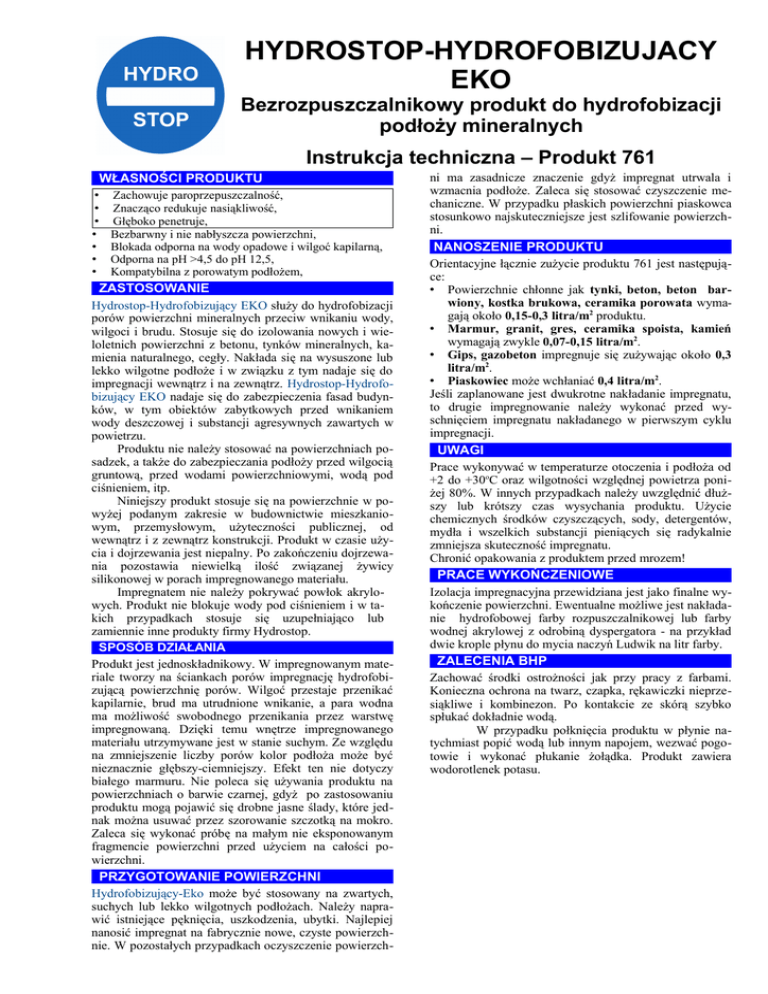 HYDROSTOP-HYDROFOBIZUJACY EKO Bezrozpuszczalnikowy produkt do hydrofobizacji podłoży mineralnych Instrukcja techniczna – Produkt 761 WŁASNOŚCI PRODUKTU • • • • • • • Zachowuje paroprzepuszczalność, Znacząco redukuje nasiąkliwość, Głęboko penetruje, Bezbarwny i nie nabłyszcza powierzchni, Blokada odporna na wody opadowe i wilgoć kapilarną, Odporna na pH >4,5 do pH 12,5, Kompatybilna z porowatym podłożem, ZASTOSOWANIE Hydrostop-Hydrofobizujący EKO służy do hydrofobizacji porów powierzchni mineralnych przeciw wnikaniu wody, wilgoci i brudu. Stosuje się do izolowania nowych i wieloletnich powierzchni z betonu, tynków mineralnych, kamienia naturalnego, cegły. Nakłada się na wysuszone lub lekko wilgotne podłoże i w związku z tym nadaje się do impregnacji wewnątrz i na zewnątrz. Hydrostop-Hydrofobizujący EKO nadaje się do zabezpieczenia fasad budynków, w tym obiektów zabytkowych przed wnikaniem wody deszczowej i substancji agresywnych zawartych w powietrzu. Produktu nie należy stosować na powierzchniach posadzek, a także do zabezpieczania podłoży przed wilgocią gruntową, przed wodami powierzchniowymi, wodą pod ciśnieniem, itp. Niniejszy produkt stosuje się na powierzchnie w powyżej podanym zakresie w budownictwie mieszkaniowym, przemysłowym, użyteczności publicznej, od wewnątrz i z zewnątrz konstrukcji. Produkt w czasie użycia i dojrzewania jest niepalny. Po zakończeniu dojrzewania pozostawia niewielką ilość związanej żywicy silikonowej w porach impregnowanego materiału. Impregnatem nie należy pokrywać powłok akrylowych. Produkt nie blokuje wody pod ciśnieniem i w takich przypadkach stosuje się uzupełniająco lub zamiennie inne produkty firmy Hydrostop. SPOSÓB DZIAŁANIA Produkt jest jednoskładnikowy. W impregnowanym materiale tworzy na ściankach porów impregnację hydrofobizującą powierzchnię porów. Wilgoć przestaje przenikać kapilarnie, brud ma utrudnione wnikanie, a para wodna ma możliwość swobodnego przenikania przez warstwę impregnowaną. Dzięki temu wnętrze impregnowanego materiału utrzymywane jest w stanie suchym. Ze względu na zmniejszenie liczby porów kolor podłoża może być nieznacznie głębszy-ciemniejszy. Efekt ten nie dotyczy białego marmuru. Nie poleca się używania produktu na powierzchniach o barwie czarnej, gdyż po zastosowaniu produktu mogą pojawić się drobne jasne ślady, które jednak można usuwać przez szorowanie szczotką na mokro. Zaleca się wykonać próbę na małym nie eksponowanym fragmencie powierzchni przed użyciem na całości powierzchni. PRZYGOTOWANIE POWIERZCHNI Hydrofobizujący-Eko może być stosowany na zwartych, suchych lub lekko wilgotnych podłożach. Należy naprawić istniejące pęknięcia, uszkodzenia, ubytki. Najlepiej nanosić impregnat na fabrycznie nowe, czyste powierzchnie. W pozostałych przypadkach oczyszczenie powierzch- ni ma zasadnicze znaczenie gdyż impregnat utrwala i wzmacnia podłoże. Zaleca się stosować czyszczenie mechaniczne. W przypadku płaskich powierzchni piaskowca stosunkowo najskuteczniejsze jest szlifowanie powierzchni. NANOSZENIE PRODUKTU Orientacyjne łącznie zużycie produktu 761 jest następujące: • Powierzchnie chłonne jak tynki, beton, beton barwiony, kostka brukowa, ceramika porowata wymagają około 0,15-0,3 litra/m2 produktu. • Marmur, granit, gres, ceramika spoista, kamień wymagają zwykle 0,07-0,15 litra/m2. • Gips, gazobeton impregnuje się zużywając około 0,3 litra/m2. • Piaskowiec może wchłaniać 0,4 litra/m2. Jeśli zaplanowane jest dwukrotne nakładanie impregnatu, to drugie impregnowanie należy wykonać przed wyschnięciem impregnatu nakładanego w pierwszym cyklu impregnacji. UWAGI Prace wykonywać w temperaturze otoczenia i podłoża od +2 do +30oC oraz wilgotności względnej powietrza poniżej 80%. W innych przypadkach należy uwzględnić dłuższy lub krótszy czas wysychania produktu. Użycie chemicznych środków czyszczących, sody, detergentów, mydła i wszelkich substancji pieniących się radykalnie zmniejsza skuteczność impregnatu. Chronić opakowania z produktem przed mrozem! PRACE WYKOŃCZENIOWE Izolacja impregnacyjna przewidziana jest jako finalne wykończenie powierzchni. Ewentualne możliwe jest nakładanie hydrofobowej farby rozpuszczalnikowej lub farby wodnej akrylowej z odrobiną dyspergatora - na przykład dwie krople płynu do mycia naczyń Ludwik na litr farby. ZALECENIA BHP Zachować środki ostrożności jak przy pracy z farbami. Konieczna ochrona na twarz, czapka, rękawiczki nieprzesiąkliwe i kombinezon. Po kontakcie ze skórą szybko spłukać dokładnie wodą. W przypadku połknięcia produktu w płynie natychmiast popić wodą lub innym napojem, wezwać pogotowie i wykonać płukanie żołądka. Produkt zawiera wodorotlenek potasu. DANE TECHNICZNE Hydrostop-Hydrofobizujący EKO 761 Nazwa i nr.: Rodzaj prod.: bezrozrozpuszczalnikowy produkt do hydrofobizacj podłoży mineralnych, Postać: płyn bez zapachu, bezbarwny lub słomkowy Podłoże: beton, tynki, kamień naturalny łupany i szlifowany, płytki gresu matowe lub błyszczące, ceramika niepowlekaną i szkliwioną, cegły, bloczki, gazobeton, zaprawy, Orientacyjne zużycie: 0,1 do 0,4litra/m2 w zależności od chłonności i krotności nanoszenia, (w celu dokładnego określenia zużycia należy przeprowadzić próbę stosowania). Wielkość opakowania: plastikowe kanistry 10 litrów, Gęstość objętościowa: 0,99 kg/dm3±2% Temperatura stosowania i składowania: +2C do +30C Odporność na: wody gruntowe agresywności XA2, woda deszczowa, pitna, rzek, jezior i rowów melioracyjnych. Odporność na deszcz: po ok. 6 godz. Euroklasa reakcji na ogień: F, Czasy harmonogramowe: Czas między kolejnymi impregnacjami: przed wyschnięciem ostatnio nakładanej partii impregnatu, Czas sezonowania: po nałożeniu całej masy impregnatu 4h w przewiewie i bez namaczania, Okres przydatności: w całych