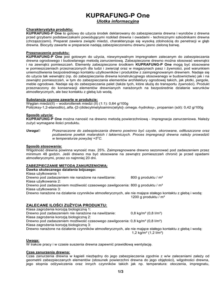 KUPRAFUNG-P One Ulotka informacyjna Charakterystyka produktu: KUPRAFUNG-P One to gotowy do użycia środek deklarowany do zabezpieczania drewna i wyrobów z drewna przed grzybami podstawczakami powodującymi rozkład drewna i owadami - technicznymi szkodnikami drewna (chrząszczami). Preparat zawiera związki miedzi, charakteryzuje się wysoką zdolnością do penetracji w głąb drewna. Biocydy zawarte w preparacie nadają zabezpieczonemu drewnu jasno zieloną barwę. Przeznaczenie produktu: KUPRAFUNG-P One jest gotowym do użycia, niewymywalnym impregnatem zalecanym do zabezpieczania drewna ogrodowego i budowlanego metodą zanurzeniową. Zabezpieczone drewno można stosować wewnątrz i na zewnątrz pomieszczeń. Elementy zabezpieczone środkiem KUPRAFUNG-P One mogą być stosowane w pomieszczeniach przeznaczonych dla ludzi i zwierząt oraz w magazynach pasz i żywności, pod warunkiem uniemożliwienia bezpośredniego kontaktu użytkowników i produktów z zaimpregnowanym drewnem. Nadaje się do użycia tak wewnątrz (np. do zabezpieczania drewna konstrukcyjnego stosowanego w budownictwie) jak i na zewnątrz pomieszczeń, w tym do zabezpieczania elementów architektury ogrodowej takich, jak płotki, pergole, meble ogrodowe. Nadaje się do zabezpieczania palet (także tych, które służą do transportu żywności). Produkt przeznaczony do konserwacji elementów drewnianych narażonych na bezpośrednie działanie warunków atmosferycznych, ale bez kontaktu z glebą lub wodą. Substancje czynne zawarte w produkcie: Węglan miedzi(II) – wodorotlenek miedzi (II) (1:1): 0,64 g/100g Poli(oksy-1,2-etanodilo),.alfa.-[2-(didecylmetyloamino)etylo]-.omega.-hydroksy-, propanian (sól): 0,42 g/100g Sposób użycia: KUPRAFUNG-P One można nanosić na drewno metodą powierzchniową - impregnacja zanurzeniowa. Należy zużyć wymagane ilości produktu. Uwaga!: Przeznaczone do zabezpieczania drewno powinno być czyste, okorowane, odtłuszczone oraz pozbawione powłok malarskich i lakierniczych. Proces impregnacji drewna należy prowadzić o w temperaturze powyżej +5 C. Sposób stosowania: Wilgotność drewna powinna wynosić max. 25%. Zaimpregnowane drewno sezonować pod zadaszeniem przez minimum 48 godzin. Jeśli drewno ma być stosowane na zewnątrz pomieszczeń chronić je przed opadami atmosferycznymi, przez co najmniej 20 dni. ZABEZPIECZANIE METODĄ ZANURZENIOWĄ: Dawka skutecznego działania bójczego: Klasa użytkowania 1: Drewno pod zadaszeniem nie narażone na nawilżanie: 800 g produktu / m² Klasa użytkowania 2: Drewno pod zadaszeniem możliwość czasowego zawilgocenia: 800 g produktu / m² Klasa użytkowania 3: Drewno narażone na działanie czynników atmosferycznych, ale nie mające stałego kontaktu z glebą i wodą: 1200 g produktu / m² ZALECANE ILOŚCI ZUŻYCIA PRODUKTU: Klasa zagrożenia korozją biologiczną 1: Drewno pod zadaszeniem nie narażone na nawilżanie: 0,8 kg/m² (0,8 l/m²) Klasa zagrożenia korozją biologiczną 2: Drewno pod zadaszeniem możliwość czasowego zawilgocenia: 0,8 kg/m² (0,8 l/m²) Klasa zagrożenia korozją biologiczną 3: Drewno narażone na działanie czynników atmosferycznych, ale nie mające stałego kontaktu z glebą i wodą: 1,2 kg/m² (1,2 l/m²) Uwaga: W trakcie pracy i w czasie suszenia drewna zapewnić prawidłową wentylację. Czas zanurzenia drewna: Czas zanurzenia drewna w kąpieli niezbędny do jego zabezpieczenia zgodnie z w/w zaleceniami zależy od geometrii zabezpieczanych elementów (stosunek powierzchni drewna do jego objętości), wilgotności drewna, jego stopnia odżywiczenia oraz innych czynników takich jak np. temperatura: otoczenia, impregnatu, 1/3 zabezpieczanego drewna. Ilość wchłoniętego środka zależy również od proporcji drewna bielastego w stosunku do drewna twardzielowego. Drewno twardzielowe jest trudno nasycalne. Czas zanurzenia należy kontrolować na bieżąco obserwując ubytek roztworu roboczego. Im dłuższy będzie czas zanurzenia tym głębiej drewno zostanie zabezpieczone. Składowanie zabezpieczonego drewna: Wilgotność drewna powinna wynosić max. 25%. Bezpośrednio po impregnacji preparat nie jest utrwalony w drewnie i ulega wymywaniu, dlatego też zabezpieczone elementy należy chronić przed opadami atmosferycznymi przez minimum 48 godzin. Utrwalenie preparatu w wymagane dla zastosowań w klasie o zagrożenia 3 osiąga się po 20 dniach. Przy temperaturze otoczenia poniżej 5 C podane czasy należy wydłużyć (szybkość utrwalania preparatu zależy od temperatury i spada mniej więcej dwukrotnie na każdy spadek o temperatury o 10 C). Składowanie produktu: KUPRAFUNG-P One oraz jego roztwory należy przechowywać w pojemnikach w taki sposób, aby nie miały do nich dostępu osoby niepowołane, a w szczególności dzieci. Należy stosować się do przepisów o składowaniu substancji zagrażających wodom gruntowym i powierzchniowym oraz glebie. Nie wolno dopuścić, aby preparat przedostał się do gleby, wód gruntowych czy powierzchniowych. Preparat należy przechowywać o w temperaturze powyżej 0 C. Postępowanie z odpadami produktu i opakowaniami: Odpady produktu: Odpad produktu jest odpadem niebezpiecznym, jeżeli to możliwe należy go odzyskać i zawrócić do produkcji. Nie utylizować razem z odpadami komunalnymi. Nie usuwać do kanalizacji. Nie dopuszczać do zanieczyszczenia wód powierzchniowych, gruntowych i gleby. Utylizować zgodnie z obowiązującymi aktualnie przepisami odnoszącymi się do niebezpiecznych odpadów chemicznych. Poddać unieszkodliwieniu, wyłącznie w miejscach wyznaczonych, w instalacjach lub urządzeniach spełniających ustawowe wymagania. Opakowanie: Po dokładnym opróżnieniu i wymyciu traktować jak opakowania po użyciu nie stwarzające zagrożenia i mogące być składowane na wysypisku odpadów komunalnych. W innym przypadku przekazać do utylizacji przedsiębiorstwom wyspecjalizowanym w utylizacji odpadów opakowaniowych. Popłuczyny po myciu opa