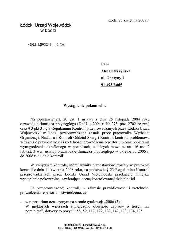 Łódź, 28 kwietnia 2008 r. Łódzki Urząd Wojewódzki w Łodzi ON.III.0932-1- 42 /08 Pani Alina Styczyńska ul. Gontyny 7 91-493 Łódź Wystąpienie pokontrolne Na podstawie art. 20 ust. 1 ustawy z dnia 25 listopada 2004 roku o zawodzie tłumacza przysięgłego (Dz.U. z 2004 r. Nr 273, poz. 2702 ze zm.) oraz § 3 pkt 3 i § 9 Regulaminu Kontroli przeprowadzanych przez Łódzki Urząd Wojewódzki w Łodzi przeprowadzona została przez pracownika Wydziału Organizacji, Nadzoru i Kontroli Oddział Skarg i Kontroli kontrola problemowa w zakresie prawidłowości i rzetelności prowadzenia repertorium oraz pobierania wynagrodzenia określonego w przepisach, o których mowa w art. 16 ust. 2 lub ust. 3 ww. ustawy o zawodzie tłumacza przysięgłego w okresie od 2006 r. do 2008 r. do dnia kontroli. W związku z kontrolą, której wyniki przedstawione zostały w protokole kontroli z dnia 11 kwietnia 2008 roku, na podstawie § 23 Regulaminu Kontroli przeprowadzanych przez Łódzki Urząd Wojewódzki przekazuję niniejsze wystąpienie pokontrolne, zawierające ocenę kontrolowanej działalności. Po przeprowadzonej kontroli, w zakresie prawidłowości i rzetelności prowadzenia repertorium stwierdzono, że: w repertorium oznaczonym na stronie tytułowej: „2006 (2)”: W niektórych wierszach stwierdzono obecność zapisów o treści: „nr pominięte”, dotyczy to pozycji: 58, 59, 117, 122, 133, 143, 173, 174, 175. 90-926 ŁÓDŹ, ul. Piotrkowska 104 tel. (+48 42) 664 12 82, fax (+48 42) 664 11 60 Powyżej poz. 210 znajduje się wpis o numerze poz. 209, gdzie opisano tłumaczenie zleceniodawcy innego niż wymienieni w art. 15 ustawy o zawodzie tłumacza przysięgłego, a poniżej poz. 210 znajduje się wpis o numerze poz. 209, gdzie opisano tłumaczenie dla zleceniodawcy wymienionego w art. 15 cyt. ustawy. Na kolejnych trzech kartach po poz. 290/2006 oznaczono wpisy następującymi po sobie numerami pozycji: 291/2006, 292/2006, 293/2006, 294/2006, 295/2006, 291/2006, 290/2006, 298/2006, 299/2006, 294/2006, zapis ołówkiem: „powtórzone numery”, 295/2006, 296/2006, 297/2006, 300/2006, 301/2006, zapis ołówkiem: „pom. w numeracji vide poprzednia str.”, w repertorium oznaczonym na stronie tytułowej: „2006 (3)”: Znajdują się wpisy od poz. 540 z dnia 07.07. do poz. 689 z dnia 01.09., następnie dopięto cztery luźne nie ponumerowane kartki formatu A4 zawierające pozycje: kartka – poz. 684 z dnia 03.09., poz. 685 z dnia 03.09., poz. 686 z dnia 03.09., poz. 687 z dnia 03.09. i poz. 688 z dnia 03.09.; kartka – poz. 679 z dnia 01.09., poz. 680 z dnia 01.09., poz. 681 z dnia 01.09., poz. 682 z dnia 02.09 i poz. 683 z dnia 02.09.; kartka – poz. 674 z dnia 01.09., poz. 675 z dnia 01.09., poz. 676 z dnia 01.09, poz. 677 z dnia 01.09. i poz. 678 z dnia 01.09.; kartka – poz. 688 z dnia 01.09., poz. 670 z dnia 01.09., poz. 671 z dnia 01.09., poz. 672 z dnia 01.09. i poz. 673 z dnia 01.09. Z lewej strony zapis wykonany ołówkiem: „powtórzone numery”. Kartki te są zadrukowane po jednej stronie i zawierają kolumny jak w księdze repertorium od 1 do 10, gdzie znajdują się rubryki: l.p.; data zlecenia; zleceniodawca; opis tłumaczonego dokumentu; oznaczenie czynności. W powyższych księgach repertorium, jak i w księgach oznaczonych: „2006 r.”, „2007(1)”, „2007(2)”, „2007 (3)”, „2008 r.” daty zlecenia zapisano w formie: dzień – miesiąc. Dane o zleceniodawcy często ograniczono do imienia i nazwiska/nazwy, czasami dodano zapis o miejscowości (np. poz. 57/2006, 60/2006, 199/2006, 291/2006 z dnia 19.04., 294/2006 z dnia 21.04. – numer pozycji słabo czytelny, 291/2006 z dnia 21.04., 294/2006 z dnia 23.04., 166/2007, 310/2007, 310A/2007, 918/2007, 44/2008). W żadnej z pozycji repertoriów nie naniesiono daty zwrotu dokumentu. Na okazanych kopiach poświadczonych tłumaczeń wymienione zostały pozycje, pod którą tłumaczenie jest odnotowane w repertorium, a także widnieją stwierdzenia: 90-926 ŁÓDŹ, ul. Piotrkowska 104 tel. (+48 42) 664 12 82, fax (+48 42) 664 11 60 w poz. 918/2007 - „Ja, niżej podpisany tłumacz przysięgły języka rosyjskiego i ukraińskiego przy Sądzie Okręgowym w Łodzi (TP 3335/05) poświadczam zgodność niniejszego tłumaczenia z przedstawioną mi poświadczoną za zgodność z oryginałem kopią dokumentu w języku rosyjskim i ukraińskim” - bez informacji, przez kogo kopia była poświadczona, w poz. 1066/07 - „Ja, niżej podpisany tłumacz przysięgły języka rosyjskiego i ukraińskiego przy Sądzie Okręgowym w Łodzi, poświadczam zgodność niniejszego tłumaczenia z przedstawioną mi kserokopią dokumentu w języku ukraińskim” - bez informacji, czy kopia była poświadczona i przez kogo, w poz. 41/08 - „Ja, niżej podpisany tłumacz przysięgły języka rosyjskiego i ukraińskiego przy Sądzie Okręgowym w Łodzi, poświadczam zgodność niniejszego tłumaczenia z przedstawioną mi kopią dokumentu w języku ukraińskim.” – bez informacji, czy kopia była poświadczona i przez kogo. W zakresie pobierania wynagrodzenia za czynności tłumacza przysięgłego wykonane na żądanie sądu, prokuratora, Policji oraz organów administracji publicznej stwierdzono: w poz. 1070/2007 z dnia 17.11. język, w którym dokument sporządzono: „pol.”, oznaczenie czynności: „tł. na j. ros.”, 3 strony, 1egzemplarz, pobrane wynagrodzenie: „90,24”, Rozporządzenie Ministra Sprawiedliwości z dnia 24 stycznia 2005 r. w sprawie wynagrodzenia za czynności tłumacza przysięgłego (Dz. U. z 2005 r. Nr 15, poz. 131 ze zm.) przewiduje: 30,07 zł x 3 strony = 90,21 zł, w poz. 97/2008 z dnia 04.02. język, w którym dokument sporządzono: „pol.”, oznaczenie czynności: „tł. na j. ros.”, 2 strony, 1 egzemplarz, pobrane wynagrodzenie: „60,16”, ww. rozporządzenie Ministra Sprawiedliwości przewiduje: 30,07 zł x 2 strony = 60,14 zł, w poz. 99/2008 z dnia 04.02. język, w którym dokument sporząd