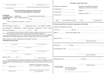 ......................................................................... ZAŚWIADCZENIE ................................................................ (nazwisko i imię członka PKZP) (jednostka organizacyjna, emeryt) ........................................................................ Pracownik naukowy/administracyjno-techniczny/obsługi*) (adres zamieszkania) Niniejszym stwierdzam, że: Na podstawie ksiąg PKZP stwierdzam następujący stan konta wnioskodawcy: wnioskodawca**) ......................................... Do Pracowniczej Kasy Zapomogowo-Pożyczkowej w Uniwersytecie Ekonomicznym w Katowicach wkłady zł .............................................................. 1.poręczyciel**) ........................................... niespłacone zobow. zł .......................................... WNIOSEK O UDZIELENIE POŻYCZKI uzupełniającej ratalnej – krótkoterminowej*) w kasie Uczelni/ przelew na konto*) Nr konta ...................................................................... 2.poręczyciel**) ........................................... ..................... .......................................... ..................... (data) (pieczęć Zakładu Pracy i podpis) (data) ........................................ (księgowy PKZP) Proszę o udzielenie mi pożyczki w kwocie zł .................................................................. (słownie ............................................................................................................................................), którą zobowiązuję się spłacić w ................ miesięcznych ratach – przy najbliższej wypłacie – Decyzją Zarządu Pracowniczej Kasy Zapomogowo-Pożyczkowej przyznano wnioskodawcy pożyczkę ................................................................................................... przez potrącenie z wynagrodzenia i zasiłku chorobowego wypłaconego mi przez Uczelnię, począwszy od miesiąca ............................................... 20........... roku.*) w kwocie zł ................................... (słownie ......................................................................................) W razie braku możliwości potrącenia raty pożyczki zobowiązuję się każdego miesiąca wpłacać ratę pożyczki w kasie Uczelni/na konto PKZP w ustalonej wysokości w terminie do 20 dni po otrzymaniu wynagrodzenia. W przypadku skreślenia mnie z listy członków PKZP wyrażam zgodę na pokrycie z moich wkładów i przypadającego mi wynagrodzenia za pracę oraz z zasiłku chorobowego całego zadłużenia wykazanego księgami Kasy oraz upoważniam Kasę do bezpośredniego podjęcia u każdego mojego pracodawcy kwoty równej temu zadłużeniu. płatną w ...................... ratach rozpoczynając od dnia ......................................................................... Średni miesięczny zarobek w ostatnich trzech miesiącach wyniósł zł ................................................ Proponuję jako poręczycieli: 1. ................................................................... Katowice, dnia ................................ ................................................................................... (podpisy Zarządu PKZP) ................................................... ( nazwisko i imię ) ( seria i nr dowodu osobistego ) Pożyczkę zł .............................(słownie .............................................................................................) ........................................................................................................................... ( adres zamieszkania) otrzymałem/łam w dniu ............................................... 2. ................................................................... ................................................... ( nazwisko i imię ) ( seria i nr dowodu osobistego ) ............................................................................................................................ ................................................................................... ( adres zamieszkania ) Katowice, dnia ..................20.......r. (podpis otrzymującego) ................................................... ( podpis wnioskodawcy) W razie nieuregulowania we właściwym terminie pożyczki zaciągniętej przez w/w wnioskodawcę wyrażamy zgodę jako solidarnie współzobowiązani, na pokrycie należnej Kasie kwoty z naszych wkładów i wynagrodzeń za pracę i upoważniamy Kasę do bezpośredniego podjęcia w takim przypadku u każdego naszego pracodawcy kwoty równej temu zadłużeniu. 1. ................................................................. stwierdzam, iż poręczyciele wymienieni w poz.1 i 2 złożyli podpisy w mojej obecności (podpis poręczyciela) .................................................................. 2. ................................................................. (podpis poręczyciela) (czytelny podpis pracownika Działu Spraw Pracowniczych i pieczęć Zakładu Pracy) Zaksięgowano dnia ....................................................... dowód nr ...................................................... .................................................................................. (podpis księgowego) *) niepotrzebne skreślić **) wpisać odpowiednio: jest pracownikiem stałym jest w okresie wypowiedzenia jest w okresie próbnym ____________________________________