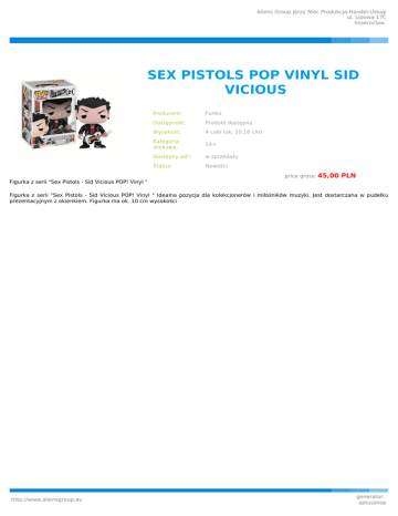 Aliens Group Jerzy Stec Produkcja-Handel-Usługi ul. Lipowa 17C Inowrocław SEX PISTOLS POP VINYL SID VICIOUS Producent: Funko Dostępność: Produkt dostępny Wysokość: 4 cale (ok. 10,16 cm) Kategoria wiekowa: 14+ Dostępny od*: w sprzedaży Status: Nowości price gross: 45,00 PLN Figurka z serii "Sex Pistols - Sid Vicious POP! Vinyl " Figurka z serii "Sex Pistols - Sid Vicious POP! Vinyl " Idealna pozycja dla kolekcjonerów i miłośników muzyki. Jest dostarczana w pudełku prezentacyjnym z okienkiem. Figurka ma ok. 10 cm wysokości http://www.aliensgroup.eu generator: aptusshop