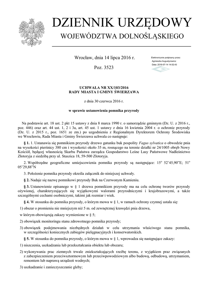 DZIENNIK URZĘDOWY WOJEWÓDZTWA DOLNOŚLĄSKIEGO Wrocław, dnia 14 lipca 2016 r. Elektronicznie podpisany przez: Agnieszka Augustynowicz Poz. 3523 Data: 2016-07-14 14:52:43 UCHWAŁA NR XX/103/2016 RADY MIASTA I GMINY ŚWIERZAWA z dnia 30 czerwca 2016 r. w sprawie ustanowienia pomnika przyrody Na podstawie art. 18 ust. 2 pkt 15 ustawy z dnia 8 marca 1990 r. o samorządzie gminnym (Dz. U. z 2016 r., poz. 446) oraz art. 44 ust. 1, 2 i 3a, art. 45 ust. 1 ustawy z dnia 16 kwietnia 2004 r. o ochronie przyrody (Dz. U. z 2015 r., poz. 1651 ze zm.) po uzgodnieniu z Regionalnym Dyrektorem Ochrony Środowiska we Wrocławiu, Rada Miasta i Gminy Świerzawa uchwala co następuje: § 1. 1. Ustanawia się pomnikiem przyrody drzewo gatunku buk pospolity Fagus sylvatica o obwodzie pnia na wysokości pierśnicy 380 cm i wysokości około 35 m, rosnącego na terenie działki nr 24/1005 obręb Nowy Kościół, będącej własnością Skarbu Państwa zarządca Gospodarstwo Leśne Lasy Państwowe Nadleśnictwo Złotoryja z siedzibą przy ul. Staszica 18, 59-500 Złotoryja. 2. Współrzędne geograficzne umiejscowienia pomnika przyrody są następujące: 15o 52’45,90”E; 51o 05’29,88”N 3. Położenie pomnika przyrody określa załącznik do niniejszej uchwały. § 2. Nadaje się nazwę pomnikowi przyrody Buk na Czerwonym Kamieniu. § 3. Ustanowienie opisanego w § 1 drzewa pomnikiem przyrody ma na celu ochronę tworów przyrody ożywionej, charakteryzujących się wyjątkowymi walorami przyrodniczymi i krajobrazowymi, a także szczególnymi cechami osobniczymi, takimi jak rozmiar i wiek. § 4. W stosunku do pomnika przyrody, o którym mowa w § 1, w ramach ochrony czynnej ustala się: 1) obszar o promieniu nie mniejszym niż 5 m. od zewnętrznej krawędzi pnia drzewa, w którym obowiązują zakazy wymienione w § 5; 2) obowiązek monitoringu stanu zdrowotnego pomnika przyrody; 3) obowiązek podejmowania niezbędnych działań w celu utrzymania właściwego stanu pomnika, w szczególności koniecznych zabiegów pielęgnacyjnych i konserwatorskich. § 5. W stosunku do pomnika przyrody, o którym mowa w § 1, wprowadza się następujące zakazy: 1) niszczenia, uszkadzania lub przekształcania obiektu lub obszaru; 2) wykonywania prac ziemnych trwale zniekształcających rzeźbę terenu, z wyjątkiem praz związanych z zabezpieczeniem przeciwsztormowym lub przeciwpowodziowym albo budową, odbudową, utrzymaniem, remontem lub naprawą urządzeń wodnych; 3) uszkadzanie i zanieczyszczanie gleby; Dziennik Urzędowy Województwa Dolnośląskiego –2– Poz. 3523 4) dokonywania zmian stosunków wodnych, jeżeli zmiany te nie służą ochronie przyrody albo racjonalnej gospodarce rolnej, leśnej, wodnej lub rybackiej; 5) zmiany sposobu użytkowania ziemi; 6) umieszczania tablic reklamowych. § 6. Nadzór nad pomnikiem przyrody sprawuje Burmistrz Miasta i Gminy Świerzawa. § 7. Wykonanie uchwały powierza się Burmistrzowi Miasta i Gminy Świerzawa. § 8. Uchwała wchodzi w życie po upływie 14 dni od dnia ogłoszenia w Dzienniku Urzędowym Województwa Dolnośląskiego. Przewodniczący Rady Miasta i Gminy Świerzawa: P. Kisowski Dziennik Urzędowy Województwa Dolnośląskiego –3– Poz. 3523 Załącznik do uchwały nr XX/103/2016 Rady Miasta i Gminy Świerzawa z dnia 30 czerwca 2016 r.