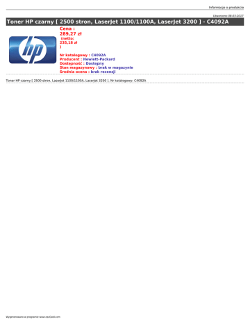 Informacje o produkcie Utworzono 08-03-2017 Toner HP czarny [ 2500 stron, LaserJet 1100/1100A, LaserJet 3200 ] - C4092A Cena : 289,27 zł (netto: 235,18 zł ) Nr katalogowy : C4092A Producent : Hewlett-Packard Dostępność : Dostępny Stan magazynowy : brak w magazynie Średnia ocena : brak recenzji Toner HP czarny [ 2500 stron, LaserJet 1100/1100A, LaserJet 3200 ]. Nr katalogowy: C4092A Wygenerowano w programie www.oscGold.com