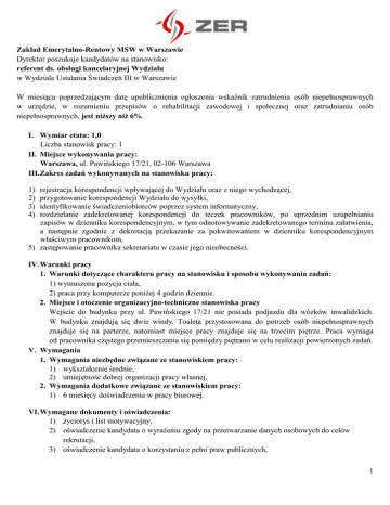 Zakład Emerytalno-Rentowy MSW w Warszawie Dyrektor poszukuje kandydatów na stanowisko: referent ds. obsługi kancelaryjnej Wydziału w Wydziale Ustalania Świadczeń III w Warszawie W miesiącu poprzedzającym datę upublicznienia ogłoszenia wskaźnik zatrudnienia osób niepełnosprawnych w urzędzie, w rozumieniu przepisów o rehabilitacji zawodowej i społecznej oraz zatrudnianiu osób niepełnosprawnych, jest niŜszy niŜ 6%. I. Wymiar etatu: 1,0 Liczba stanowisk pracy: 1 II. Miejsce wykonywania pracy: Warszawa, ul. Pawińskiego 17/21, 02-106 Warszawa III. Zakres zadań wykonywanych na stanowisku pracy: 1) 2) 3) 4) rejestracja korespondencji wpływającej do Wydziału oraz z niego wychodzącej, przygotowanie korespondencji Wydziału do wysyłki, identyfikowanie świadczeniobiorców poprzez system informatyczny, rozdzielanie zadekretowanej korespondencji do teczek pracowników, po uprzednim uzupełnianiu zapisów w dzienniku korespondencyjnym, w tym odnotowywanie zadekretowanego terminu załatwienia, a następnie zgodnie z dekretacją przekazanie za pokwitowaniem w dzienniku korespondencyjnym właściwym pracownikom, 5) zastępowanie pracownika sekretariatu w czasie jego nieobecności. IV. Warunki pracy 1. Warunki dotyczące charakteru pracy na stanowisku i sposobu wykonywania zadań: 1) wymuszona pozycja ciała, 2) praca przy komputerze poniŜej 4 godzin dziennie. 2. Miejsce i otoczenie organizacyjno-techniczne stanowiska pracy Wejście do budynku przy ul. Pawińskiego 17/21 nie posiada podjazdu dla wózków inwalidzkich. W budynku znajdują się dwie windy. Toaleta przystosowana do potrzeb osób niepełnosprawnych znajduje się na parterze, natomiast miejsce pracy znajduje się na trzecim piętrze. Praca wymaga od pracownika częstego przemieszczania się pomiędzy piętrami w celu realizacji powierzonych zadań. V. Wymagania 1. Wymagania niezbędne związane ze stanowiskiem pracy: 1) wykształcenie średnie, 2) umiejętność dobrej organizacji pracy własnej. 2. Wymagania dodatkowe związane ze stanowiskiem pracy: 1) 6 miesięcy doświadczenia w pracy biurowej. VI. Wymagane dokumenty i oświadczenia: 1) Ŝyciorys i list motywacyjny, 2) oświadczenie kandydata o wyraŜeniu zgody na przetwarzanie danych osobowych do celów rekrutacji, 3) oświadczenie kandydata o korzystaniu z pełni praw publicznych, 1 4) oświadczenie kandydata o nieskazaniu prawomocnym wyrokiem za umyślne przestępstwo lub umyślne przestępstwo skarbowe, 5) kopie dokumentów potwierdzających wykształcenie, 6) kopia dokumentu potwierdzającego posiadanie polskiego obywatelstwa lub oświadczenie o posiadaniu obywatelstwa polskiego, 7) kopie dokumentów potwierdzających wymagane doświadczenie zawodowe (np. kopie świadectw pracy, zaświadczeń o zatrudnieniu, zaświadczeń o wykonaniu zlecenia/dzieła). VII. Inne dokumenty i oświadczenia: 1) kopia dokumentu potwierdzającego niepełnosprawność - w przypadku kandydatów, którzy zamierzają skorzystać z pierwszeństwa w zatrudnieniu w przypadku, gdy znajdą się w gronie najlepszych kandydatów, 2) kopie innych dokumentów potwierdzających spełnianie wymagań niezbędnych i dodatkowych. VIII. Inne informacje: Prosimy o zamieszczenie numeru ogłoszenia 150094 w liście motywacyjnym oraz na kopercie. Wymagane oświadczenia prosimy składać zgodnie ze wzorem zamieszczonym na stronie BIP ZER w zakładce Praca w ZER MSW > Dokumenty do pobrania (http://www.zer.bip.msw.gov.pl/portal/zer/1043/5123/Oswiadczenie_kandydata.html ). Za dokumenty złoŜone w terminie, uwaŜa się dokumenty nadane w urzędzie pocztowym najpóźniej w ostatnim wskazanym w ogłoszeniu dniu (decyduje data stempla pocztowego). Odrzucone dokumenty aplikacyjne zostaną komisyjne zniszczone. Kandydaci zakwalifikowani do kolejnego etapu weryfikacji zostaną powiadomieni telefonicznie lub mailowo. Zachęcamy osoby niepełnosprawne do przesyłania swoich dokumentów aplikacyjnych. Dodatkowe informacje: 022-60-28-470. IX. Termin i miejsce składania dokumentów składania dokumentów: 18-03-2013r., Zakład Emerytalno-Rentowy MSW, Pawińskiego 17/21, 02-106 Warszawa. 2