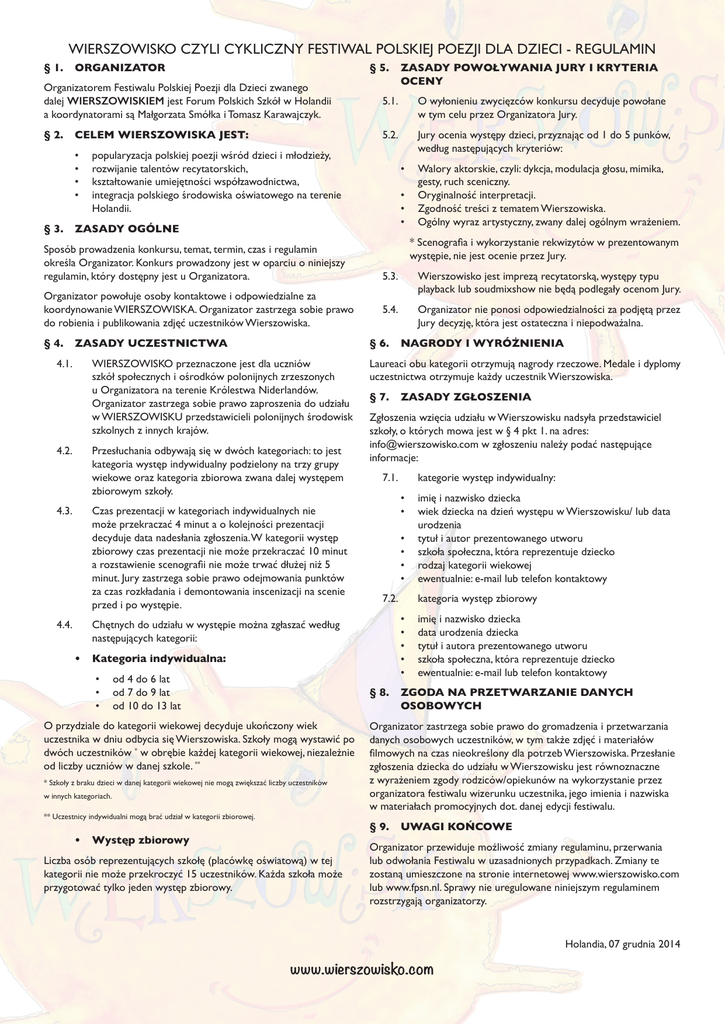Wierszowisko czyli cykliczny Festiwal Polskiej Poezji dla dzieci - regulamin § 1. ORGANIZATOR Organizatorem Festiwalu Polskiej Poezji dla Dzieci zwanego dalej WIERSZOWISKIEM jest Forum Polskich Szkół w Holandii a koordynatorami są Małgorzata Smółka i Tomasz Karawajczyk. § 2. CELEM WIERSZOWISKA JEST: • • • • § 5. ZASADY POWOŁYWANIA JURY I KRYTERIA OCENY 5.1. O wyłonieniu zwycięzców konkursu decyduje powołane w tym celu przez Organizatora Jury. 5.2. Jury ocenia występy dzieci, przyznając od 1 do 5 punków, według następujących kryteriów: popularyzacja polskiej poezji wśród dzieci i młodzieży, rozwijanie talentów recytatorskich, kształtowanie umiejętności współzawodnictwa, integracja polskiego środowiska oświatowego na terenie Holandii. • Walory aktorskie, czyli: dykcja, modulacja głosu, mimika, gesty, ruch sceniczny. • Oryginalność interpretacji. • Zgodność treści z tematem Wierszowiska. • Ogólny wyraz artystyczny, zwany dalej ogólnym wrażeniem. § 3. ZASADY OGÓLNE Sposób prowadzenia konkursu, temat, termin, czas i regulamin określa Organizator. Konkurs prowadzony jest w oparciu o niniejszy regulamin, który dostępny jest u Organizatora. Organizator powołuje osoby kontaktowe i odpowiedzialne za koordynowanie WIERSZOWISKA. Organizator zastrzega sobie prawo do robienia i publikowania zdjęć uczestników Wierszowiska. 4.2. 4.3. 4.4. 5.3. Wierszowisko jest imprezą recytatorską, występy typu playback lub soudmixshow nie będą podlegały ocenom Jury. 5.4. Organizator nie ponosi odpowiedzialności za podjętą przez Jury decyzję, która jest ostateczna i niepodważalna. § 6. NAGRODY I WYRÓŻNIENIA § 4. ZASADY UCZESTNICTWA 4.1. * Scenografia i wykorzystanie rekwizytów w prezentowanym występie, nie jest ocenie przez Jury. WIERSZOWISKO przeznaczone jest dla uczniów szkół społecznych i ośrodków polonijnych zrzeszonych u Organizatora na terenie Królestwa Niderlandów. Organizator zastrzega sobie prawo zaproszenia do udziału w WIERSZOWISKU przedstawicieli polonijnych środowisk szkolnych z innych krajów. Przesłuchania odbywają się w dwóch kategoriach: to jest kategoria występ indywidualny podzielony na trzy grupy wiekowe oraz kategoria zbiorowa zwana dalej występem zbiorowym szkoły. Czas prezentacji w kategoriach indywidualnych nie może przekraczać 4 minut a o kolejności prezentacji decyduje data nadesłania zgłoszenia. W kategorii występ zbiorowy czas prezentacji nie może przekraczać 10 minut a rozstawienie scenografii nie może trwać dłużej niż 5 minut. Jury zastrzega sobie prawo odejmowania punktów za czas rozkładania i demontowania inscenizacji na scenie przed i po występie. Chętnych do udziału w występie można zgłaszać według następujących kategorii: • Kategoria indywidualna: • od 4 do 6 lat • od 7 do 9 lat • od 10 do 13 lat Laureaci obu kategorii otrzymują nagrody rzeczowe. Medale i dyplomy uczestnictwa otrzymuje każdy uczestnik Wierszowiska. § 7. ZASADY ZGŁOSZENIA Zgłoszenia wzięcia udziału w Wierszowisku nadsyła przedstawiciel szkoły, o których mowa jest w § 4 pkt 1. na adres: [email protected] w zgłoszeniu należy podać następujące informacje: 7.1. kategorie występ indywidualny: • imię i nazwisko dziecka • wiek dziecka na dzień występu w Wierszowisku/ lub data urodzenia • tytuł i autor prezentowanego utworu • szkoła społeczna, która reprezentuje dziecko • rodzaj kategorii wiekowej • ewentualnie: e-mail lub telefon kontaktowy 7.2. kategoria występ zbiorowy • • • • • imię i nazwisko dziecka data urodzenia dziecka tytuł i autora prezentowanego utworu szkoła społeczna, która reprezentuje dziecko ewentualnie: e-mail lub telefon kontaktowy § 8. ZGODA NA PRZETWARZANIE DANYCH OSOBOWYCH O przydziale do kategorii wiekowej decyduje ukończony wiek uczestnika w dniu odbycia się Wierszowiska. Szkoły mogą wystawić po dwóch uczestników * w obrębie każdej kategorii wiekowej, niezależnie od liczby uczniów w danej szkole. ** * Szkoły z braku dzieci w danej kategorii wiekowej nie mogą zwiększać liczby uczestników w innych kategoriach. ** Uczestnicy indywidualni mogą brać udział w kategorii zbiorowej. Organizator zastrzega sobie prawo do gromadzenia i przetwarzania danych osobowych uczestników, w tym także zdjęć i materiałów filmowych na czas nieokreślony dla potrzeb Wierszowiska. Przesłanie zgłoszenia dziecka do udziału w Wierszowisku jest równoznaczne z wyrażeniem zgody rodziców/opiekunów na wykorzystanie przez organizatora festiwalu wizerunku uczestnika, jego imienia i nazwiska w materiałach promocyjnych dot. danej edycji festiwalu. § 9. UWAGI KOŃCOWE • Występ zbiorowy Liczba osób reprezentujących szkołę (placówkę oświatową) w tej kategorii nie może przekroczyć 15 uczestników. Każda szkoła może przygotować tylko jeden występ zbiorowy. Organizator przewiduje możliwość zmiany regulaminu, przerwania lub odwołania Festiwalu w uzasadnionych przypadkach. Zmiany te zostaną umieszczone na stronie internetowej www.wierszowisko.com lub www.fpsn.nl. Sprawy nie uregulowane niniejszym regulaminem rozstrzygają organizatorzy. Holandia, 07 grudnia 2014 www.wierszowisko.com