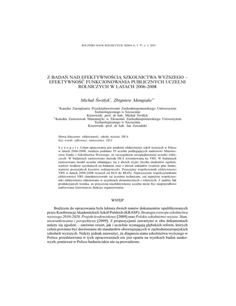 ROCZNIKI NAUK ROLNICZYCH, SERIA G, T. WY¯SZEGO 97, z. 3, 2010... Z BADAÑ NAD EFEKTYWNOCI¥ SZKOLNICTWA 269 Z BADAÑ NAD EFEKTYWNOCI¥ SZKOLNICTWA WY¯SZEGO EFEKTYWNOÆ FUNKCJONOWANIA PUBLICZNYCH UCZELNI ROLNICZYCH W LATACH 2006-2008 Micha³ wit³yk*, Zbigniew Mongia³o** Katedra Zarz¹dzania Przedsiêbiorstwami Zachodniopomorskiego Uniwersytetu Technologicznego w Szczecinie Kierownik: prof. dr hab. Micha³ wit³yk ** Katedra Zastosowañ Matematyki w Ekonomii Zachodniopomorskiego Uniwersytetu Technologicznego w Szczecinie Kierownik: prof. dr hab. Jan Zawadzki * S³owa kluczowe: efektywnoæ, szko³y wy¿sze, DEA Key words: efficiency, universities, DEA S y n o p s i s. Celem opracowania jest ustalenie efektywnoci szkó³ wy¿szych w Polsce w latach 2006-2008. Analizie poddano 59 uczelni podlegaj¹cych nadzorowi Ministerstwa Nauki i Szkolnictwa Wy¿szego, ze szczególnym uwzglêdnieniem uczelni rolniczych. W badaniach zastosowano metodê DEA zorientowan¹ na VRS. W badaniach zastosowano model uczelni sk³adaj¹cy siê z dwóch wyjæ (liczba studentów ogó³em, wartoæ rodków uzyskanych na badania) oraz z dwóch nak³adów (wartoæ p³ac brutto, wartoæ pozosta³ych kosztów rodzajowych). Przeciêtny wspó³czynnik efektywnoci VRS w latach 2006-2008 wynosi³ od 84,0 do 88,6%. Najwy¿szymi wspó³czynnikami efektywnoci VRS charakteryzowa³y siê uczelnie techniczne, za najni¿sze wspó³czynniki efektywnoci odnotowano w uczelniach ekonomicznych i rolniczych. Z analizy luk produkcyjnych wynika, ¿e przyczyn¹ nieefektywnoci uczelni mo¿e byæ nieprawid³owo realizowana kierownicza funkcja organizowania. WSTÊP Bodcem do opracowania by³a lektura dwóch tomów dokumentów opublikowanych przez Konferencjê Akademickich Szkó³ Polskich (KRASP): Strategia rozwoju szkolnictwa wy¿szego 2010-2020. Projekt rodowiskowy [2009] oraz Polskie szkolnictwo wy¿sze. Stan, uwarunkowania i perspektywy [2009]. Z propozycjami zawartymi w obu dokumentach nale¿y siê zgodziæ zarówno resort, jak i uczelnie wymagaj¹ g³êbokich reform, których celem powinno byæ dorównanie do standardów obowi¹zuj¹cych w zachodnioeuropejskich szko³ach wy¿szych. Nale¿y jednak zauwa¿yæ, ¿e diagnoza stanu szkolnictwa wy¿szego w Polsce przedstawiona w tych opracowaniach nie jest oparta na wynikach badañ naukowych, poniewa¿ w Polsce badania takie nie s¹ prowadzone. 270 M. WIT£YK, Z. MONGIA£O W obu opracowaniach s³ów o rdzeniu s³owotwórczym efektywn- u¿yto 158 razy, w tym w Strategii 57 razy, a s³ów o rdzeniu s³owotwórczym produktywn- u¿yto 9 razy, w tym w Strategii 4 razy. S³ów efektywnoæ i produktywnoæ u¿ywano w ró¿nych kontekstach: dotycz¹cych resortu nauki albo uczelni (efektywnoæ naukowa, produktywnoæ) lub jednostki (pracownika naukowo-dydaktycznego). Np.: Produktywnoæ dzia³alnoci naukowo-badawczej szkolnictwa wy¿szego zostanie podniesiona do poziomu krajów rozwiniêtych o zbli¿onym PKB [Strategia..., s. 65]. Efektywnoæ dzia³alnoci naukowobadawczej pracownika naukowego szkolnictwa wy¿szego zostanie podniesiona do poziomu redniej efektywnoci w krajach rozwiniêtych [Strategia , s. 65]. Autorzy opracowania proponuj¹ poprawê zarz¹dzania na dwóch poziomach: ministerstwa i uczelni. Dla ministerstwa proponowana jest poprawa zdolnoci mened¿erskich, które obejmuj¹ zdolnoci ministerstwa do opracowania polityki [Strategia..., s. 47]. W uczelniach natomiast nale¿y stosowaæ tak¿e inne narzêdzia, usytuowane ni¿ej w hierarchii, tak aby mog³y byæ one u¿yte szybko i efektywnie chodzi o znowelizowane rozporz¹dzenia, zmiany statutowe, instrumentarium ekonomiczne; nale¿y tak¿e uwzglêdniæ kodeksy etyczne oraz kodeks dobrych praktyk szkó³ wy¿szych, og³oszony przez KRASP w 2007 roku i przyjêty przez wiêkszoæ uczelni akademickich [Strategia..., s. 16]. S³uszna jest te¿ uwaga, ¿e po rozwi¹zania ustawowe nale¿y jednak siêgaæ w ostatecznoci, tam gdzie to jest naprawdê niezbêdne [Strategia..., s. 16]. Nale¿y postawiæ pytanie, dlaczego w chwili obecnej organy szkó³ wy¿szych nie korzystaj¹ z mo¿liwoci racjonalnego kszta³towania swoich struktur organizacyjnych w celu usprawnienia funkcjonowania szkó³ wy¿szych. Odpowied na to pytanie zamieszczona zosta³a w Strategii i brzmi: Kluczem wielu z nich [zmian przyp. autorów] jest poprawa zdolnoci mened¿erskich w³adz uczelni, co koresponduje z opini¹ ministerstwa o zarz¹dzaniu uczelniami, zamieszczon¹ w za³o¿eniach do nowelizacji ustawy Prawo o szkolnictwie wy¿szym oraz ustawy o stopniach naukowych [Strategia..., s.16]. Wed³ug tej opinii: Polskie uczelnie s¹ zarz¹dzane tradycyjnie, w sposób demokratyczny (elekcyjny), co powoduje, ¿e zarz¹dzanie uczelni¹ z natury rzeczy ma charakter zachowawczy i jest wypadkow¹ niestabilnych kompromisów pomiêdzy ró¿nymi, np. wydzia³owymi rodowiskami i grupami interesu [Za³o¿enia..., s.17]. Problematyka racjonalnoci wydatkowania rodków publicznych na funkcjonowanie uczelni publicznych jest rzadko podejmowana przez badaczy i resort nauki. Dominuje opinia, ¿e funduszy publicznych jest za ma³o i ¿e nie s¹ podejmowane próby racjonalizacji przydzia³u i wydatkowania rodków. Celem pracy jest zbadanie efektywnoci szkolnictwa wy¿szego przy zastosowaniu metody DEA oraz okrelenie luk produkcyjnych, ze szczególnym uwzglêdnieniem publicznych uczelni rolniczych. Za granic¹ badaniem efektywnoci uczelni za pomoc¹ DEA zajmowali siê m.in.: Taesik Ahn i wspó³autorzy [1988], Jill Johnes i Geraint Johnes [1995], Malcolm Abbott, Chris Doucouliagos [2003], Antonio Afonso, Mariana Santos [2004, 2005], Jill Johnes [2006], Jill Johnes i Li Yu [2008], Chiang Kao i Hsi-Tai Hung [2008], Ying Chu Ng i Sung-ko Li [2009]. W Polsce badania takie prowadzone by³y przez Ewê Kaniê [1998], Andrzeja Suwarzyñskiego [2006a, 2006b], Wies³awa Pasewicza i wspó³autorów [2009]. Z BADAÑ NAD EFEKTYWNOCI¥ SZKOLNICTWA WY¯SZEGO ... 271 FAKTOGRAFIA I METODY BADAÑ Badaniami objêto próbê uc