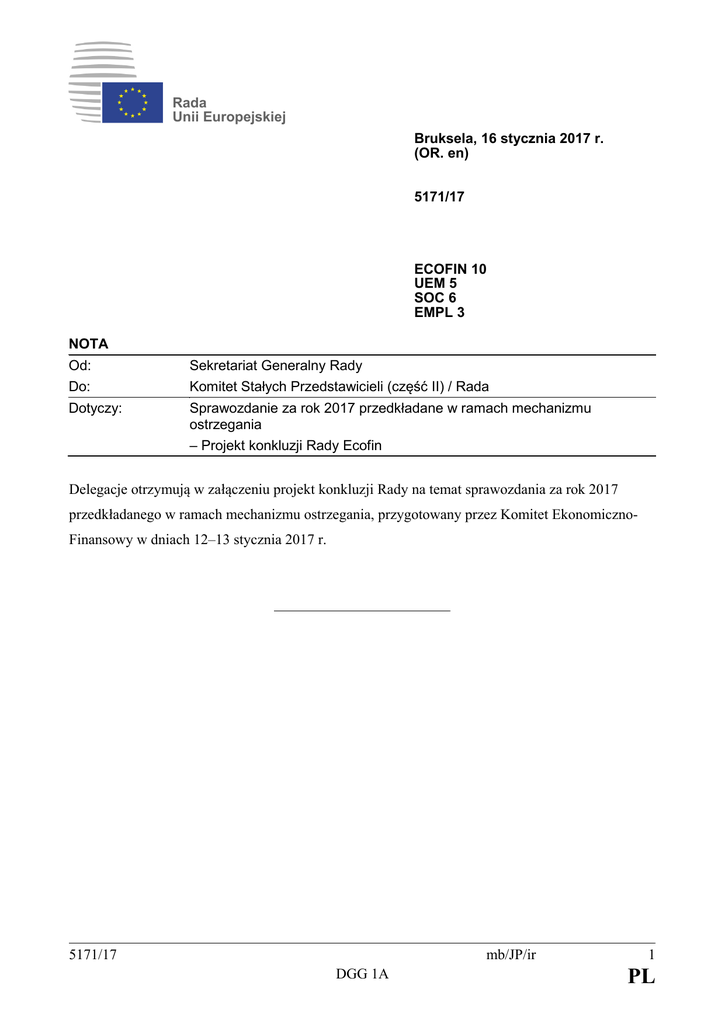 Rada Unii Europejskiej Bruksela, 16 stycznia 2017 r. (OR. en) 5171/17 ECOFIN 10 UEM 5 SOC 6 EMPL 3 NOTA Od: Do: Sekretariat Generalny Rady Komitet Stałych Przedstawicieli (część II) / Rada Dotyczy: Sprawozdanie za rok 2017 przedkładane w ramach mechanizmu ostrzegania – Projekt konkluzji Rady Ecofin Delegacje otrzymują w załączeniu projekt konkluzji Rady na temat sprawozdania za rok 2017 przedkładanego w ramach mechanizmu ostrzegania, przygotowany przez Komitet EkonomicznoFinansowy w dniach 12–13 stycznia 2017 r. 5171/17 mb/JP/ir DGG 1A 1 PL Sprawozdanie za rok 2017 przedkładane w ramach mechanizmu ostrzegania – Projekt konkluzji Rady Ecofin – Rada (Ecofin): 1. Z ZADOWOLENIEM PRZYJMUJE szóste sprawozdanie Komisji przedkładane w ramach mechanizmu ostrzegania, będące punktem wyjścia corocznej procedury dotyczącej zakłóceń równowagi makroekonomicznej w kontekście europejskiego semestru 2017. 2. ZASADNICZO ZGADZA SIĘ z przeprowadzoną przez Komisję analizą horyzontalną dotyczącą korekty zakłóceń równowagi makroekonomicznej w UE i w strefie euro. Z ZADOWOLENIEM PRZYJMUJE dalsze postępy poczynione przez państwa członkowskie w zakresie korygowania ich zakłóceń równowagi, co przyczynia się do przywracania równowagi w UE i w strefie euro. ODNOTOWUJE stałe, lecz wciąż umiarkowane ożywienie gospodarcze i niską inflację, które nadal utrudniają zmniejszanie zakłóceń równowagi i zwiększają ryzyka makroekonomiczne. PODKREŚLA, że mimo oznak poprawy, wyzwania i ryzyka pozostają zasadniczo niezmienione, oraz że konieczne są dalsze postępy w działaniach w ramach polityki w celu wyeliminowania zakłóceń równowagi, zwłaszcza wysokich poziomów zadłużenia w kontekście obniżającego się wzrostu produktu potencjalnego i wydajności oraz utrzymujących się rekordowo wysokich stóp bezrobocia. Jednocześnie nadal odnotowuje się wysokie nadwyżki na rachunku obrotów bieżących w niektórych państwach członkowskich strefy euro o stosunkowo niskim zapotrzebowaniu na zmniejszanie zadłużenia; nadwyżki te w pewnych okolicznościach mogą wskazywać na duże zakłócenia równowagi w zakresie oszczędności i inwestycji i mogą wymagać postępów w działaniach w ramach polityki. ODNOTOWUJE, że przywracanie równowagi z deficytu do nadwyżki w wielu państwach strefy euro w połączeniu z trwałymi i wysokimi nadwyżkami w innych oznaczało asymetryczne dostosowanie prowadzące do znacznej i stale rosnącej nadwyżki strefy euro jako całości; skutki takiego zjawiska zasługują na dalszą uwagę. Ogólnie ZGADZA SIĘ, że konieczne są dalsze zdecydowane reformy służące promowaniu inwestycji i uwolnieniu potencjału wzrostu. 5171/17 mb/JP/ir DGG 1A 2 PL 3. ODNOTOWUJE podstawową weryfikację ekonomiczną przedstawioną przez Komisję w sprawozdaniu przedkładanym w ramach mechanizmu ostrzegania. UZNAJE, że potrzebna jest dalsza analiza – za pomocą szczegółowych ocen sytuacji – rozwoju bieżących wydarzeń w 13 państwach członkowskich, w których w ostatnim roku stwierdzono zakłócenia równowagi, by ocenić, czy występujące tam zakłócenia równowagi zmniejszają się, utrzymują, czy zaostrzają, przy uwzględnieniu wdrożenia odpowiednich środków służących wyeliminowaniu tych zakłóceń równowagi, w tym środków wcześniej zalecanych w kontekście europejskiego semestru. ZAUWAŻA, że w niektórych państwach członkowskich, w odniesieniu do których nie zaleca się szczegółowych ocen sytuacji na tym etapie, utrzymują się pewne słabe punkty i konieczne będzie monitorowanie rozwoju sytuacji w tym zakresie. 4. Z ZADOWOLENIEM PRZYJMUJE zamiar Komisji dotyczący opublikowania w lutym szczegółowych ocen sytuacji zawartych w sprawozdaniach dotyczących poszczególnych krajów: oceny te obejmują również przeprowadzane przez Komisję dodatkowe analizy w zakresie innych kwestii strukturalnych istotnych dla europejskiego semestru. PODKREŚLA, że należy skupić się na stawianiu czoła najpoważniejszym wyzwaniom, takim jak wysoki poziom zadłużenia prywatnego i zagranicznego, słaba konkurencyjność i niski potencjalny wzrost gospodarczy, ryzyka związane z rosnącymi cenami nieruchomości, nadwyżki i deficyty na rachunku obrotów bieżących, problemy dostosowawcze znajdujące odzwierciedlenie w wysokim bezrobociu, a jednoczenie wyraźnie rozróżniać odmienne wyzwania stojące przed poszczególnymi państwami członkowskimi pod względem źródeł i stopni ryzyk, tak by wyodrębnić wyraźne priorytety i zapewnić sprawne działanie. ZAZNACZA, że należy w pełni wykorzystać potencjał procedury dotyczącej zakłóceń równowagi makroekonomicznej, przy zastosowaniu w odpowiednich przypadkach części naprawczej paktu stabilności i wzrostu. 5. Z ZADOWOLENIEM PRZYJMUJE opublikowanie przez Komisję kompendium na temat procedury dotyczącej zakłóceń równowagi makroekonomicznej, w którym w zarysie przedstawiono sposób działania tej procedury oraz zmiany, jakie zachodziły w jej stosowaniu na przestrzeni lat. PODKREŚLA, że przejrzystość i przewidywalność procedury dotyczącej zakłóceń równowagi makroekonomicznej, w szczególności utrzymanie bieżących kategorii zakłóceń, ma zasadnicze znaczenie dla zapewnienia odpowiedzialności państw członkowskich za tę procedurę, co z kolei ma kluczowe znaczenie dla jej skuteczności. KŁADZIE NACISK na 5171/17 mb/JP/ir DGG 1A 3 PL potrzebę kontynuowania prac technicznych z myślą o ocenie adekwatności tablicy wyników oraz dalszym rozwijaniu i udoskonalaniu narzędzi analitycznych i ram służących ocenie zmian sytuacji i czynników przyczyniających się do narastania i eliminowania zakłóceń równowagi oraz związanych z nimi efektów mnożnikowych, tak aby jeszcze bardziej poprawić jakość analiz i rezultatów będących podstawą tablicy wyników. 6. UWAŻA, że szczególne monitorowanie w ramach procedury dotyczącej zak