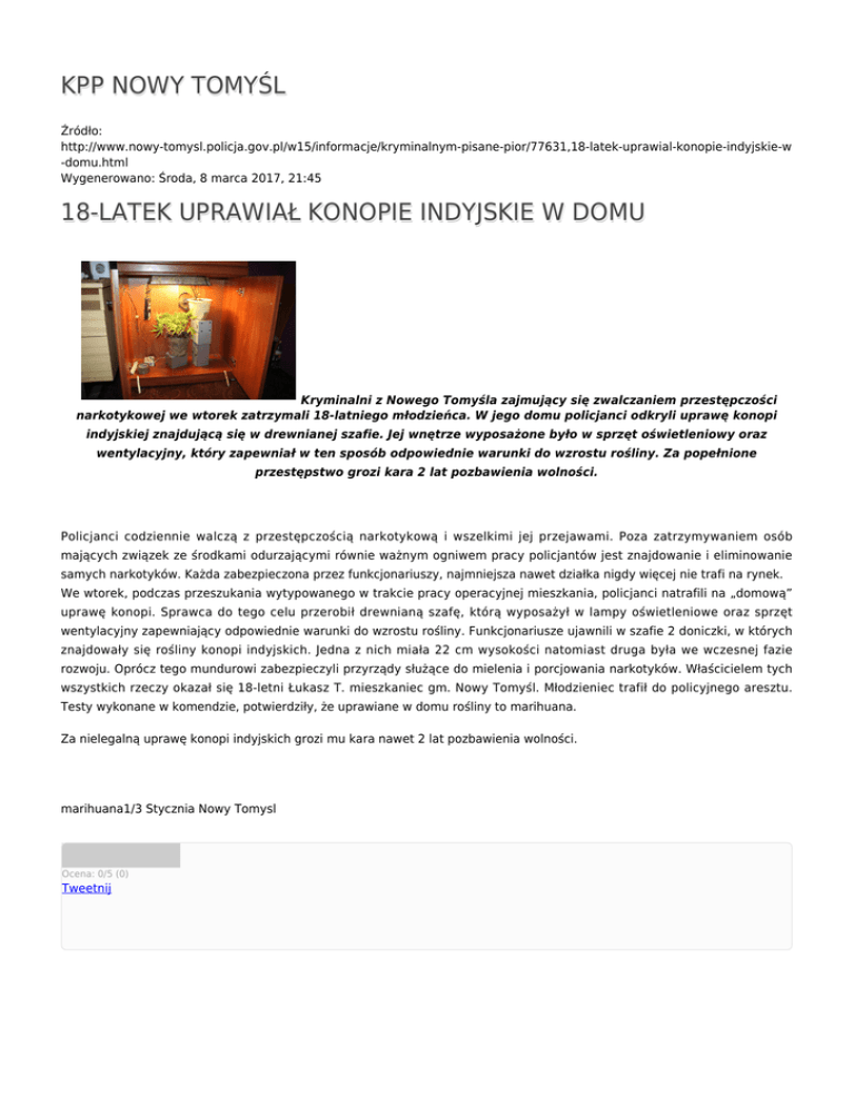 KPP NOWY TOMYŚL Źródło: http://www.nowy-tomysl.policja.gov.pl/w15/informacje/kryminalnym-pisane-pior/77631,18-latek-uprawial-konopie-indyjskie-w -domu.html Wygenerowano: Środa, 8 marca 2017, 21:45 18-LATEK UPRAWIAŁ KONOPIE INDYJSKIE W DOMU Kryminalni z Nowego Tomyśla zajmujący się zwalczaniem przestępczości narkotykowej we wtorek zatrzymali 18-latniego młodzieńca. W jego domu policjanci odkryli uprawę konopi indyjskiej znajdującą się w drewnianej szafie. Jej wnętrze wyposażone było w sprzęt oświetleniowy oraz wentylacyjny, który zapewniał w ten sposób odpowiednie warunki do wzrostu rośliny. Za popełnione przestępstwo grozi kara 2 lat pozbawienia wolności. Policjanci codziennie walczą z przestępczością narkotykową i wszelkimi jej przejawami. Poza zatrzymywaniem osób mających związek ze środkami odurzającymi równie ważnym ogniwem pracy policjantów jest znajdowanie i eliminowanie samych narkotyków. Każda zabezpieczona przez funkcjonariuszy, najmniejsza nawet działka nigdy więcej nie trafi na rynek. We wtorek, podczas przeszukania wytypowanego w trakcie pracy operacyjnej mieszkania, policjanci natrafili na „domową” uprawę konopi. Sprawca do tego celu przerobił drewnianą szafę, którą wyposażył w lampy oświetleniowe oraz sprzęt wentylacyjny zapewniający odpowiednie warunki do wzrostu rośliny. Funkcjonariusze ujawnili w szafie 2 doniczki, w których znajdowały się rośliny konopi indyjskich. Jedna z nich miała 22 cm wysokości natomiast druga była we wczesnej fazie rozwoju. Oprócz tego mundurowi zabezpieczyli przyrządy służące do mielenia i porcjowania narkotyków. Właścicielem tych wszystkich rzeczy okazał się 18-letni Łukasz T. mieszkaniec gm. Nowy Tomyśl. Młodzieniec trafił do policyjnego aresztu. Testy wykonane w komendzie, potwierdziły, że uprawiane w domu rośliny to marihuana. Za nielegalną uprawę konopi indyjskich grozi mu kara nawet 2 lat pozbawienia wolności. marihuana1/3 Stycznia Nowy Tomysl Ocena: 0/5 (0) Tweetnij
