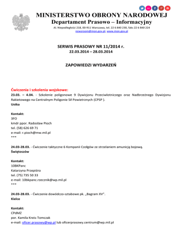MINISTERSTWO OBRONY NARODOWEJ Departament Prasowo – Informacyjny Al. Niepodległości 218, 00-911 Warszawa, tel. 22 6 840 230, faks 22 6 840 224 [email protected], www.mon.gov.pl SERWIS PRASOWY NR 11/2014 r. 22.03.2014 – 28.03.2014 ZAPOWIEDZI WYDARZEŃ Ćwiczenia i szkolenia wojskowe: 23.03. – 4.04. - Szkolenie poligonowe 9 Dywizjonu Przeciwlotniczego oraz Nadbrzeżnego Dywizjonu Rakietowego na Centralnym Poligonie Sił Powietrznych (CPSP ). Ustka Kontakt: 3FO kmdr ppor. Radosław Pioch tel. (58) 626 69 71 e-mail: [email protected] *** 24.03-28.03. - Ćwiczenie taktyczne 6 Kompanii Czołgów ze strzelaniem amunicją bojową. Świętoszów Kontakt: 10BKPanc Katarzyna Przepióra tel. (75) 735 50 33 e-mail: [email protected] *** 24.03-28.03. - Ćwiczenie dowódczo-sztabowe pk. „Bagram XV”. Kielce Kontakt: CPdMZ por. Kamila Kreis-Tomczak e-mail: [email protected] lub [email protected] 24.03-4.04. - Zintegrowane szkolenie bojowe 8 Dywizjonu Przeciwlotniczego. CPSP Ustka Kontakt: 8FOW kmdr ppor. Jacek Kwiatkowski tel. 661 417 739 e-mail: [email protected] *** 26.03-4.04. - Szkolenie żołnierzy rezerwy 8 Dywizjonu Przeciwlotniczego. CPSP Ustka Kontakt: 8FOW kmdr ppor. Jacek Kwiatkowski tel. 661 417 739 e-mail: [email protected] 26 marca 2014 (środa ), godz. 10.00 Odprawa kierowniczej kadry MON i SZ RP W Sztabie Generalnym WP odbędzie się doroczna odprawa rozliczeniowo-koordynacyjna kadry kierowniczej MON i SZ RP, której gospodarzem będzie minister Tomasz Siemoniak. W pierwszej części odprawy uczestniczyć będzie Prezydent Rzeczypospolitej Polskiej Bronisław Komorowski. Obsługa medialna wyłącznie dla osób akredytowanych. Akredytacje prowadzi Departament Prasowo – Informacyjny MON. Zgłoszenie akredytacyjne (nazwa redakcji, imię i nazwisko, PESEL, imię ojca, nr telefonu, marka i numer wozu transmisyjnego) należy przesłać do 23 marca br. (niedziela) do godz. 20.00, na adres e-mail: [email protected] Warszawa, (ul. Rakowiecka 4a) Kontakt: Departament Prasowo –Informacyjny MON tel. (22) 6 840 230 e-mail: [email protected] 26-27 marca 2014 (środa - czwartek ) Sprawdzian dla NSR Egzamin po zakończeniu szkolenia podstawowego żołnierzy pierwszego w 2014 roku turnusu służby przygotowawczej do Narodowych Sił Rezerwowych. CSŁiI Zegrze Kontakt: CSŁiI kpt. Krzysztof Baran tel. 722-380-054 e-mail: [email protected] Współzawodnictwo żołnierzy 26.03-28.03. - Zawody użyteczno-bojowe pododdziałów rozpoznawczych 11 Dywizji Kawalerii Pancernej. Świętoszów Kontakt: 10BKPanc Katarzyna Przepióra tel. (75) 735 50 33 e-mail: [email protected] *** 27.03. – 28.03. – Zawody plutonów zmechanizowanych 11 Dywizji Kawalerii Pancernej. 27.03.2014r. – strzelania 28.03.2014r. – pętla taktyczna Wędrzyn Kontakt: chor. Rafał Mniedło tel. 609 874 405 e-mail: [email protected] 27 marca 2014 (czwartek), godz. 9.00 Ogólnopolska konferencja naukowa Pod patronatem ministra obrony narodowej odbędzie się konferencja pt. „Polityczno-wojskowe implikacje członkostwa Polski w NATO z perspektywy 15-lecia obecności w strukturach Sojuszu”. Więcej… Warszawa (Centrum Konferencyjne MON) Kontakt: Rzecznik prasowy AON Magdalena Rochnowska tel. 608 023 401 e-mail: [email protected] 28 marca 2014 (piątek) 69. rocznica zakończenia walk o Trójmiasto 69 lat temu toczyły się ciężkie boje pomiędzy wojskami niemieckimi, a radzieckimi i polskimi o wyzwolenie Trójmiasta. Jako pierwszy wyzwolony został Sopot (23 marca), następnie Gdynia - 28 marca i dzień później Gdańsk. Port Wojenny Gdynia Kontakt: 3FO kmdr ppor. Radosław Pioch tel. (58) 626 69 71 e-mail: [email protected] 28 marca 2014 (piątek) Święto 23 Śląskiego Pułku Artylerii Żołnierze i pracownicy wezmą udział w obchodach święta bolesławieckiego pułku. Bolesławiec Kontakt: 23SPA mjr Jerzy Juchaniuk tel. 669 941 439 e-mail: [email protected] KRONIKA 14 marca 2014 ( piątek) Tomasz Siemoniak o przyszłości Sojuszu We wrześniu w Wielkiej Brytanii odbędzie się szczyt NATO. Postaramy się tam odpowiedzieć na pytania, jak Sojusz ma wyglądać do 2020 roku. Polskie postulaty są jasne. Oczekujemy, że NATO będzie skoncentrowane na przygotowywaniu się do obrony swoich członków – mówi Tomasz Siemoniak, minister obrony narodowej. Więcej… 14 marca 2014 ( piątek) Sejm uchwalił zmiany w NSR Służba w Narodowych Siłach Rezerwowych będzie atrakcyjniejsza. W piątek, podczas posiedzenia Sejmu RP, posłowie uchwalili zmiany w rządowym projekcie ustawy o zmianie ustawy o powszechnym obowiązku obrony Rzeczypospolitej Polskiej oraz zmianie ustawy o uposażeniu żołnierzy niezawodowych oraz niektórych innych ustaw. Więcej… 14 marca 2014 ( piątek) Minister obrony na spotkaniu Grupy Wyszehradzkiej To, co robimy w ramach Grupy Wyszehradzkiej (V4), jest mocnym impulsem również do działań UE i NATO - powiedział minister obrony narodowej Tomasz Siemoniak podczas spotkania z ministrami obrony V4. Więcej:… 17 marca 2014 ( poniedziałek) Sukces modernizacji armii szansą dla zbrojeniówki "Konsolidacja przemysłu to długo oczekiwana i potrzebna decyzja. Potrzebujemy silnego partnera na rynku przemysłu zbrojeniowego. Wojsko będzie wymagającym klientem. Będziemy preferowali polski przemysł, ale wysokiej jakości - mówił minister obrony narodowej Tomasz Siemoniak podczas konferencji naukowej. Więcej… 18 marca 2014 ( wtorek) Polsko-estońskie rozmowy o współpracy wojskowej Sytuacja bezpieczeństwa w regionie oraz relacje bilateralne – to główne tematy rozmowy ministra obrony narodowej Tomasza Siemoniaka z przebywającym w Polsce ministrem obrony Estonii Urmasem Reinsalu. Więcej: 19 marca 2014 ( środa) Konwent dziekanów: Chcemy wspólnie tworzyć prawo „Dziękuję za Waszą dotychczasową działalność. Zaprezentowali Państwo przykład dobrej współpracy. Ustawa pragmatyczna to Wasz wkład – to Wy wypracowaliście jej zapisy, przy współpracy z ministerstwem” – powie