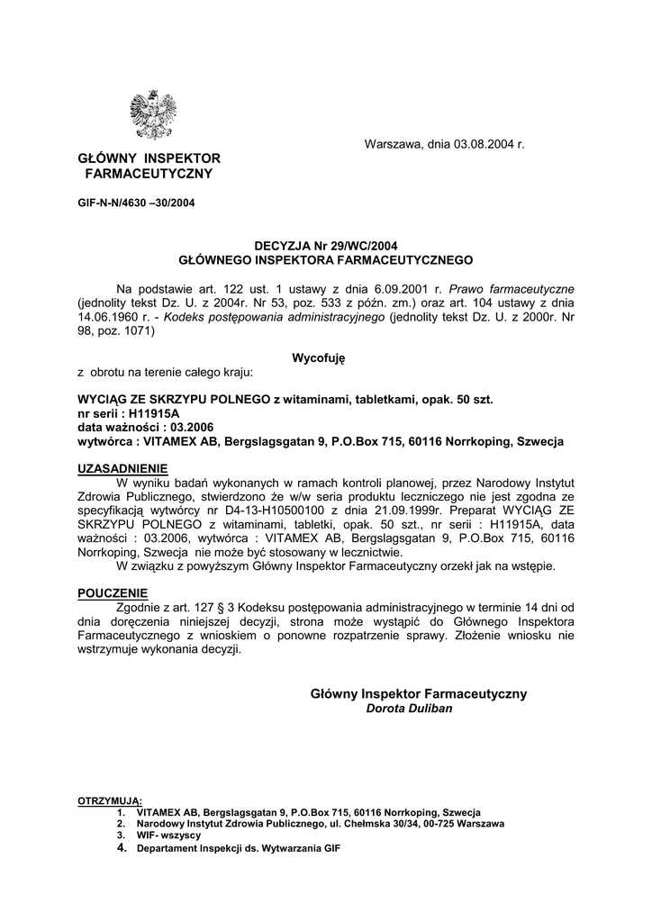 Warszawa, dnia 03.08.2004 r. GŁÓWNY INSPEKTOR FARMACEUTYCZNY GIF-N-N/4630 –30/2004 DECYZJA Nr 29/WC/2004 GŁÓWNEGO INSPEKTORA FARMACEUTYCZNEGO Na podstawie art. 122 ust. 1 ustawy z dnia 6.09.2001 r. Prawo farmaceutyczne (jednolity tekst Dz. U. z 2004r. Nr 53, poz. 533 z późn. zm.) oraz art. 104 ustawy z dnia 14.06.1960 r. - Kodeks postępowania administracyjnego (jednolity tekst Dz. U. z 2000r. Nr 98, poz. 1071) Wycofuję z obrotu na terenie całego kraju: WYCIĄG ZE SKRZYPU POLNEGO z witaminami, tabletkami, opak. 50 szt. nr serii : H11915A data ważności : 03.2006 wytwórca : VITAMEX AB, Bergslagsgatan 9, P.O.Box 715, 60116 Norrkoping, Szwecja UZASADNIENIE W wyniku badań wykonanych w ramach kontroli planowej, przez Narodowy Instytut Zdrowia Publicznego, stwierdzono że w/w seria produktu leczniczego nie jest zgodna ze specyfikacją wytwórcy nr D4-13-H10500100 z dnia 21.09.1999r. Preparat WYCIĄG ZE SKRZYPU POLNEGO z witaminami, tabletki, opak. 50 szt., nr serii : H11915A, data ważności : 03.2006, wytwórca : VITAMEX AB, Bergslagsgatan 9, P.O.Box 715, 60116 Norrkoping, Szwecja nie może być stosowany w lecznictwie. W związku z powyższym Główny Inspektor Farmaceutyczny orzekł jak na wstępie. POUCZENIE Zgodnie z art. 127 § 3 Kodeksu postępowania administracyjnego w terminie 14 dni od dnia doręczenia niniejszej decyzji, strona może wystąpić do Głównego Inspektora Farmaceutycznego z wnioskiem o ponowne rozpatrzenie sprawy. Złożenie wniosku nie wstrzymuje wykonania decyzji. Główny Inspektor Farmaceutyczny Dorota Duliban OTRZYMUJĄ: 1. VITAMEX AB, Bergslagsgatan 9, P.O.Box 715, 60116 Norrkoping, Szwecja 2. Narodowy Instytut Zdrowia Publicznego, ul. Chełmska 30/34, 00-725 Warszawa 3. WIF- wszyscy 4. Departament Inspekcji ds. Wytwarzania GIF