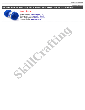Informacje o produkcie Utworzono 08-03-2017 Włóczka Angora Ram 100g (40% moher, 60% akryl), 500 m, 152 niebieski Cena : 8,39 zł Sk ill C ra ft in g Nr katalogowy : angora.ram.152 Dostępność : Dostępność - 3 dni Stan magazynowy : bardzo wysoki Średnia ocena : brak recenzji