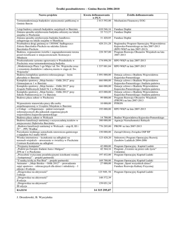 Środki pozabudżetowe – Gmina Barcin 2006-2010 Nazwa projektu Termomodernizacja budynków użyteczności publicznej w Gminie Barcin I etap budowy czterech budynków socjalnych w Barcinie Zmiana sposobu użytkowania budynku orkiestry na lokale socjalne w Piechcinie Zmiana sposobu użytkowania budynku handlowousługowego na lokale socjalne w Mamliczu Przebudowa drogi gminnej nr 130304C SadłogoszczZalesie Barcińskie-Piechcin na odcinku Zalesie Barcińskie-Piechcin Budowa, wyposażenie świetlic i zagospodarowanie terenu przed świetlicami w miejscowościach: Krotoszyn i Młodocin Przekształcenie systemu ogrzewania w Przedszkolu w Piechcinie wraz termomodernizacją budynku „Modernizacja Placu 1-go Maja i ul. Św. Wojciecha wraz z remontem chodników i odnową mostu w ciągu ul. Św. Wojciecha” Budowa kompleksu sportowo-rekreacyjnego – kryta pływalnia w Barcinie Kompleks sportowy „Moje boisko – Orlik 2012” przy Gimnazjum nr 1 w Barcinie Kompleks sportowy „Moje boisko – Orlik 2012” przy Zespole Publicznych Szkół Nr 1 w Piechcinie Kompleks sportowy „Moje boisko – Orlik 2012” przy Szkole Podstawowej nr 1 w Barcinie Budowa placu zabaw w Piechcinie Wyposażenie stanowiska pracy dla osoby niepełnosprawnej w Urzędzie Miejskim w Barcinie e-Usługi – e-Organizacja – pakiet rozwiązań informatycznych dla jednostek organizacyjnych województwa kujawsko-pomorskiego Budowa placu zabaw w Wolicach Budowa kanalizacji sanitarnej z oczyszczalnią ścieków w miejscowości Dąbrówka Barcińska „Budowa kanalizacji sanitarnej w Wolicach – etap II, III i IV” – PPU Wodbar Pozyskanie średniego samochodu ratowniczo-gaśniczego z napędem 4x2 marki MAN Wioska internetowa – kształcenie na odległość na terenach wiejskich – utworzenie w świetlicy w Piechcinie Centrum Kształcenia na odległość ‘Przyjazny komputer” „Podróż po Europie śladami Jasia i Małgosi” ZPS nr 1 w Piechcinie „Przyszłość wytyczana pozalekcyjnymi ścieżkami wiedzy i kompetencji” – projekt partnerski "Z nauką ścisłą za Pan Brat" – projekt partnerski Animator - „Moje Boisko – Orlik 2012” – prowadzenie zajęć sportowo – rekreacyjnych dla dzieci i młodzieży – I edycja i II edycja „Drogowskaz na aktywność” I edycja „Drogowskaz na aktywność” II edycja „Drogowskaz na aktywność” III edycja RAZEM J. Drozdowski, B. Wyszyńska Kwota dofinansowania w PLN 2 813 592,00 Źródło dofinansowania Mechanizm Finansowy EOG 610 546,16 33 715,57 Fundusz Dopłat Fundusz Dopłat 31 420,05 Fundusz Dopłat 428 231,28 228 587,00 Regionalny Program Operacyjny Województwa Kujawsko-Pomorskiego na lata 2007-2013 (RPO WKP na lata 2007-2013) Program Rozwoju Obszarów Wiejskich na lata 2007-2013 174 898,50 RPO WKP na lata 2007-2013 1 537 881,84 RPO WKP na lata 2007-2013 3 891 000,00 Dotacja celowa z Budżetu Województwa Kujawsko-Pomorskiego Dotacje celowe z Budżetu Województwa Kujawsko-Pomorskiego i budżetu państwa Dotacje celowe z Budżetu Województwa Kujawsko-Pomorskiego i budżetu państwa Dotacje celowe z Budżetu Województwa Kujawsko-Pomorskiego i budżetu państwa Program Rozwoju Obszarów Wiejskich (PROW) na lata 2007-2013 PFRON 666 000,00 666 000,00 653 000,00 99 000,00 10 000,00 195 000,00 RPO WKP na lata 2007-2013 14 700,00 300 000,00 Budżet Województwa Kujawsko-Pomorskiego Agencja Nieruchomości Rolnych 776 205,00 PROW na lata 2007-2013 150 000,00 Zarząd Główny Związku OSP RP 123 428,20 Sektorowy Program Operacyjny Rozwój Zasobów Ludzkich 2004-2006 42 000,00 42 364,16 Program Operacyjny Kapitał Ludzki Program „Uczenie się przez całe życie” Comenius Program Operacyjny Kapitał Ludzki 197 452,00 169 700,00 27 000,00 Program Operacyjny Kapitał Ludzki Program „Sport wszystkich dzieci” Fundusz Rozwoju Kultury Fizycznej 125 949, 58 Program Operacyjny Kapitał Ludzki 148 572,39 159 051,34 14 315 295,07
